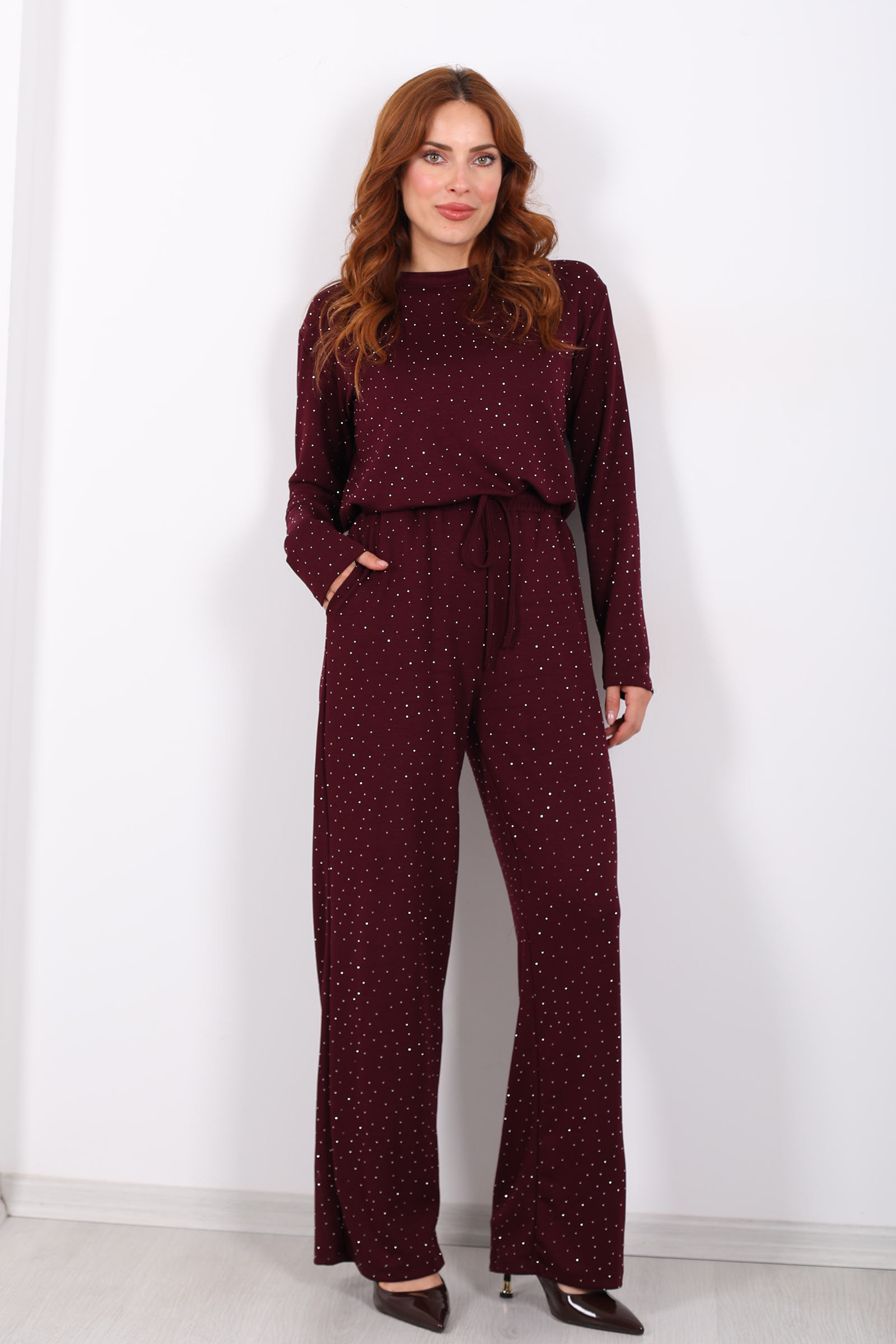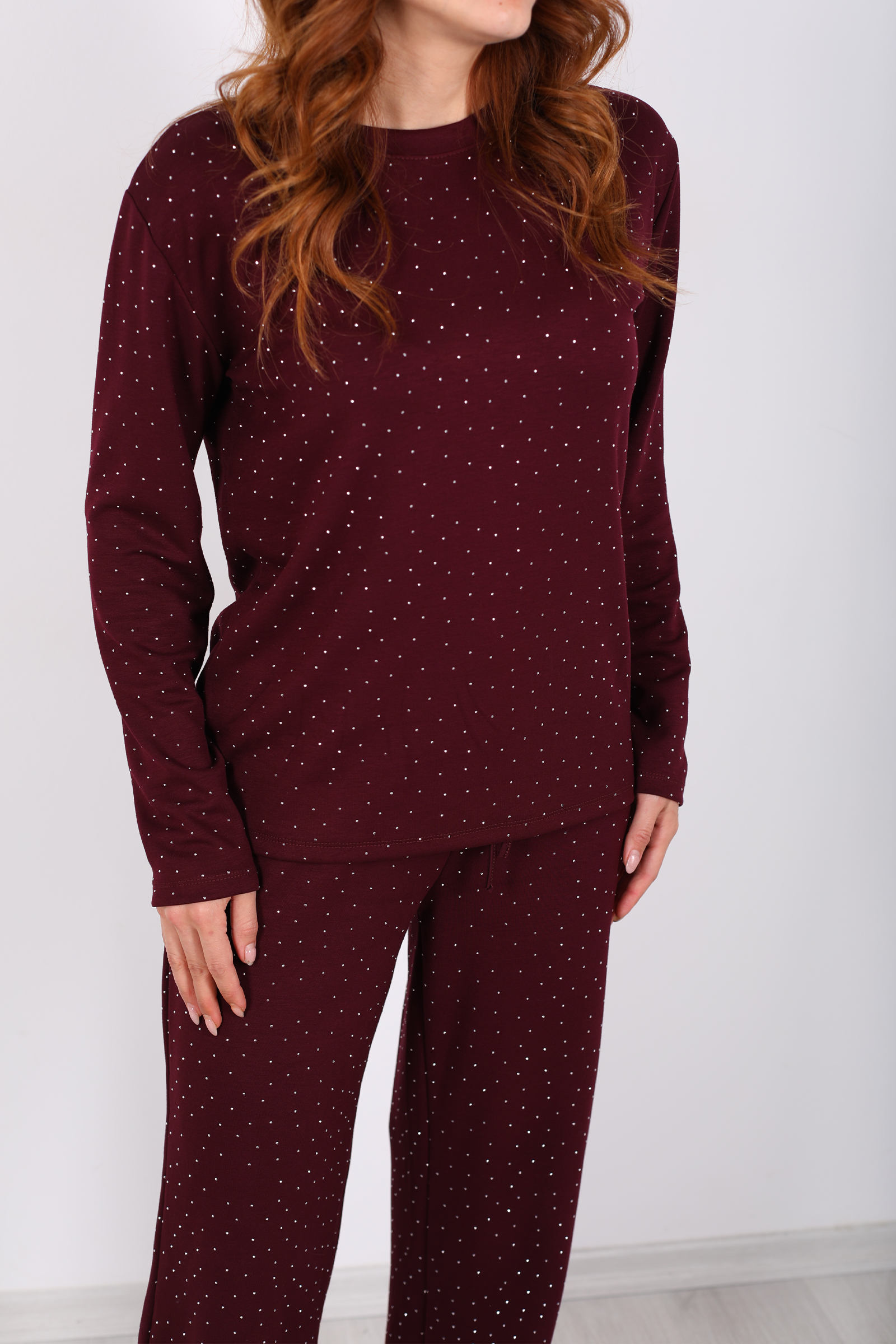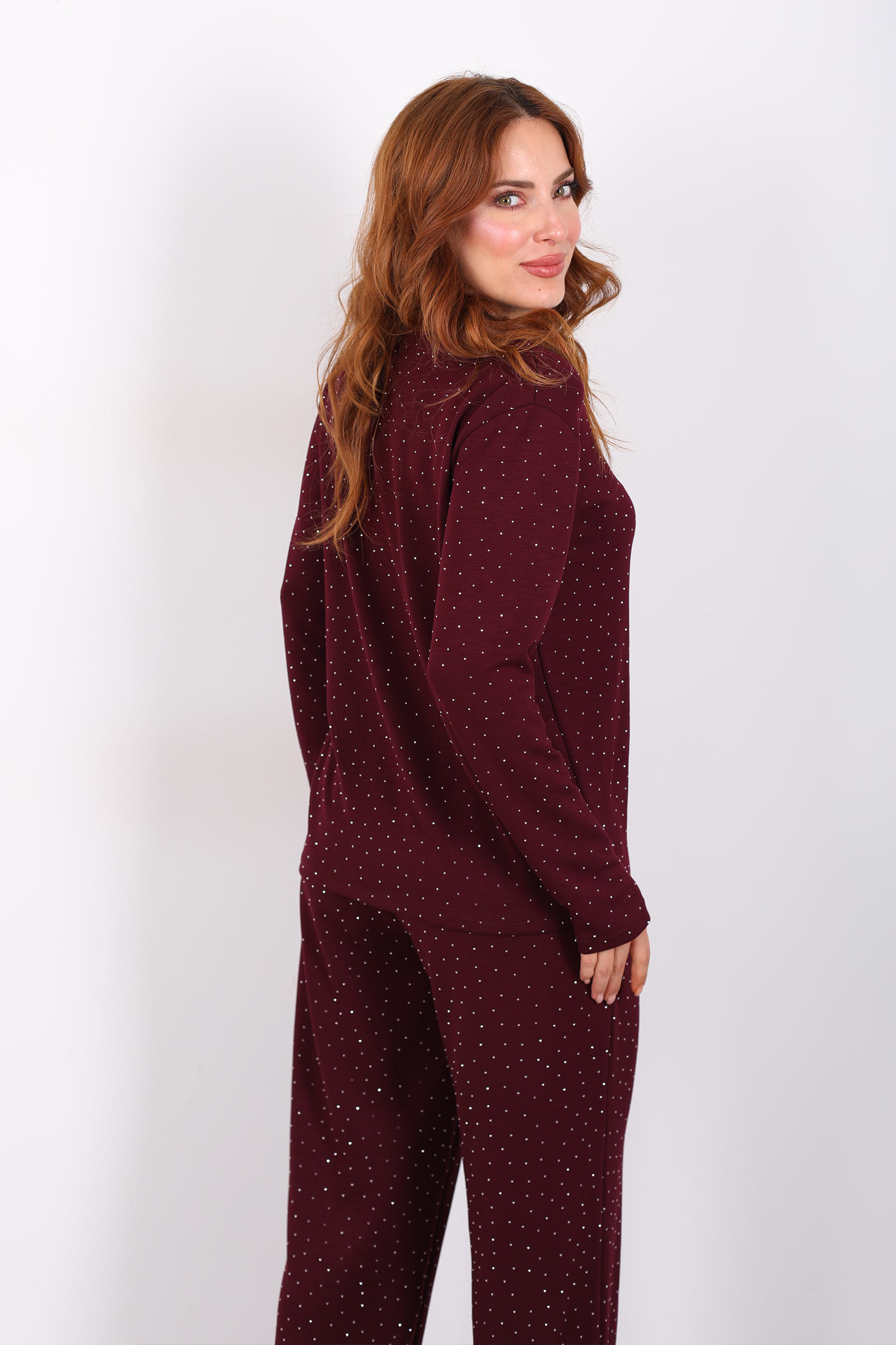 Bisiklet Yaka Taşlı Bordo Kadın Modal Takım