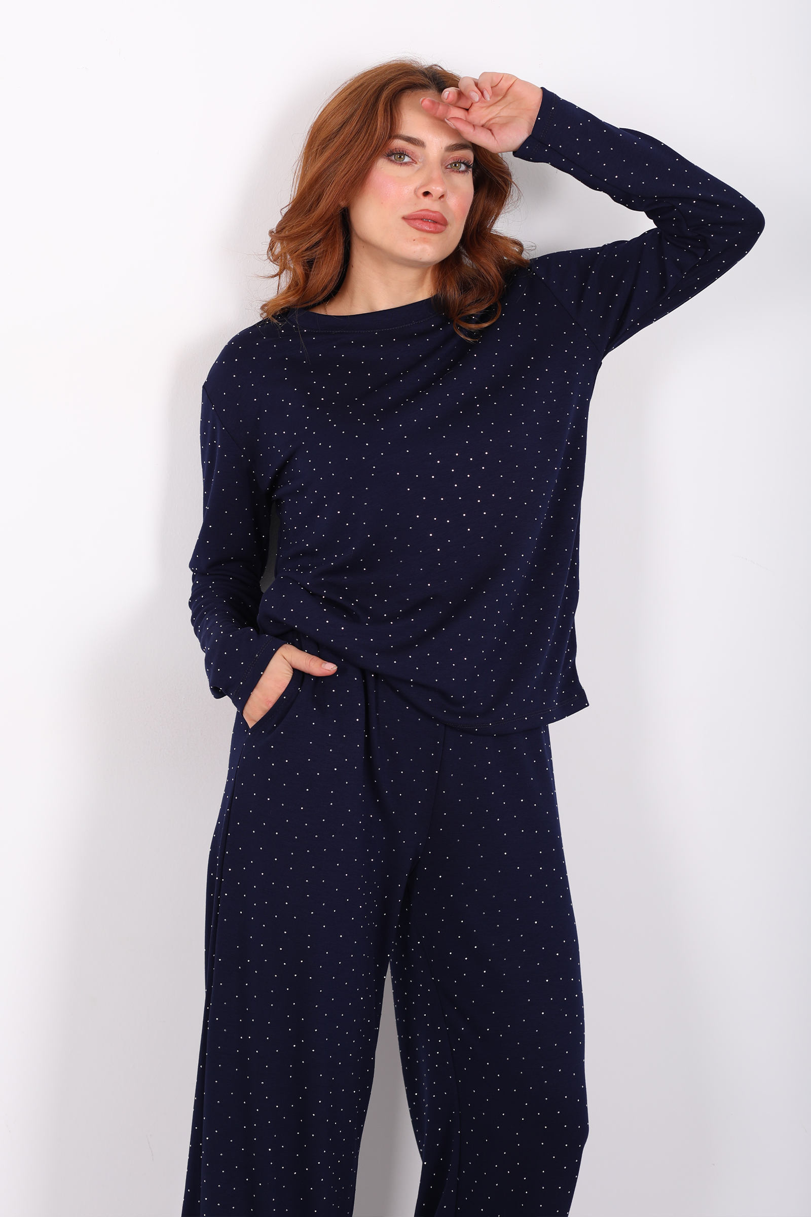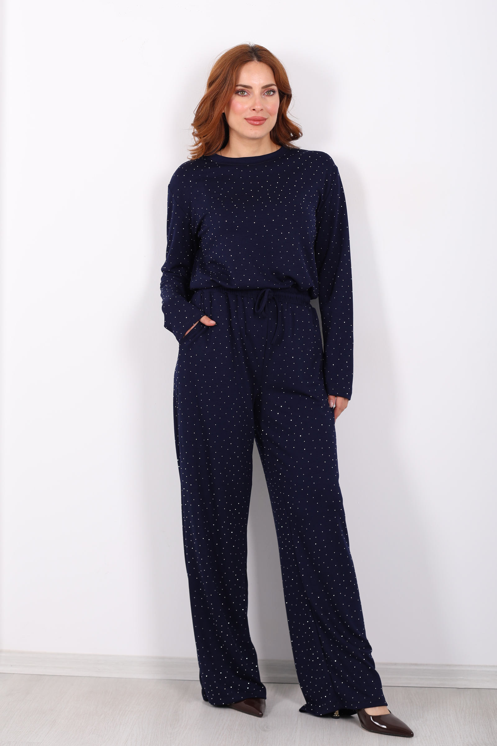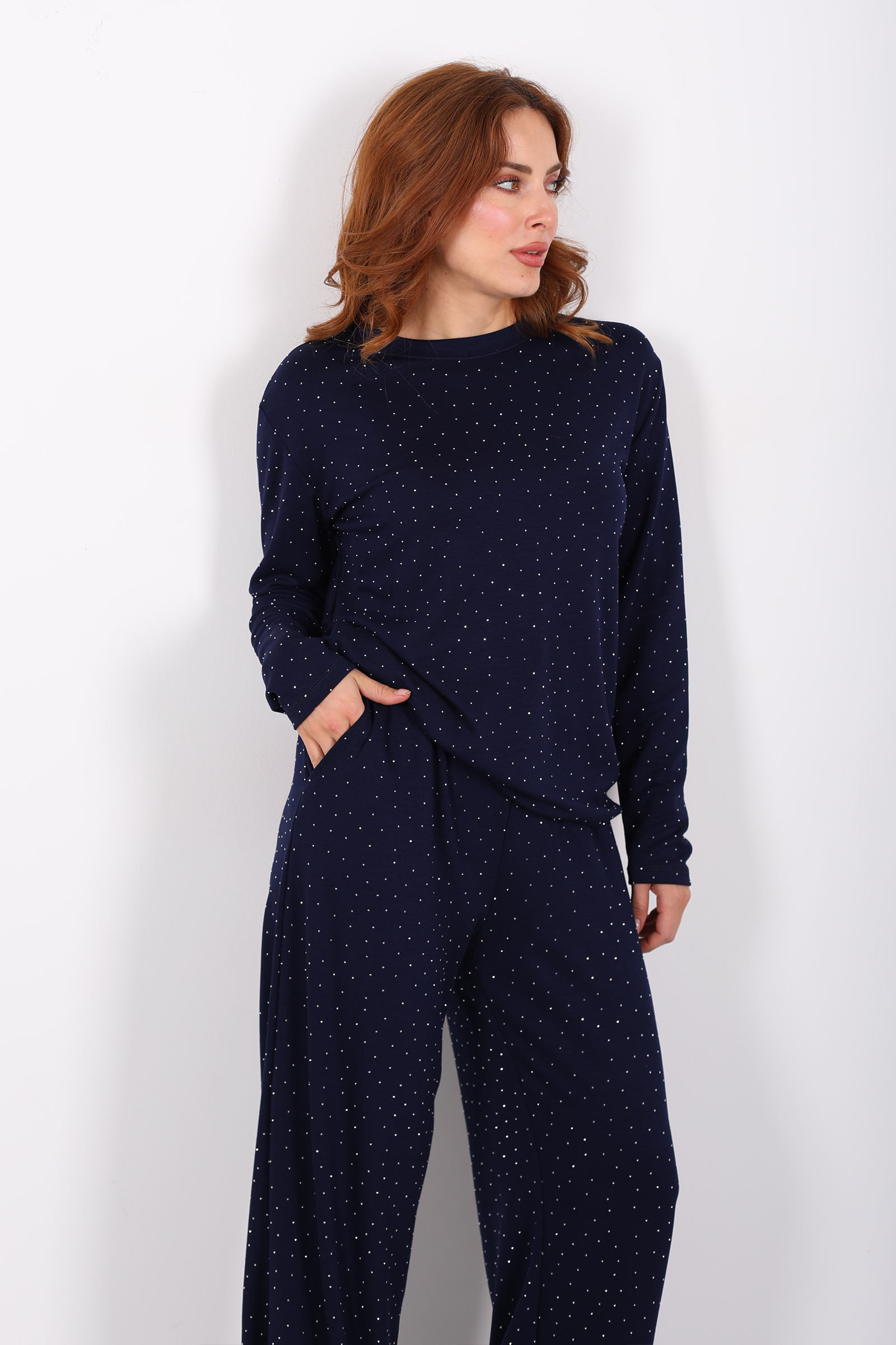 Bisiklet Yaka Taşlı Lacivert Kadın Modal Takım