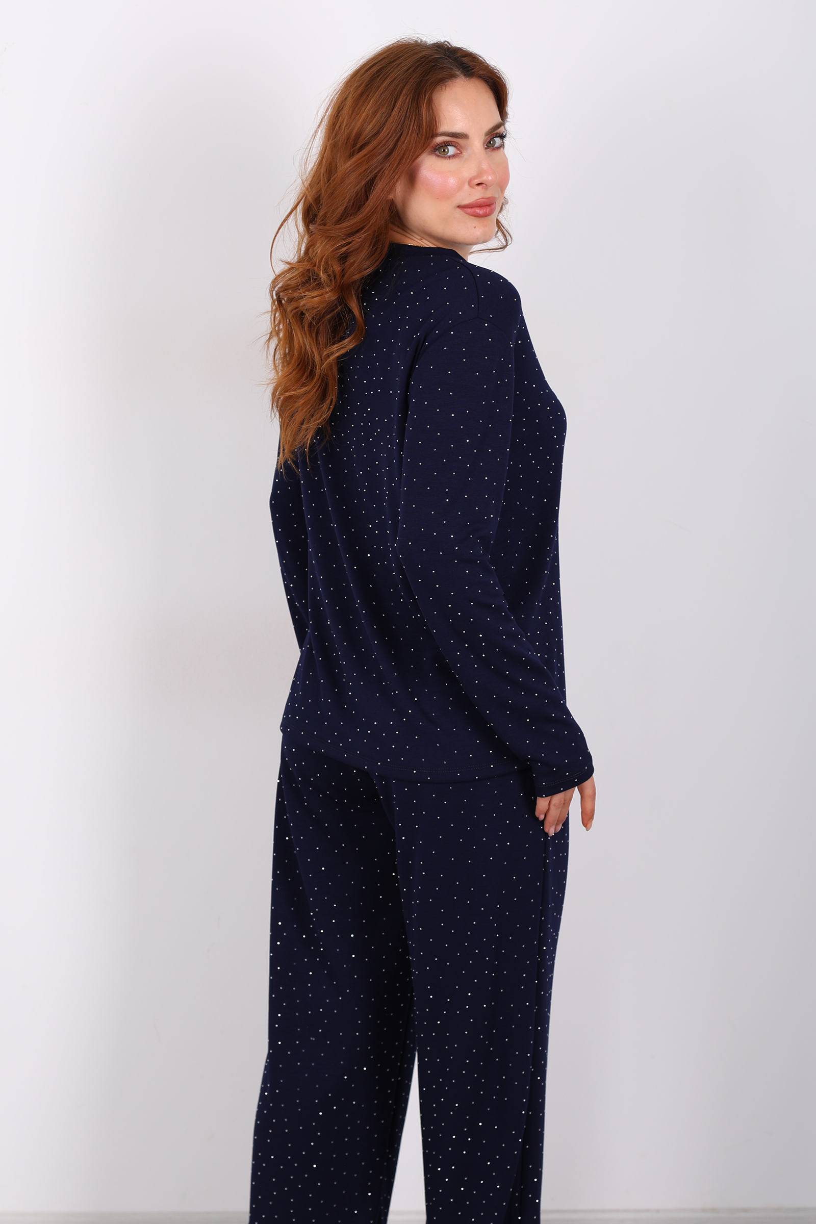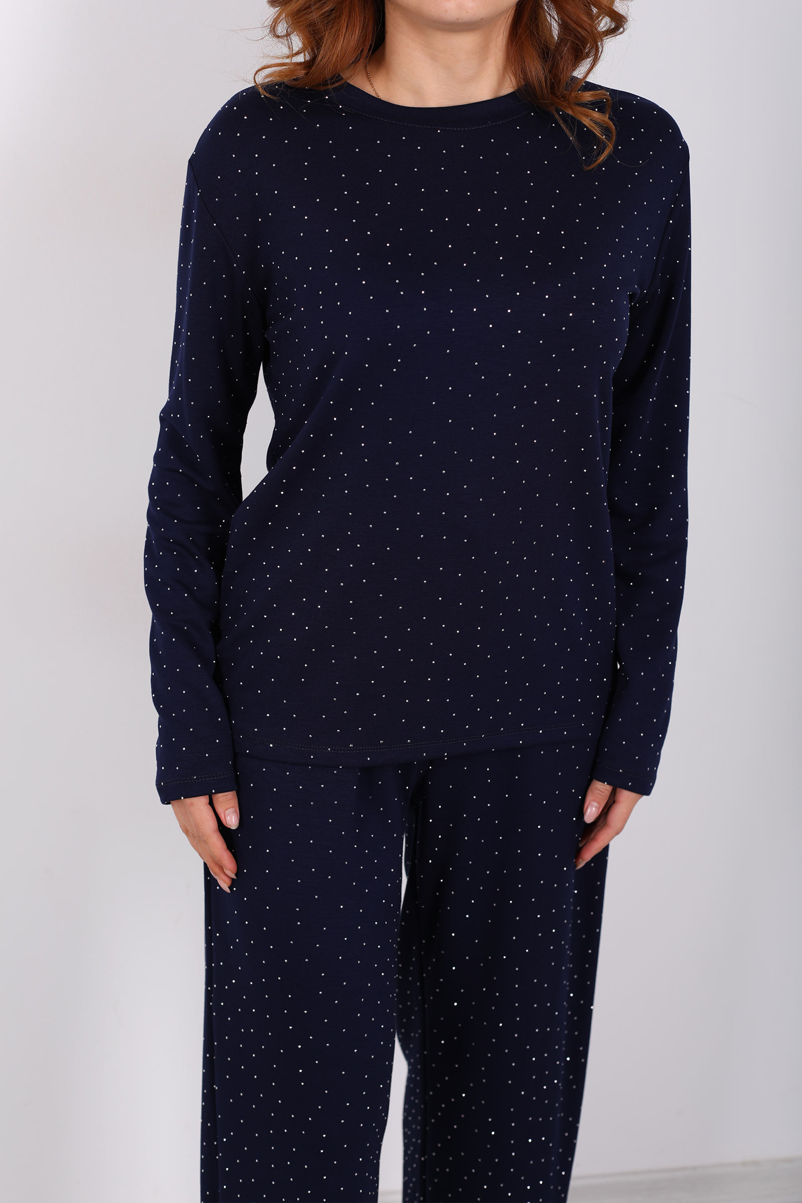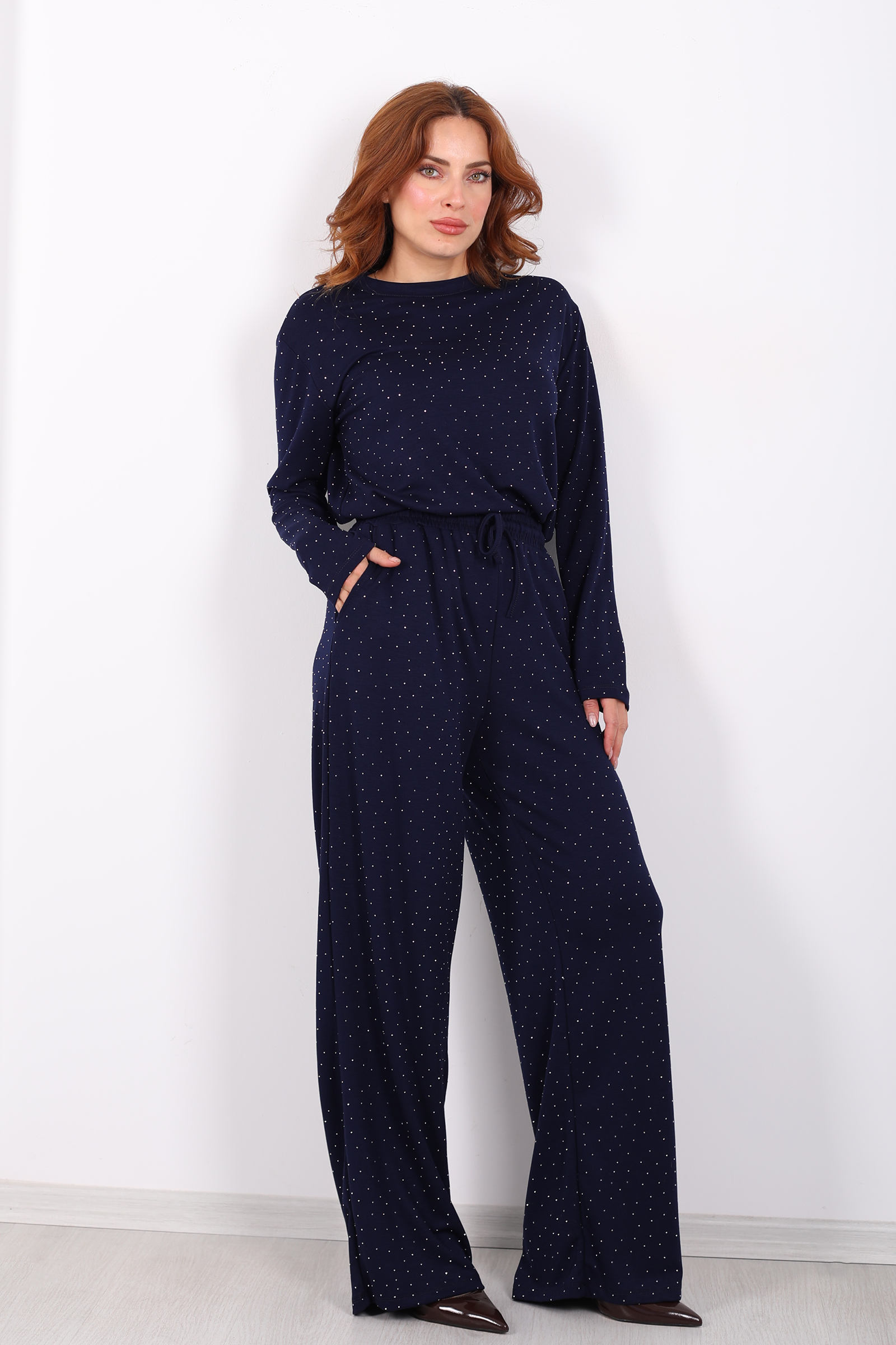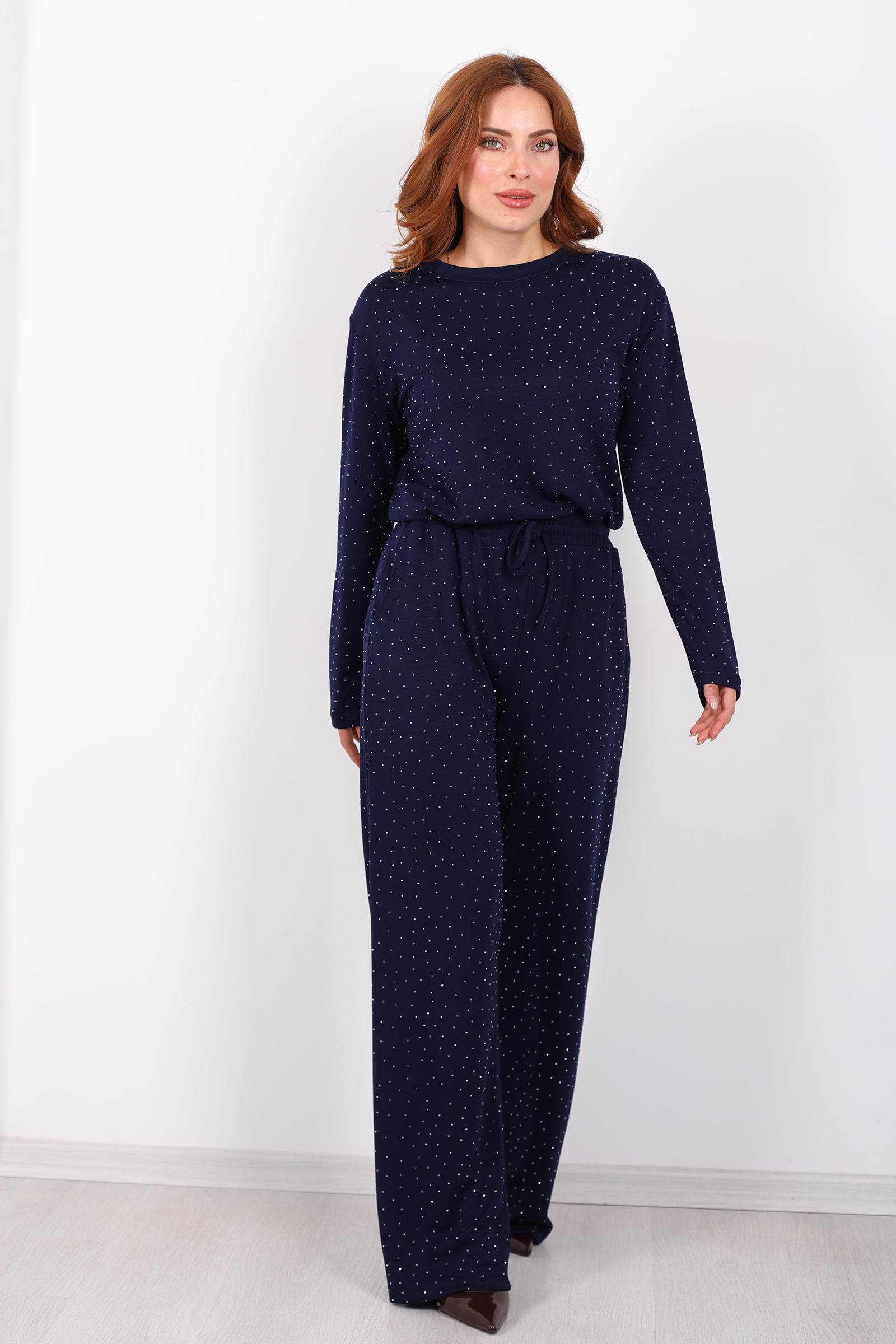 Bisiklet Yaka Taşlı Lacivert Kadın Modal Takım