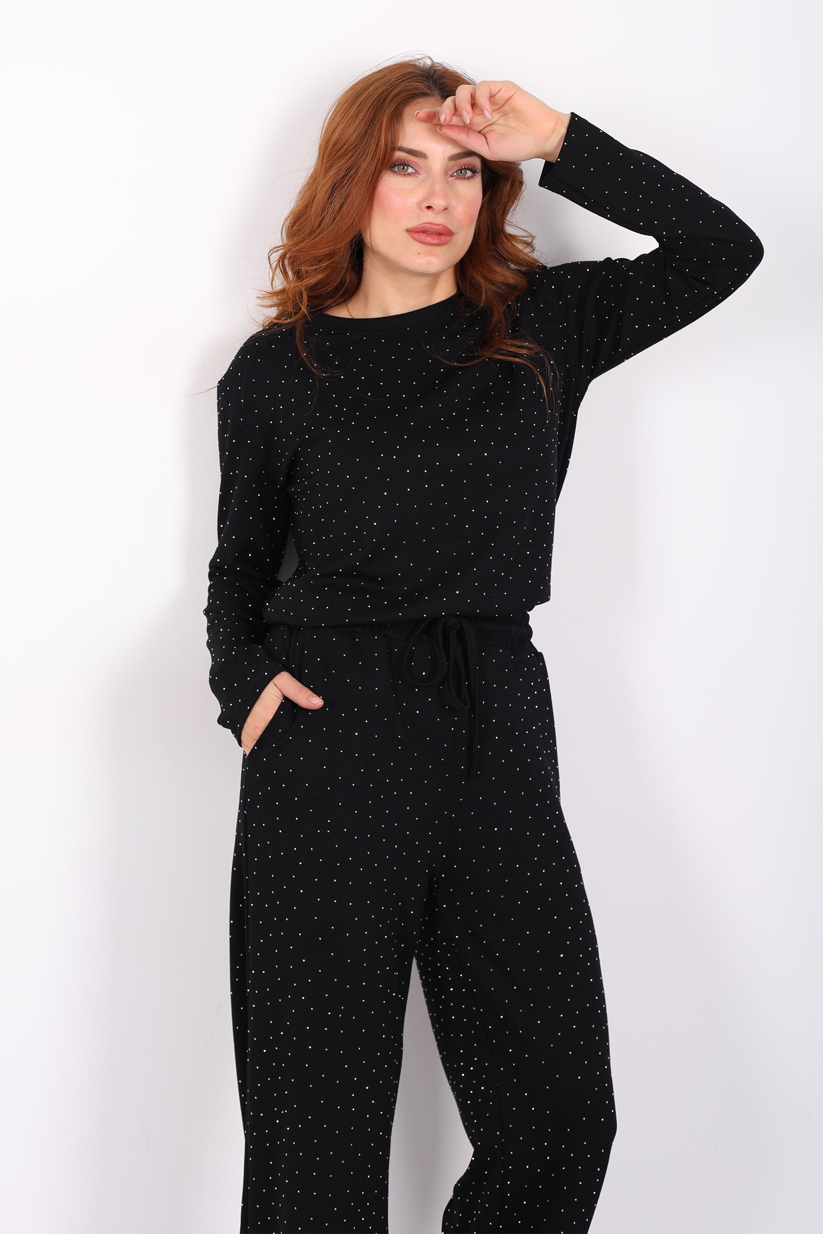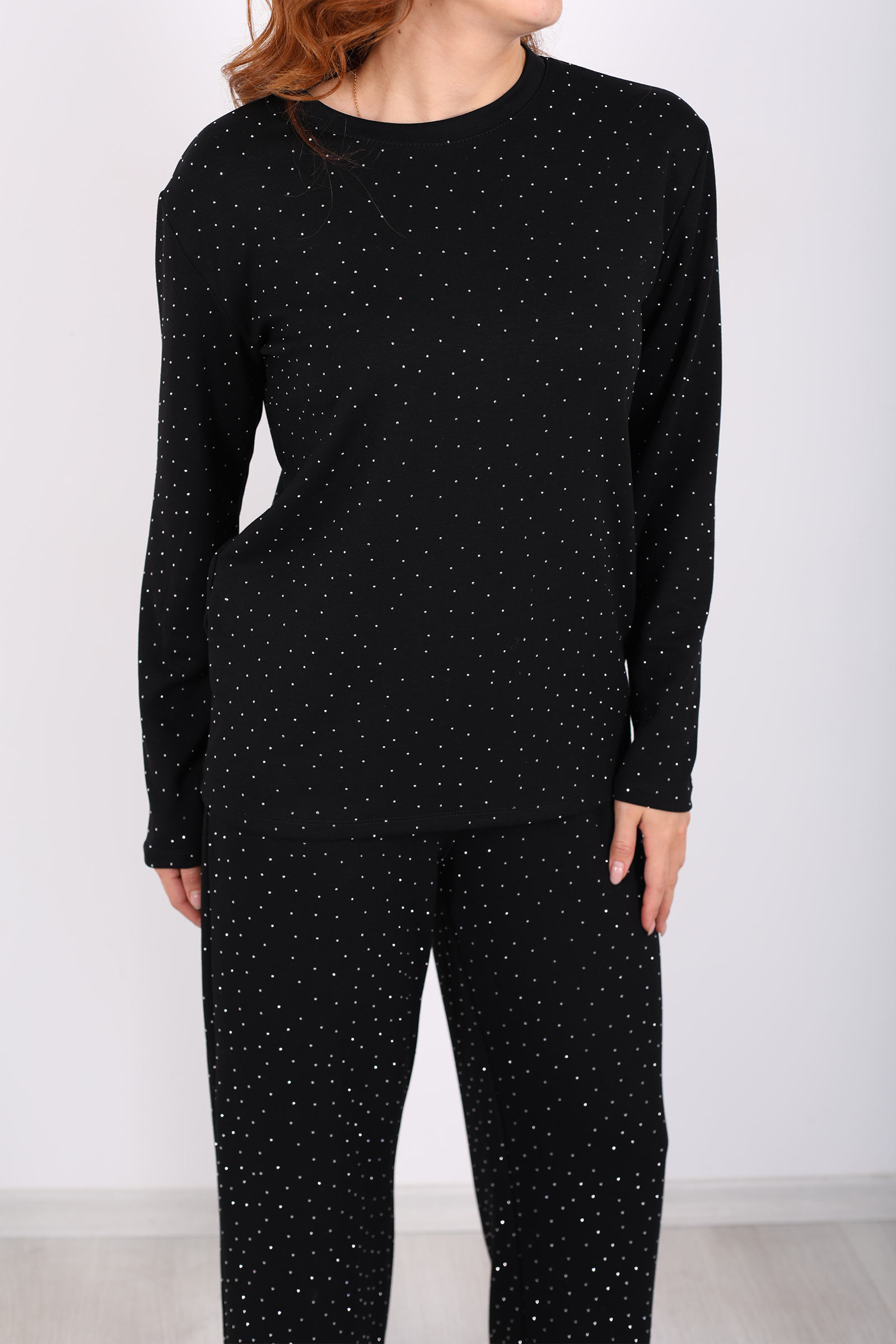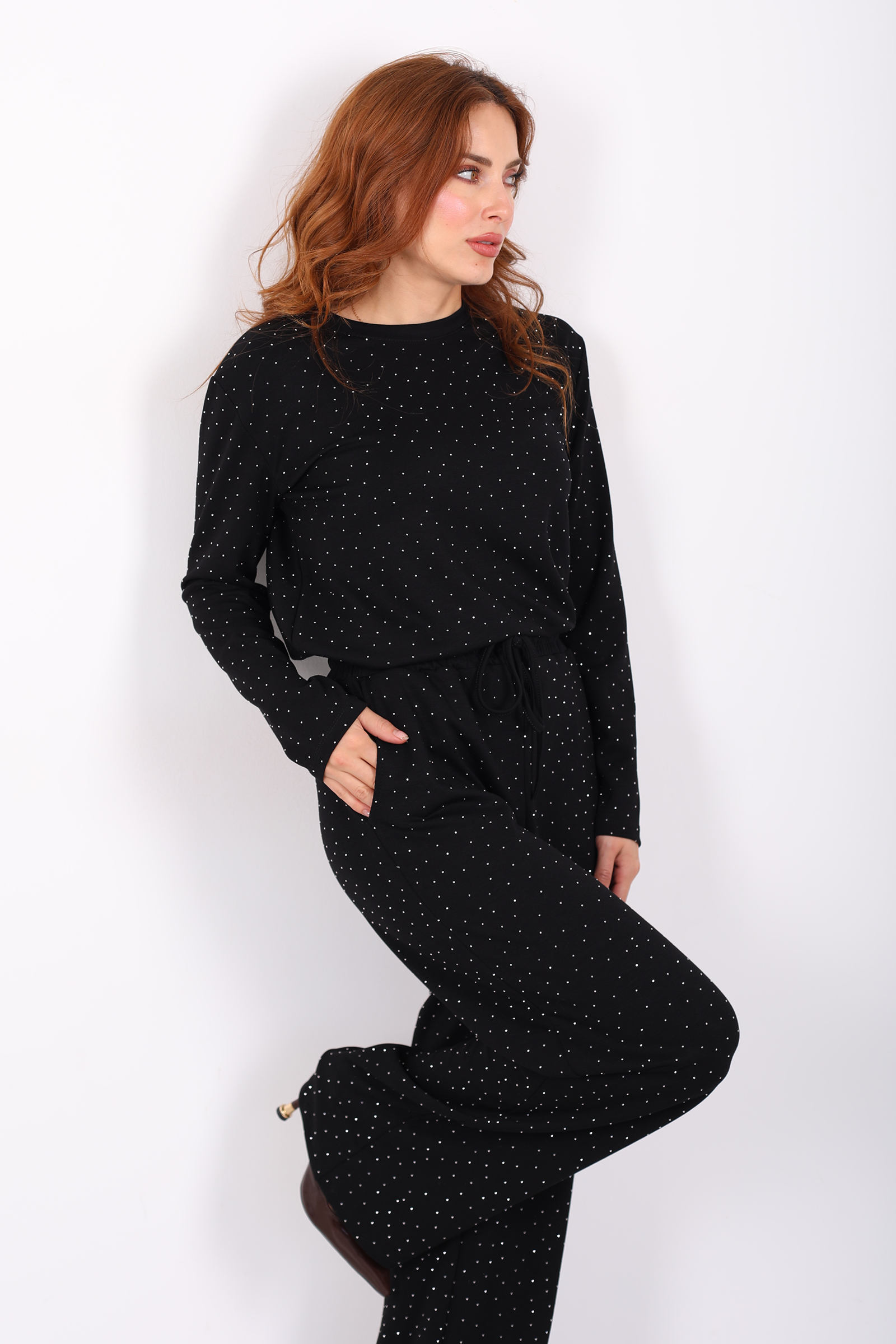 Bisiklet Yaka Taşlı Siyah Kadın Modal Takım