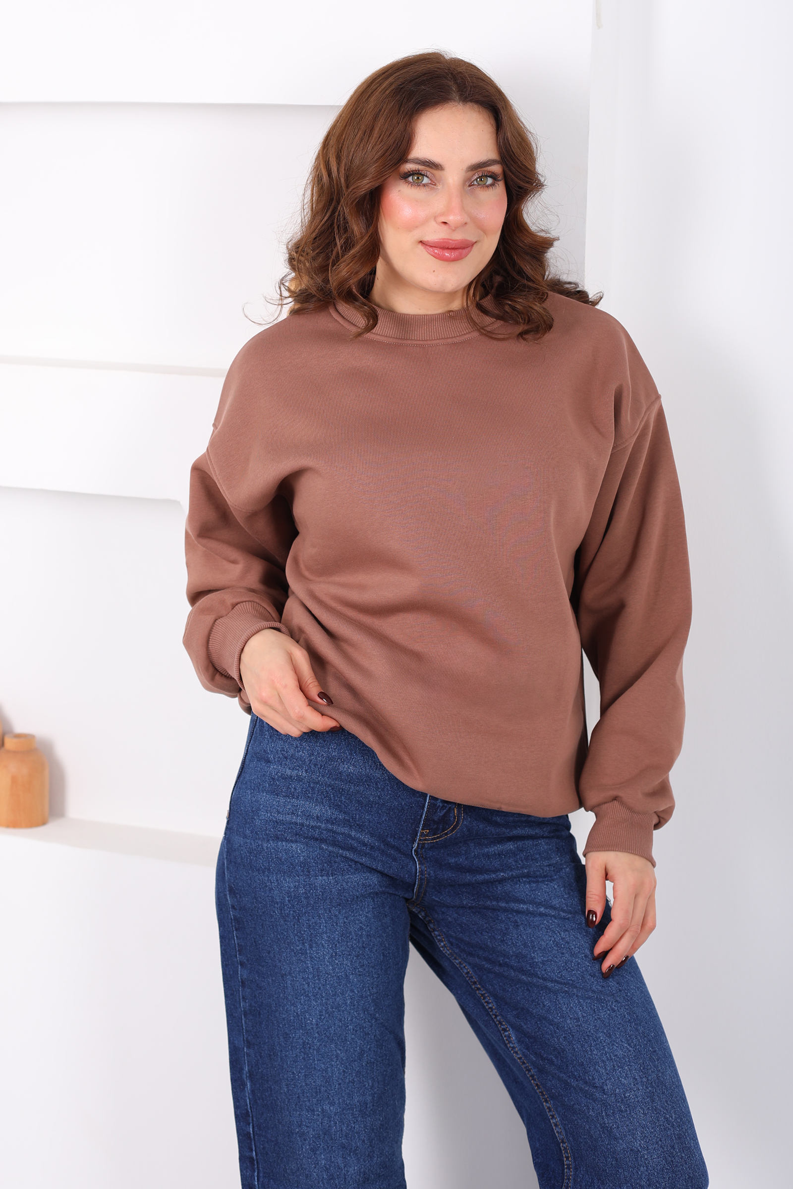 Bisiklet Yaka Üç İp Kadın Oversize Açık Kahve Sweat