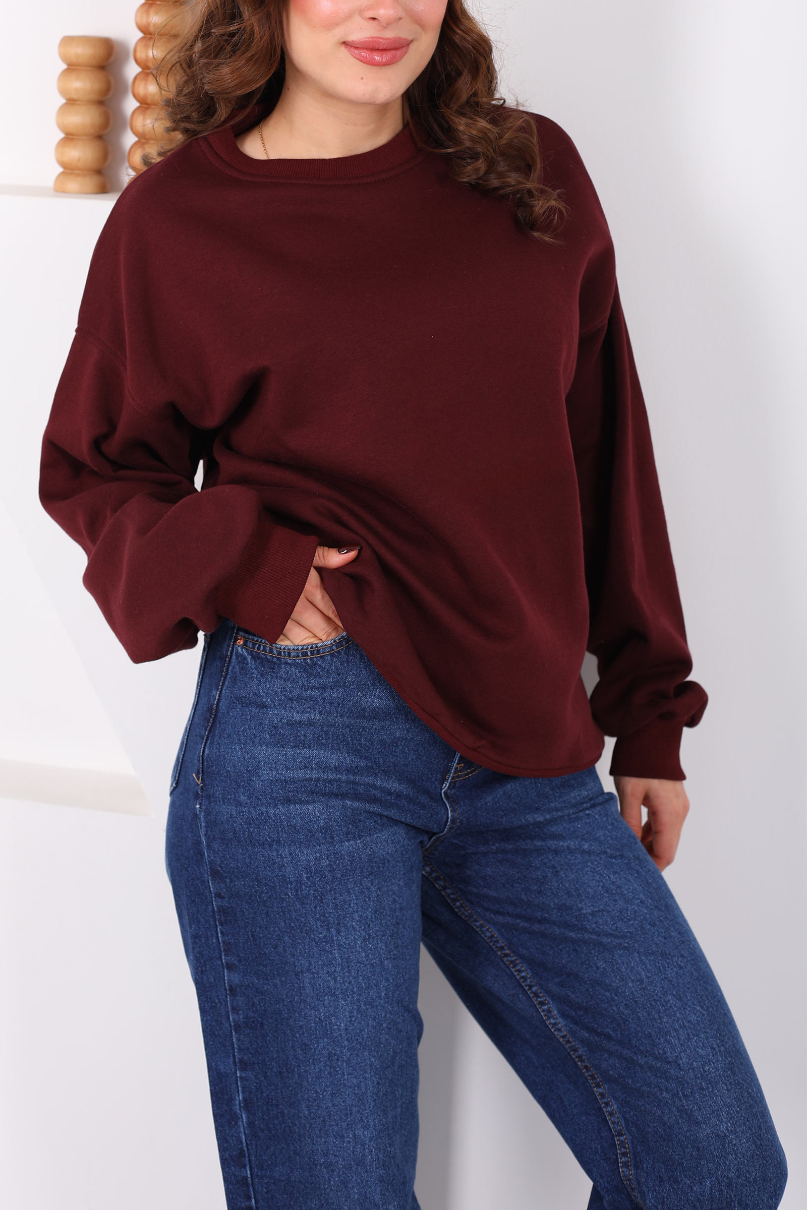 Bisiklet Yaka Üç İp Kadın Oversize Bordo Sweat