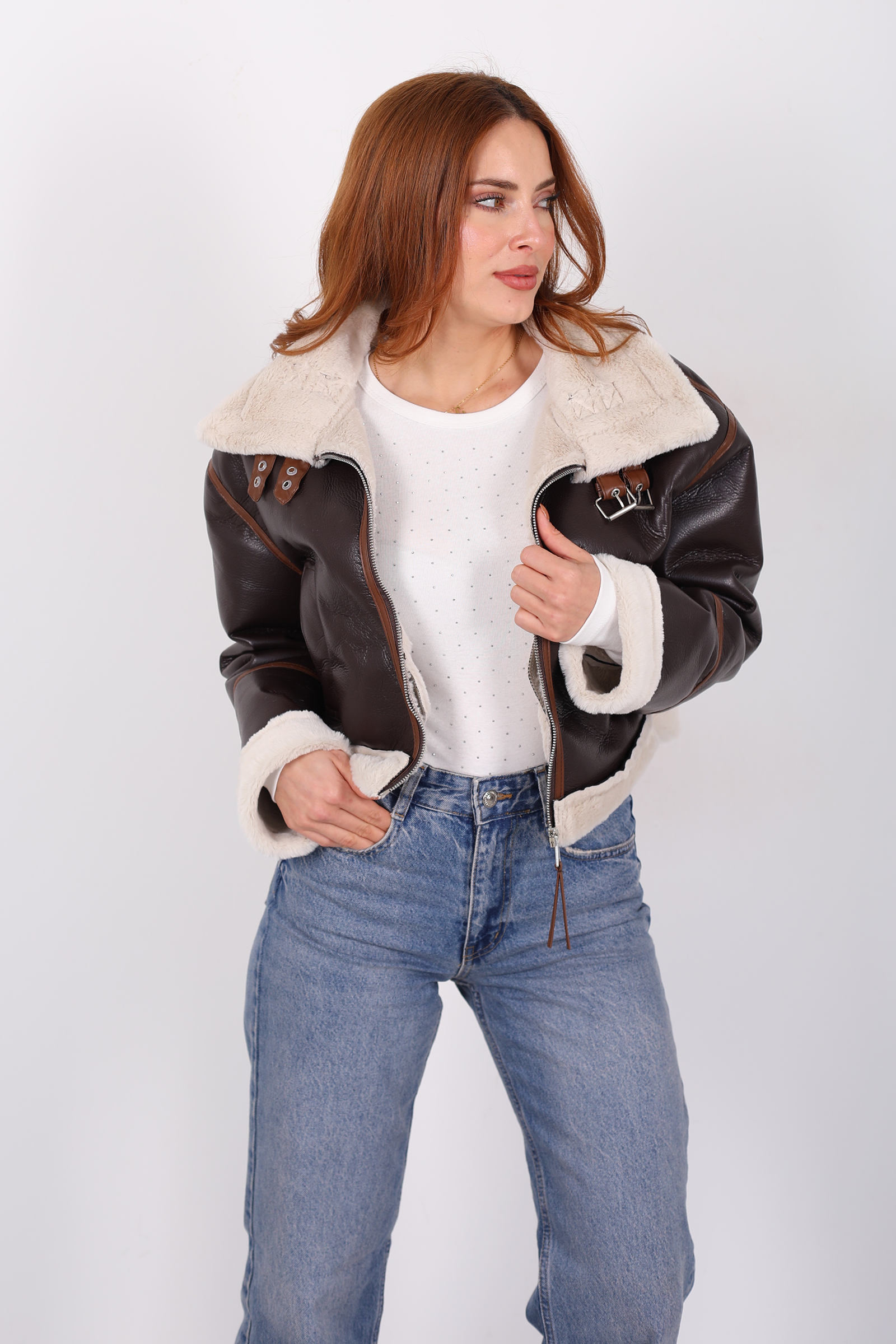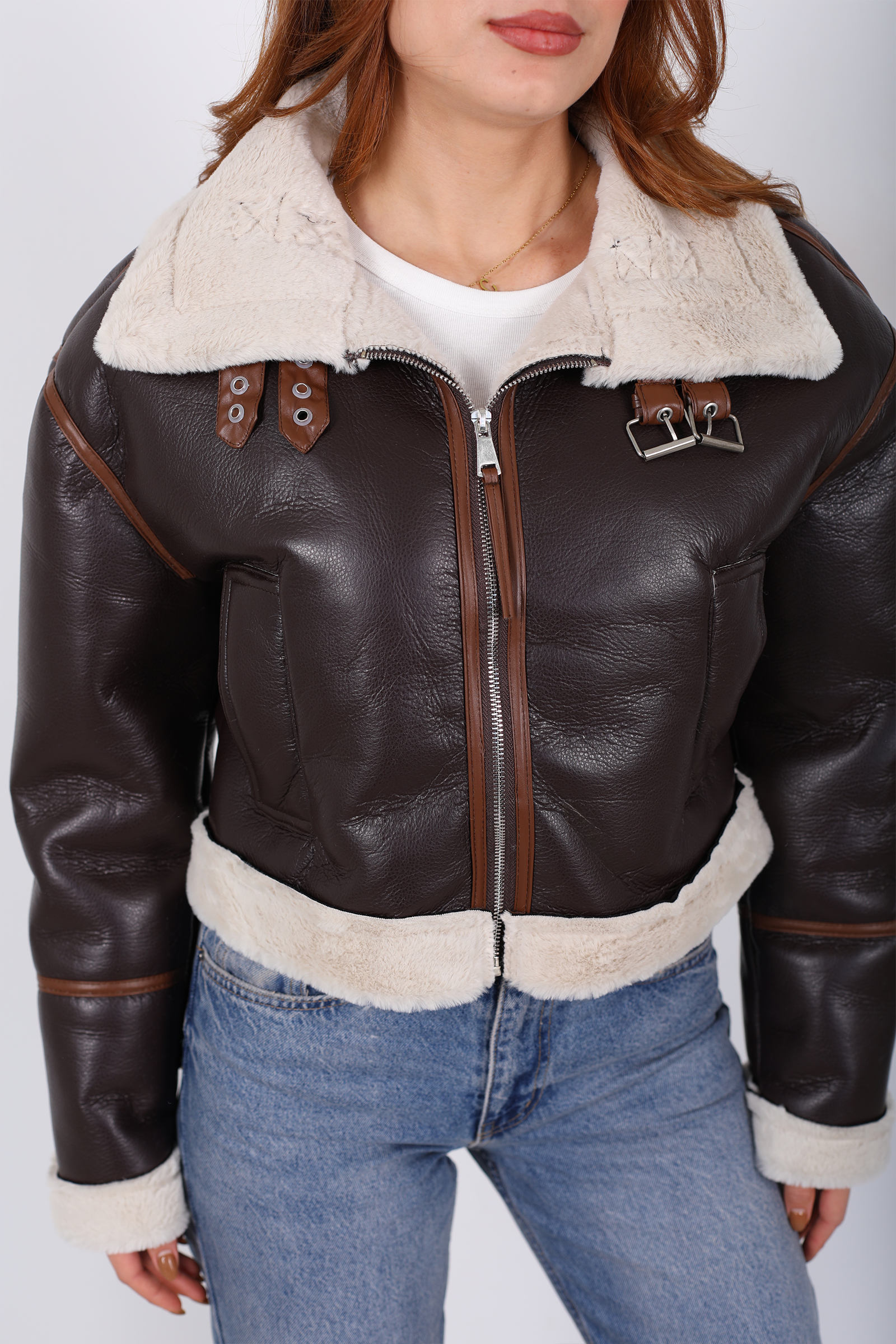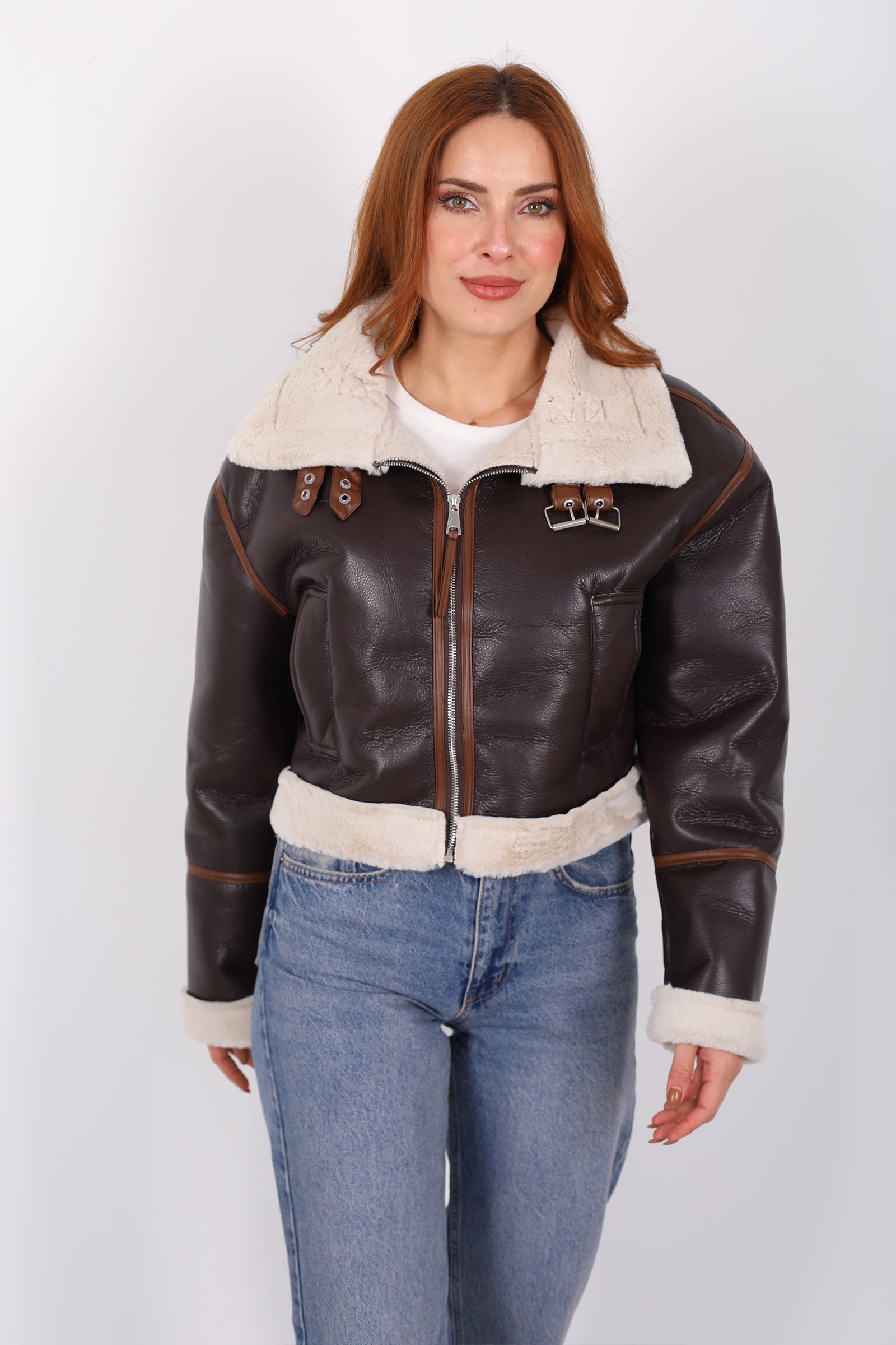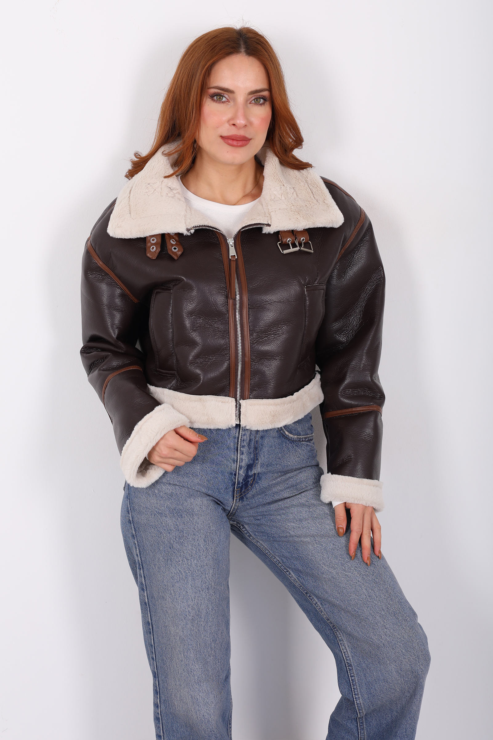Yaka Kürklü Zımbalı Kahverengi Kadın Deri Mont