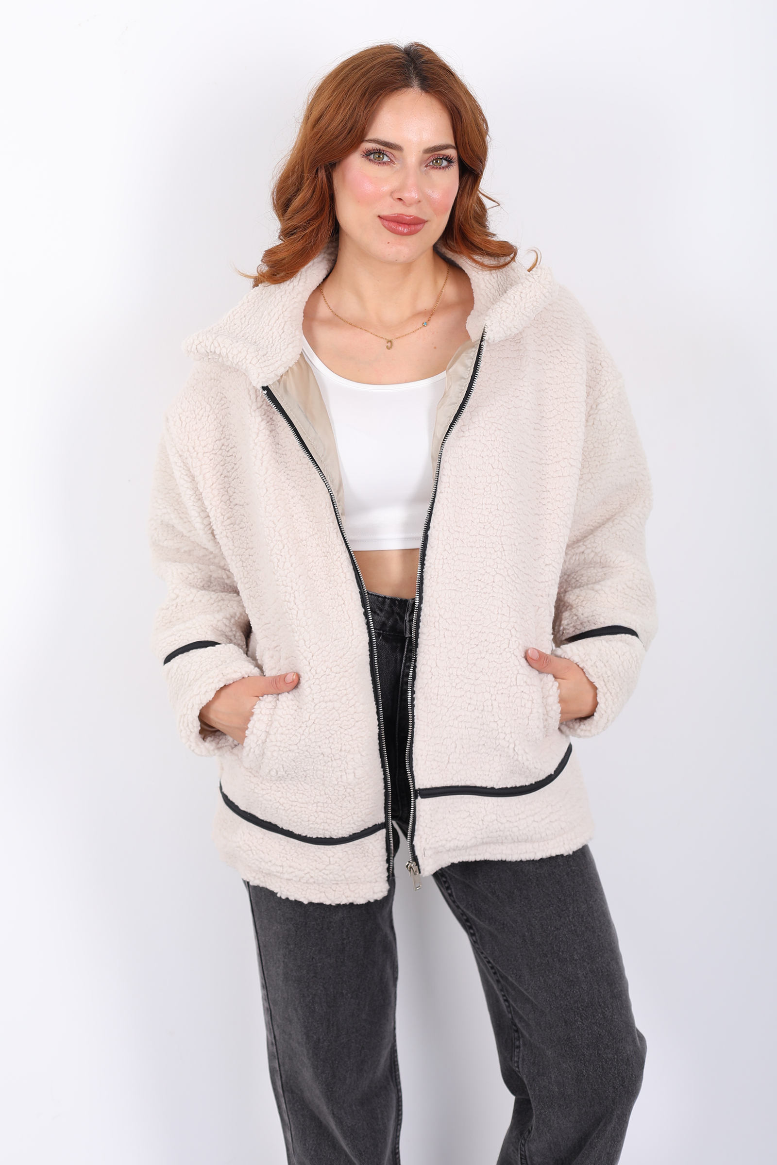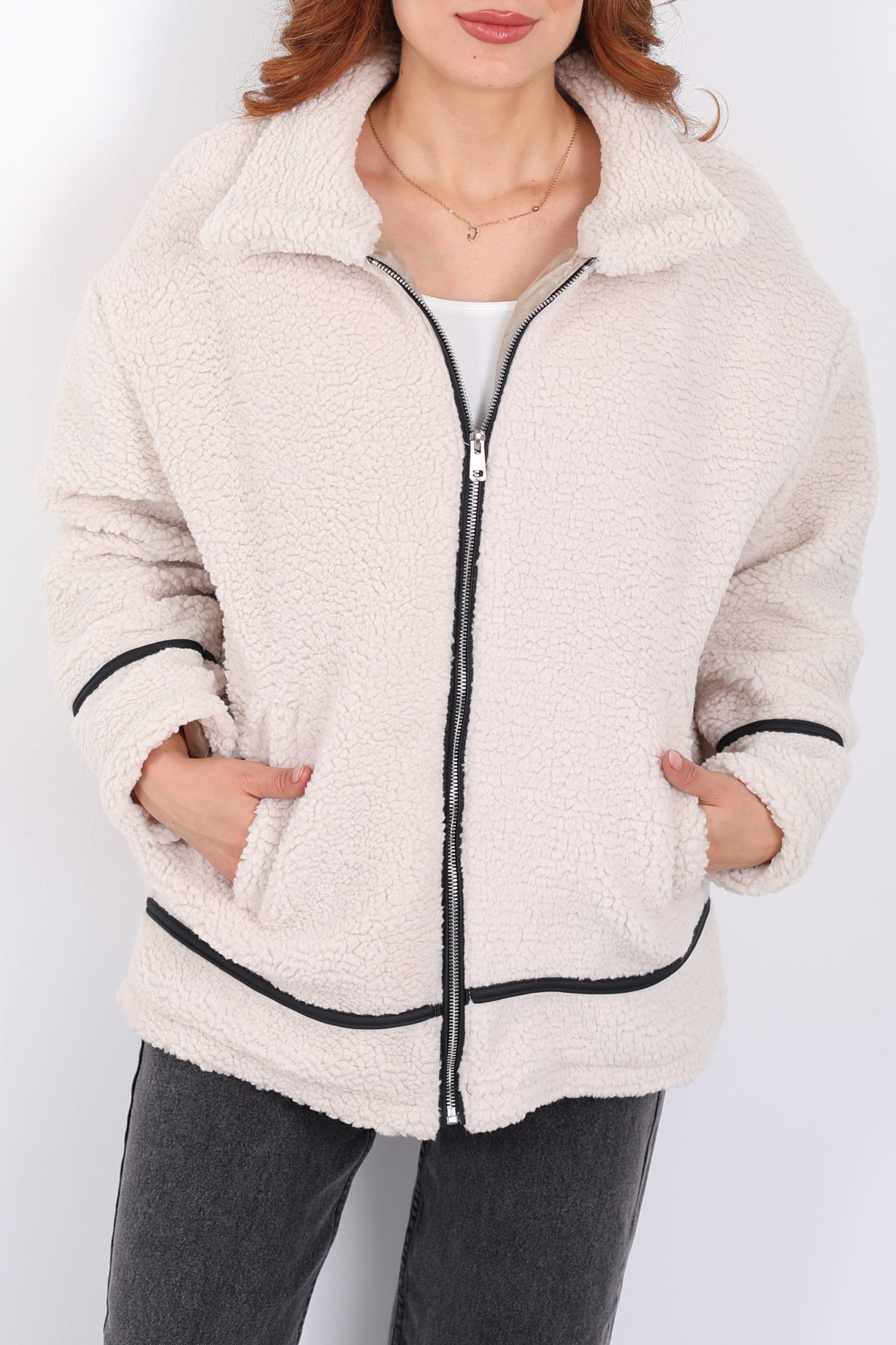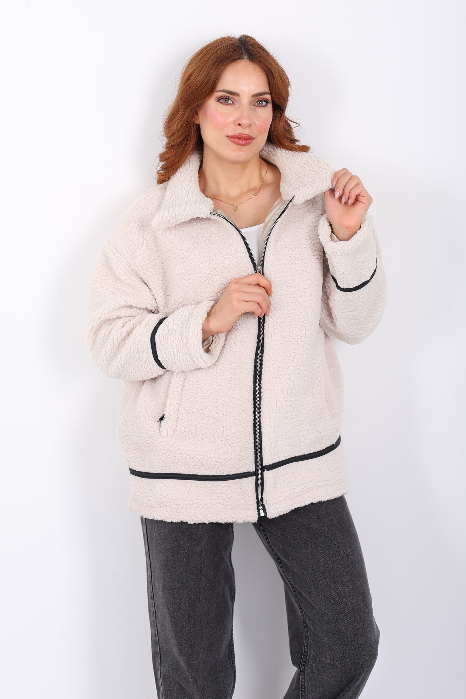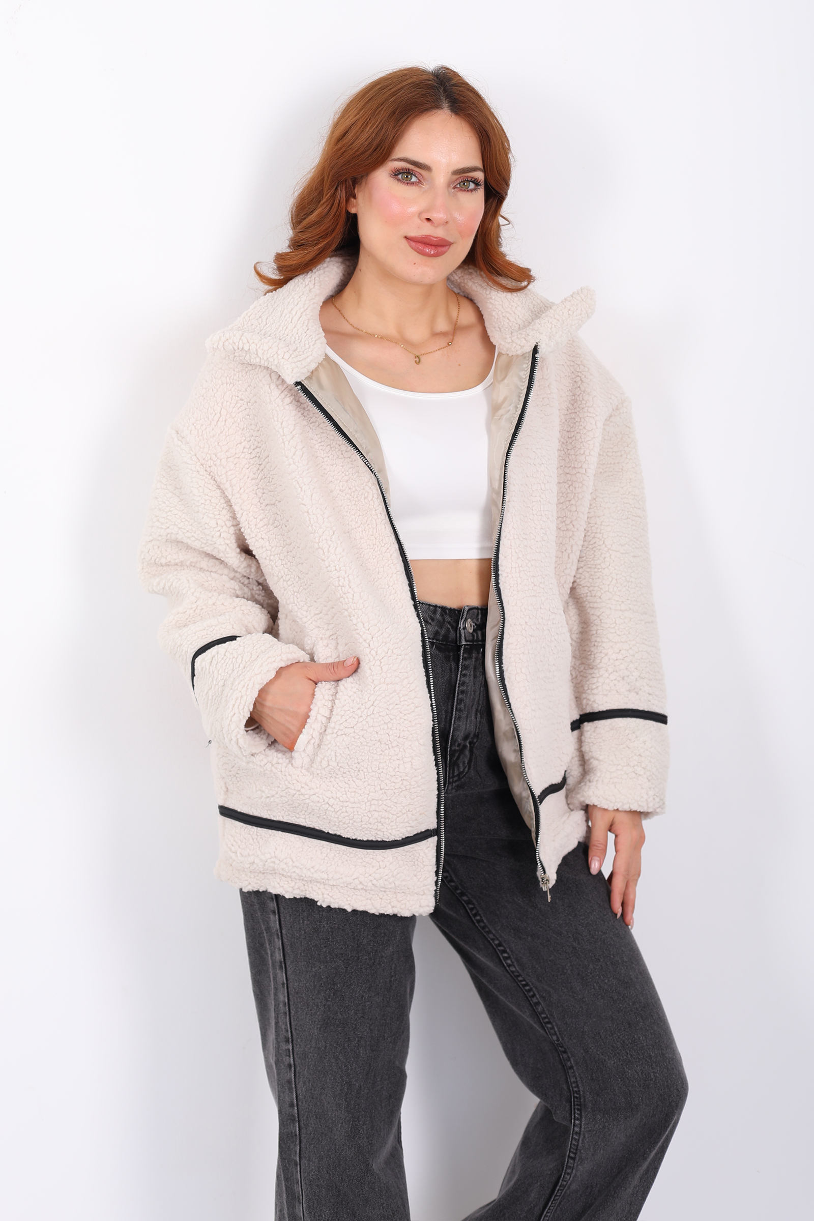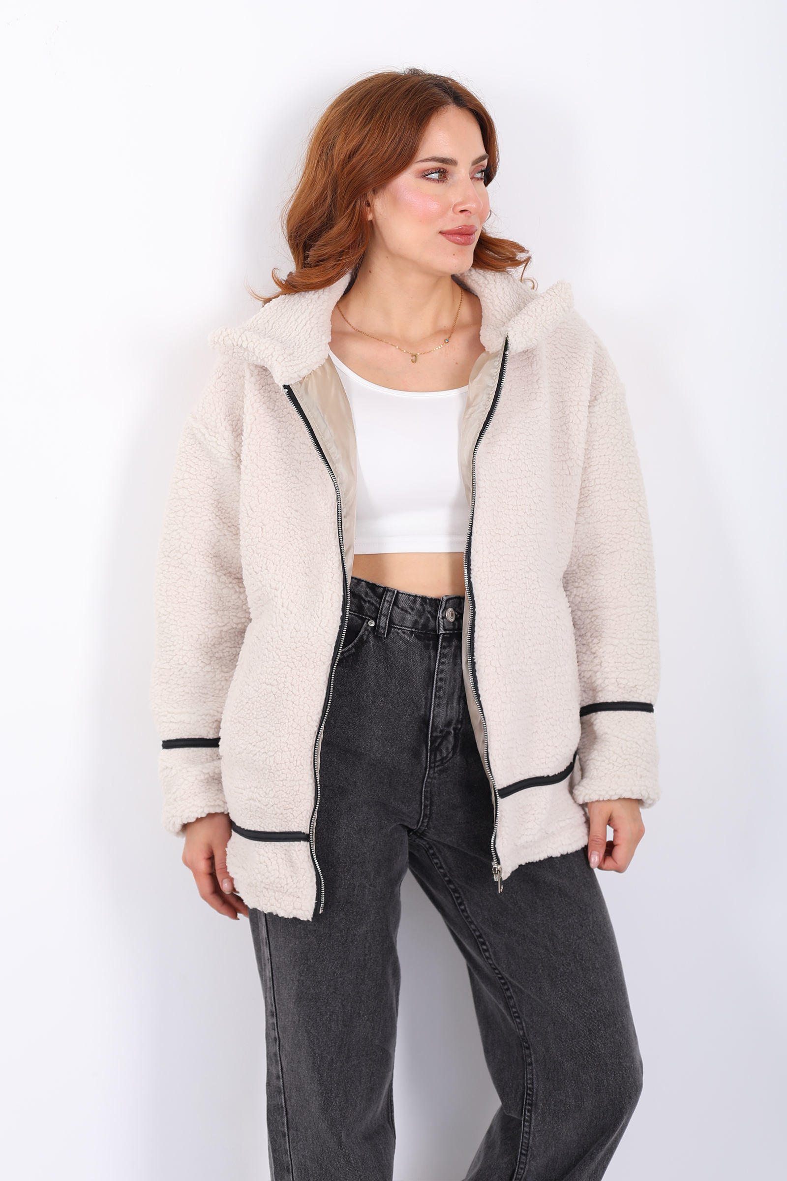 Biyeli Cepli Krem Kadın Peluş Ceket