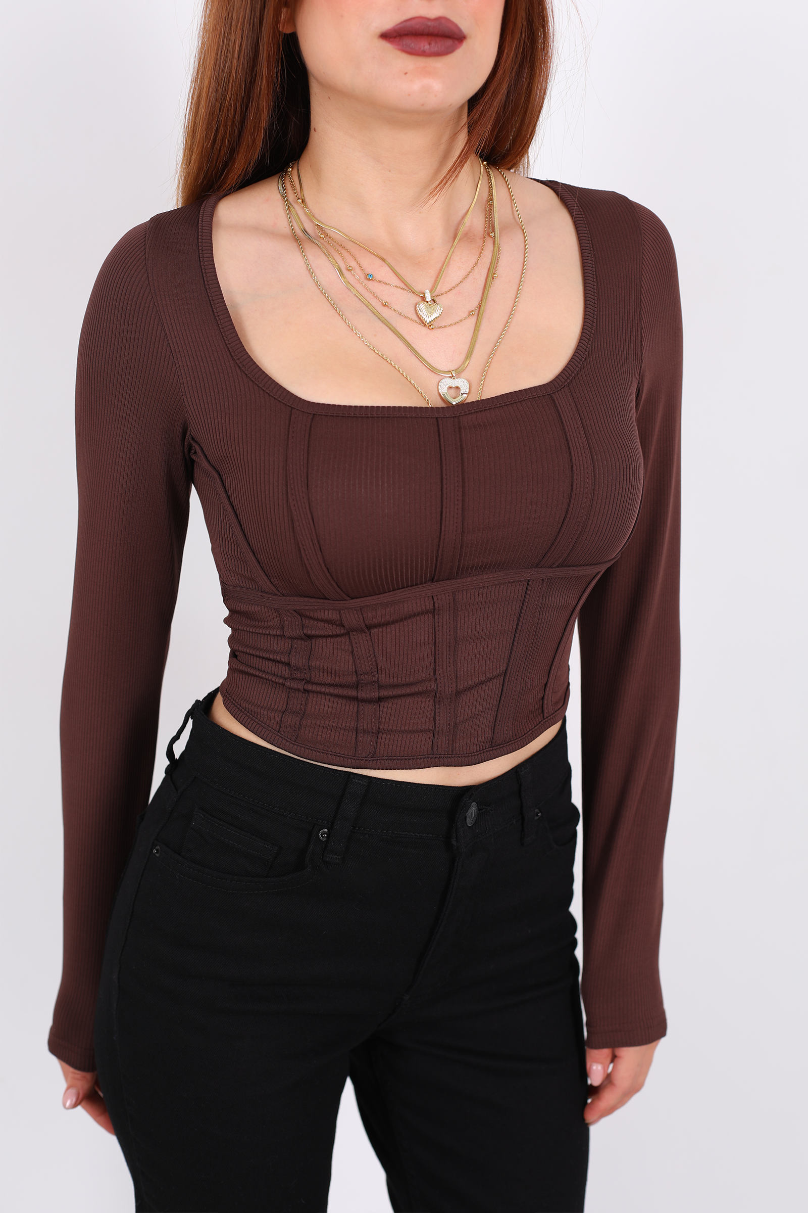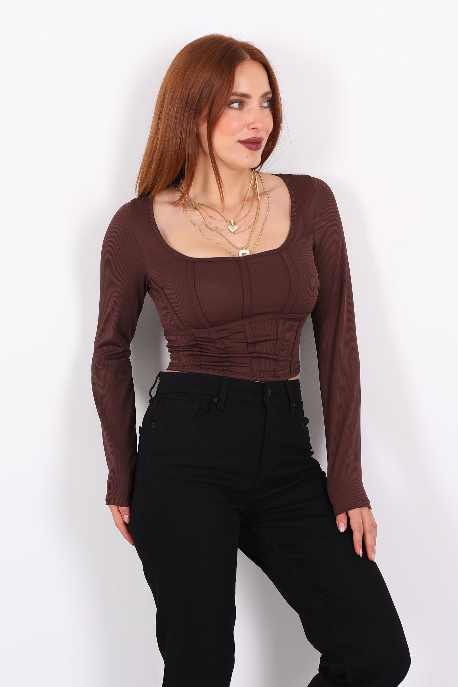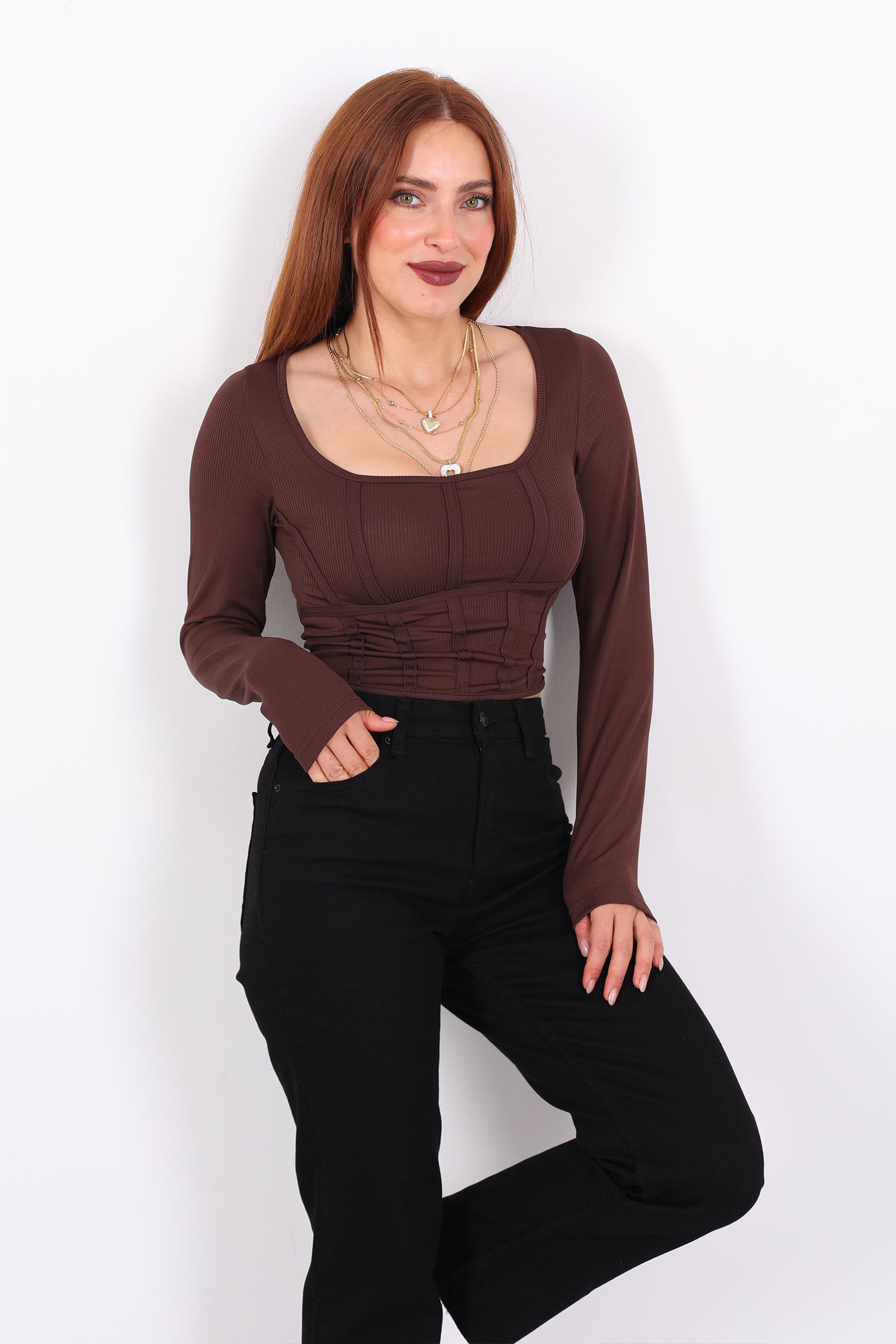 Kahverenginin sıcak ve zarif tonuyla tasarlanmış bu bluz, fitilli rib örgüsüyle hem esnek hem dokulu bir yapı sunuyor. Fitilli kumaş, dikey kaburgalı deseni sayesinde esneme kapasitesi yüksek, vücuda nazikçe uyum sağlayan bir form kazandırıyor.Üzerine blazer veya hafif hırka ekleyerek hem doku kontrastı hem de tarz zenginliği sağlayabilirsiniz.