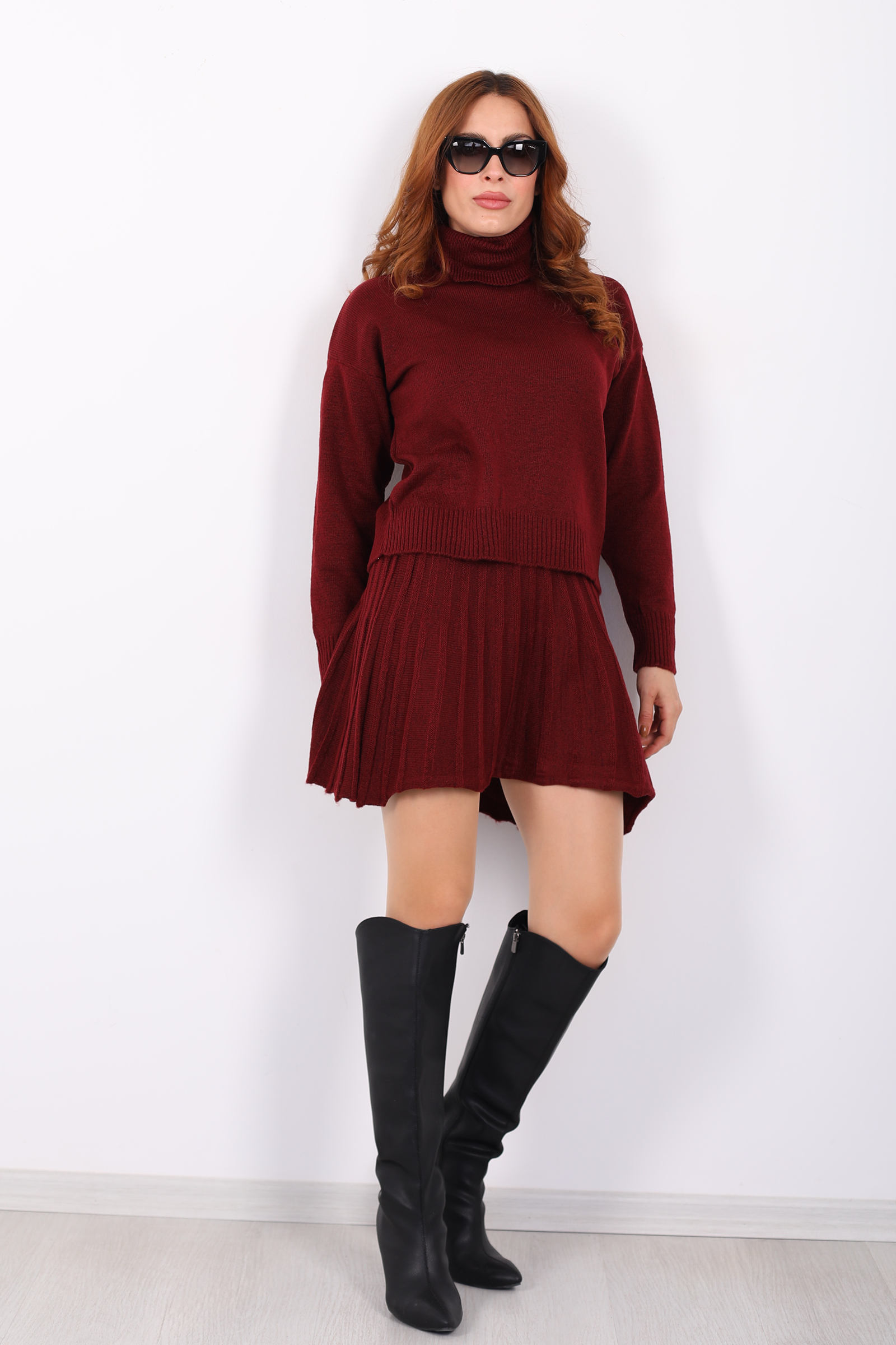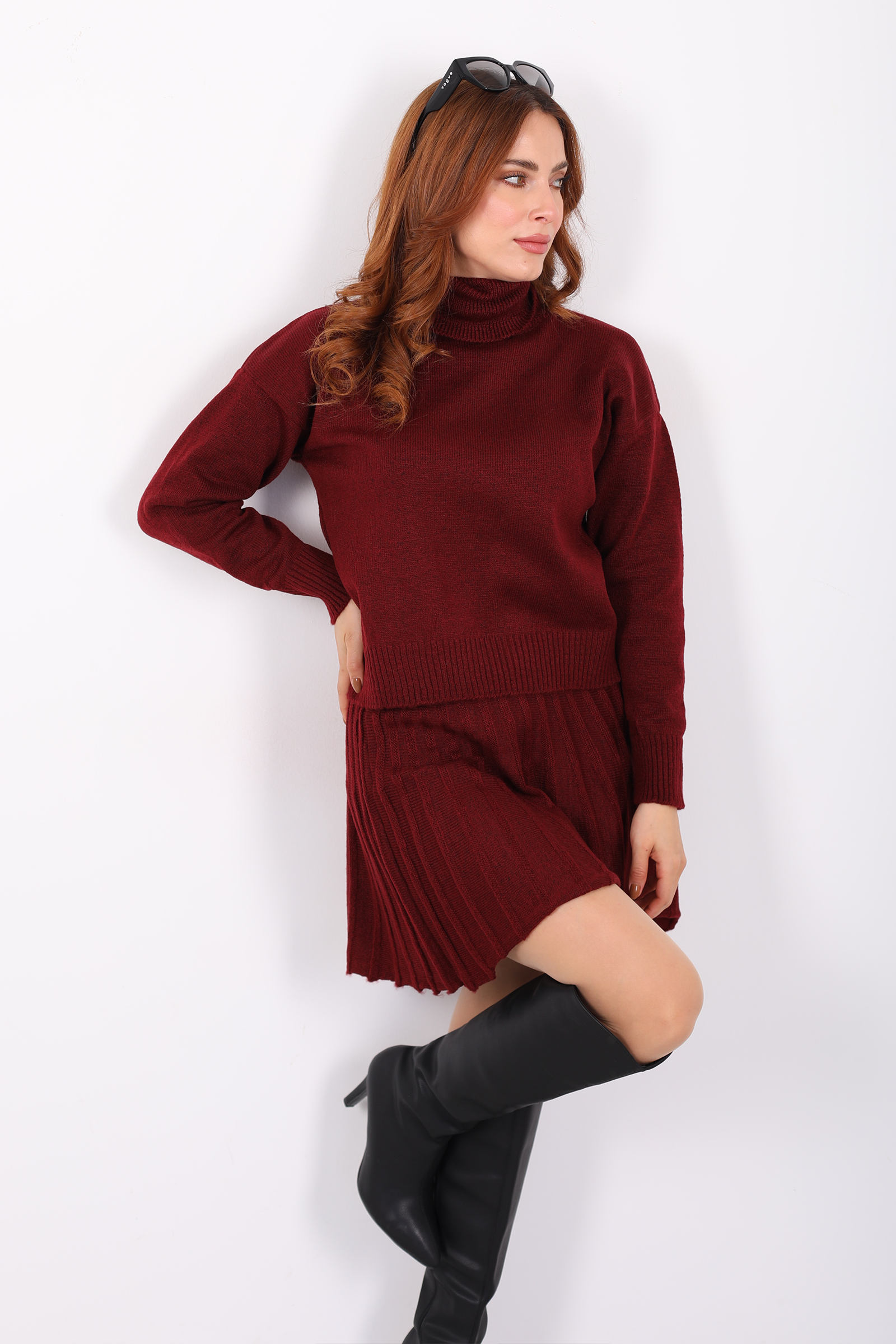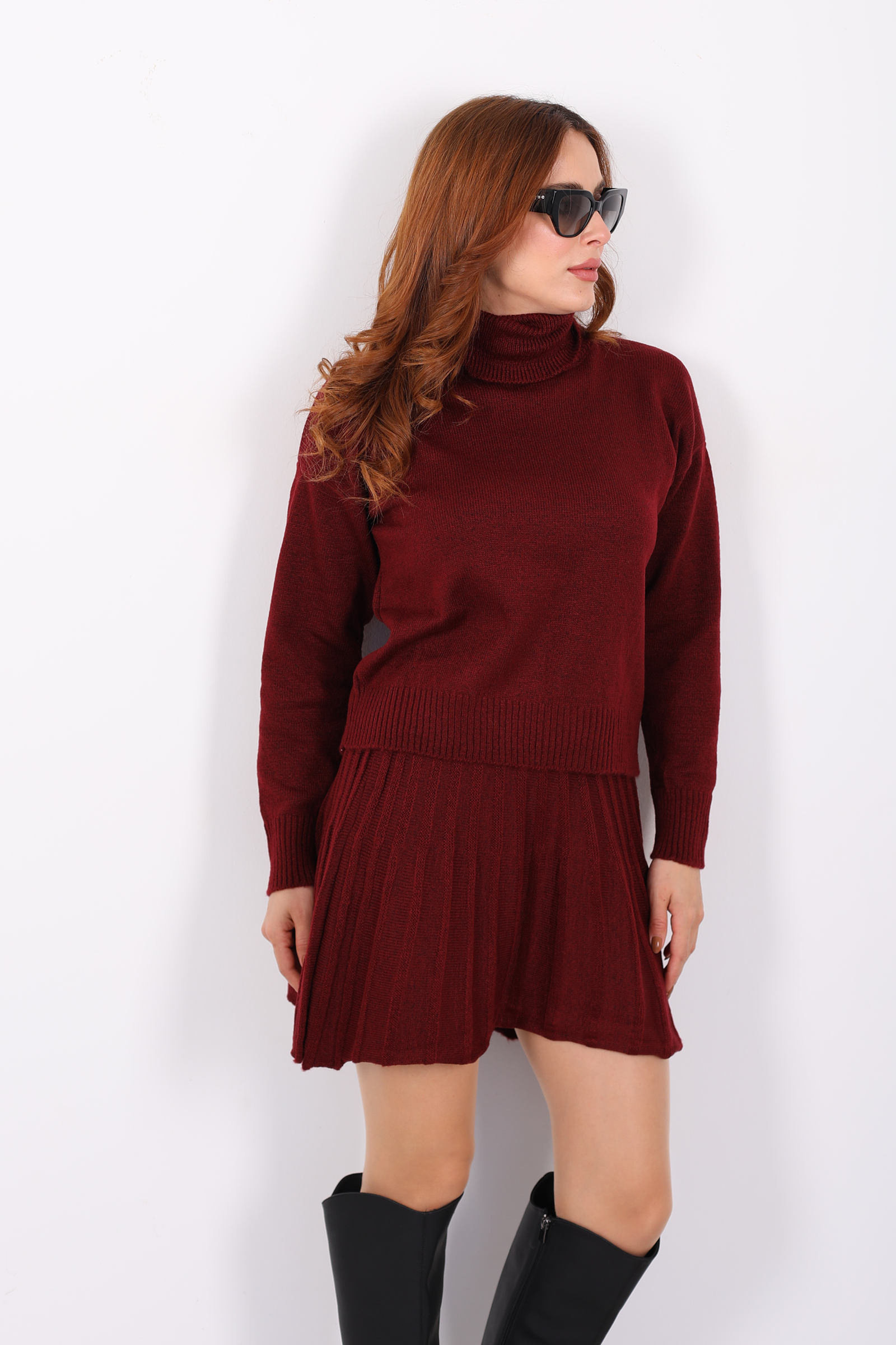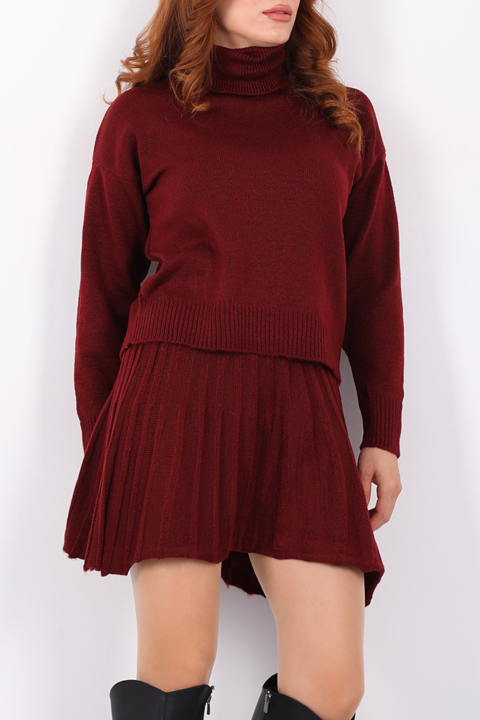 Boğazlı Eteği Pileli Kadın Bordo Triko Takım