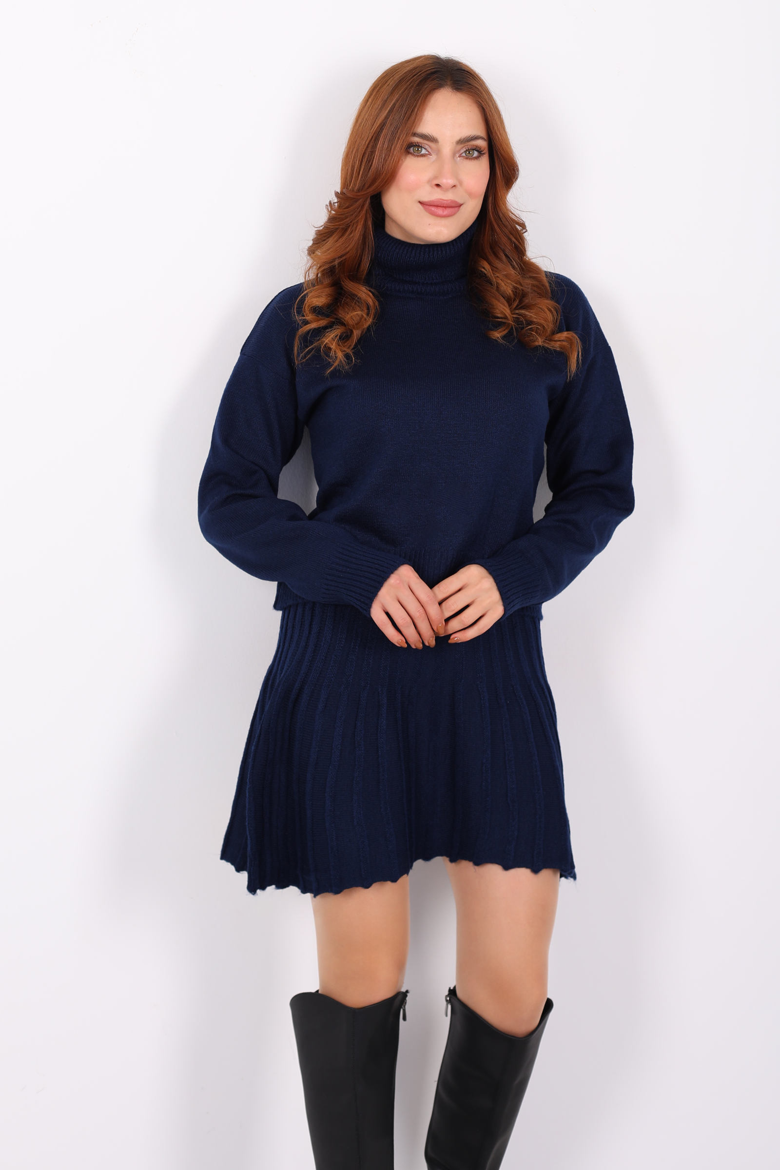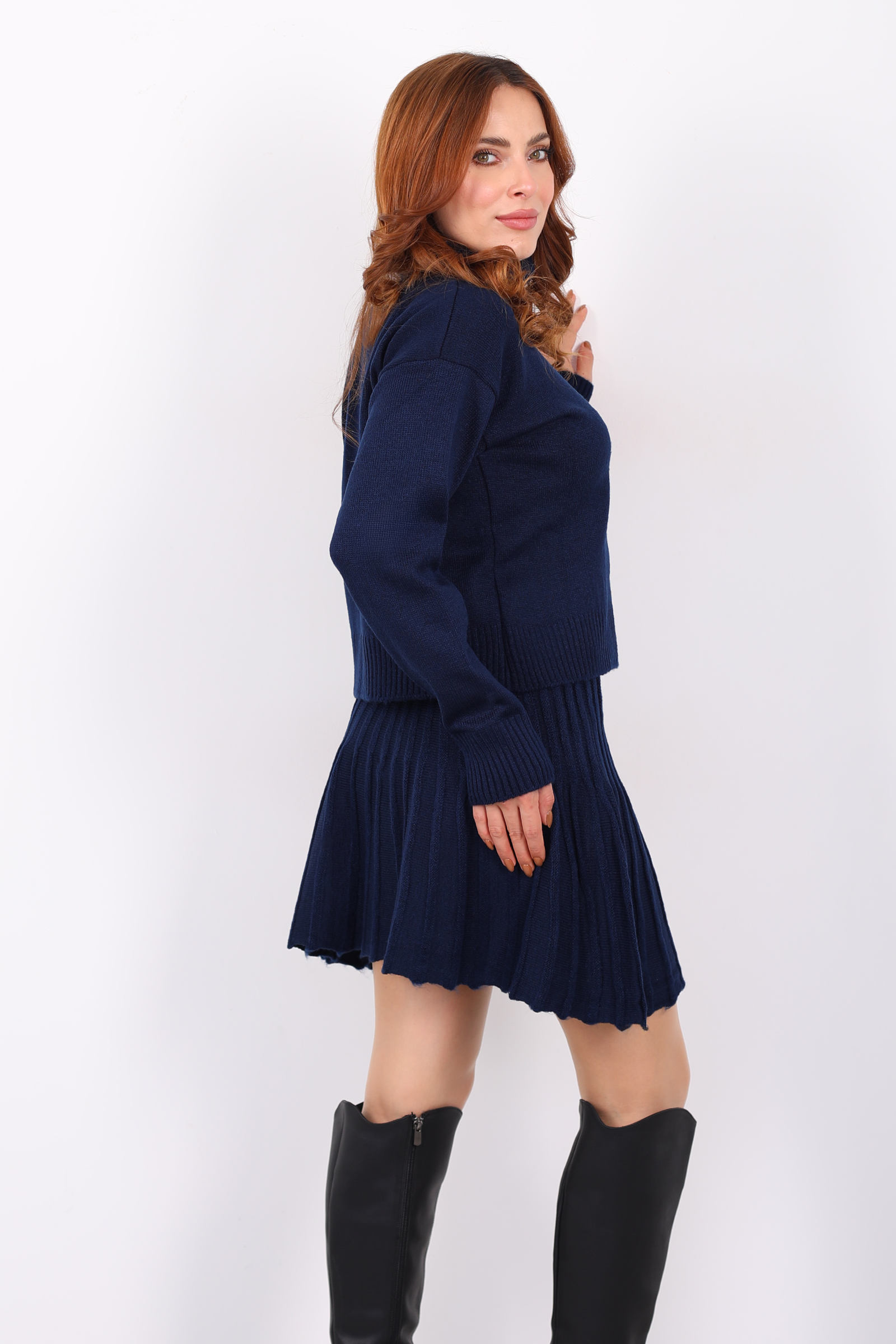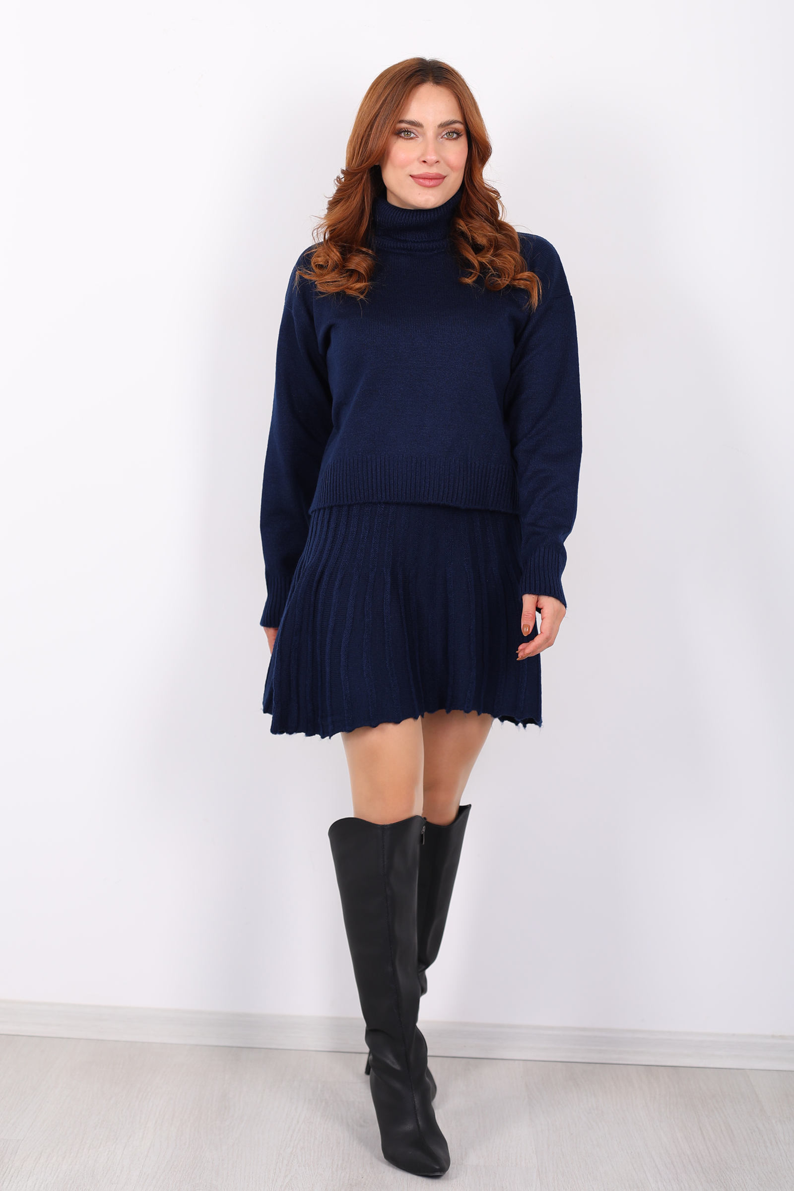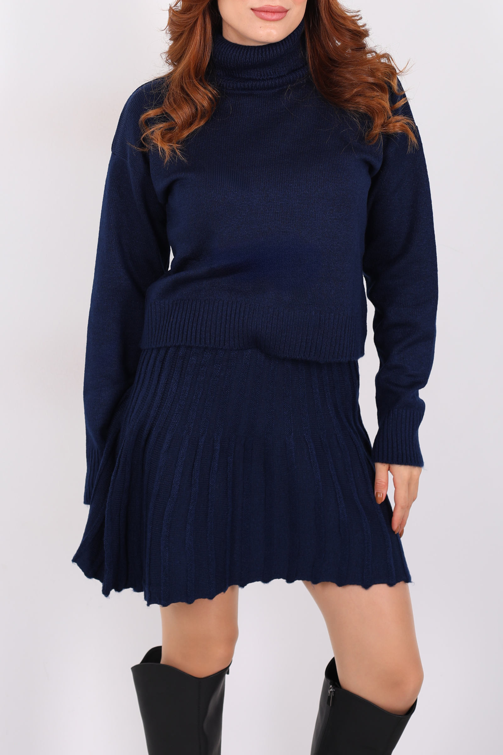 Boğazlı Eteği Pileli Kadın Lacivert Triko Takım