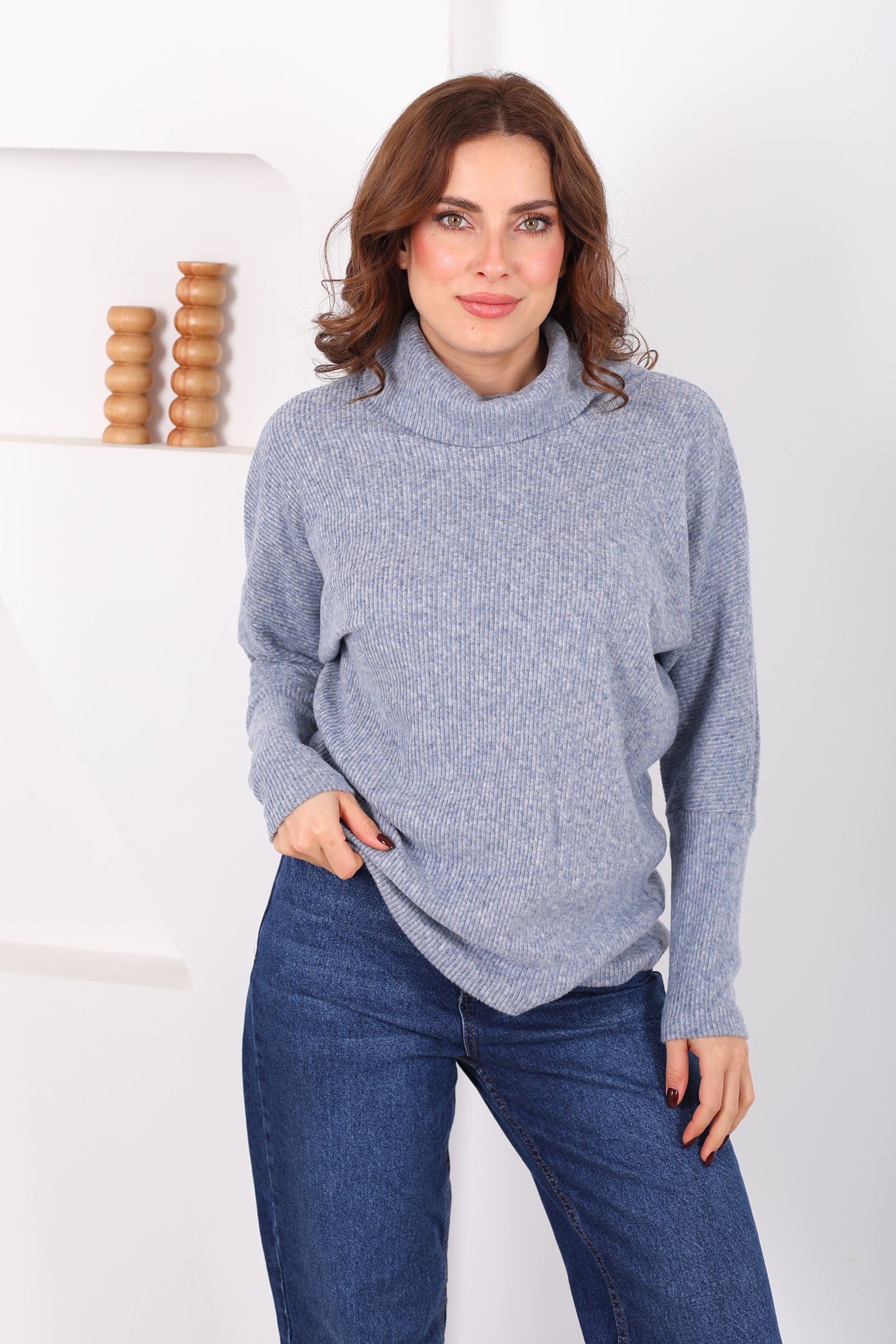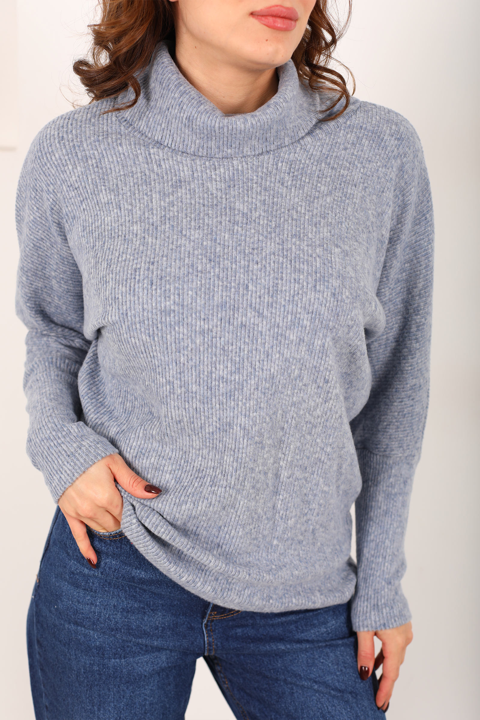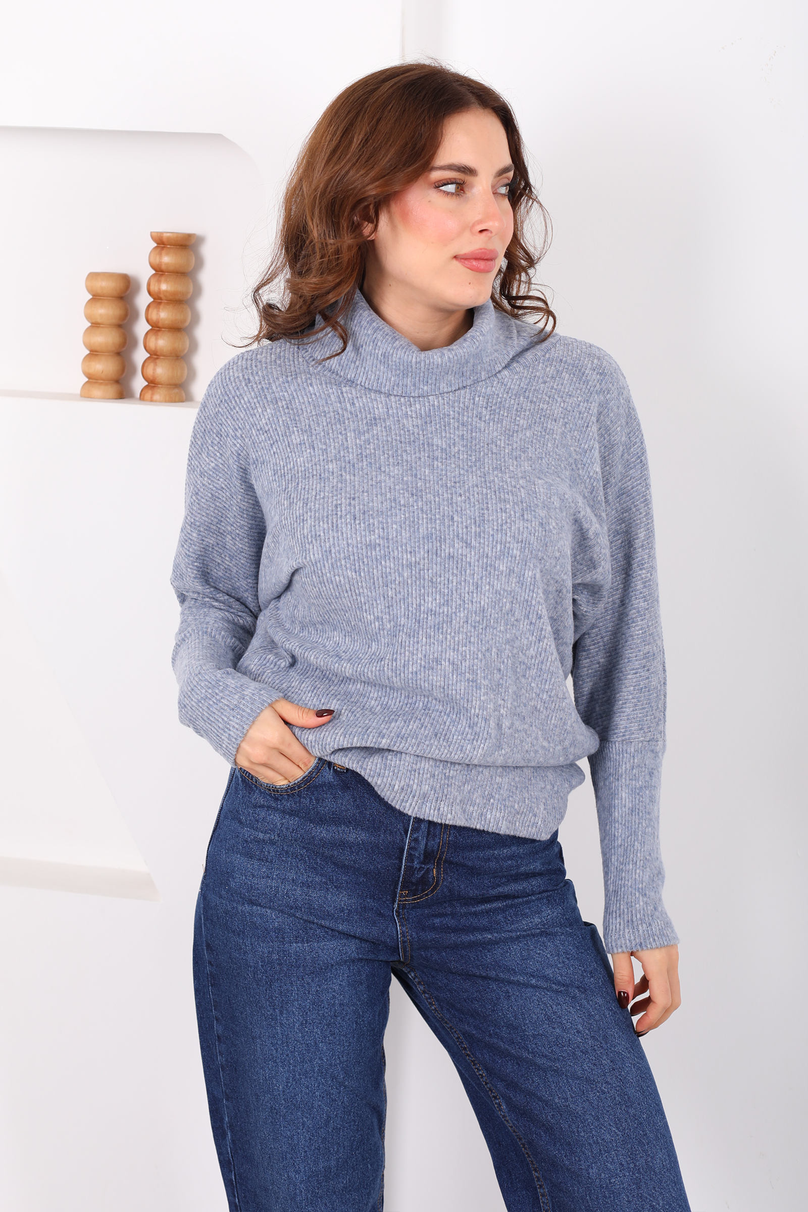 Boğazlı Yarasa Kol Mavi Kadın Triko Kazak