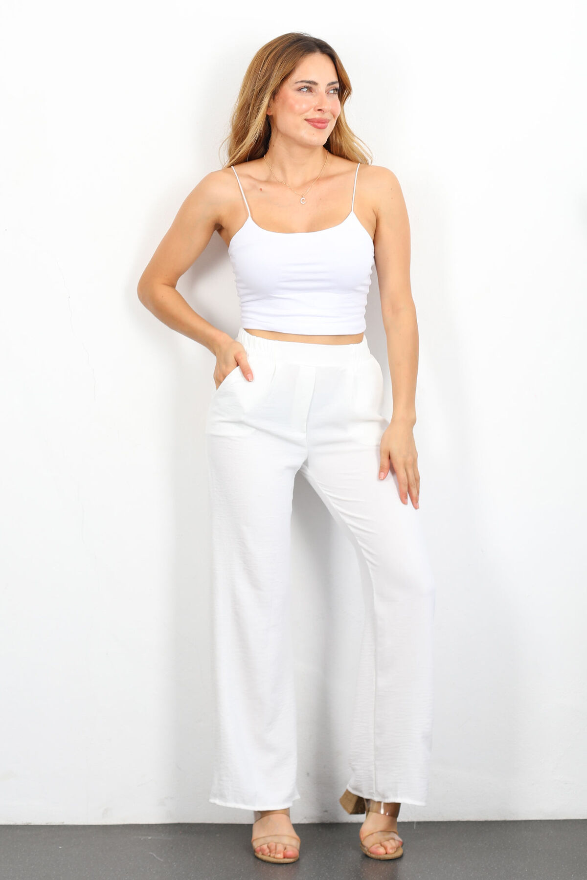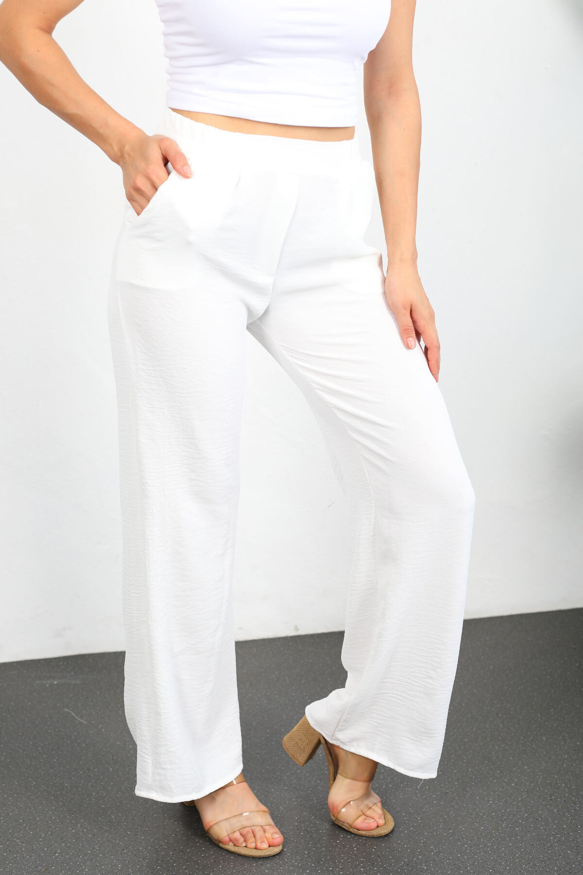 Pamuk ve polyamid karışımı Ayrobin kumaşın ferahlığıyla bezenmiş bu beyaz bol paça pantolon, ilkbaharın tazeliğini stilinize taşıyor. Hafif, dökümlü ve zarif kesimi, vücudunuzu sarmadan özgürce hareket etmenize olanak tanırken beli lastikli yapısı tüm gün boyunca konfor sunar. Ayrobin kumaş; nefes alabilen, kırışmaya dayanıklı ve ütü istemeyen pratikliği ile özellikle sıcak günlerde bile kendinizi serin ve rahat hissettirir. Gündelik kombininizi beyaz sneaker’larla tamamlayabilir veya zarif bir bluzla ön plana çıkararak sade zarafeti yakalayabilirsiniz.