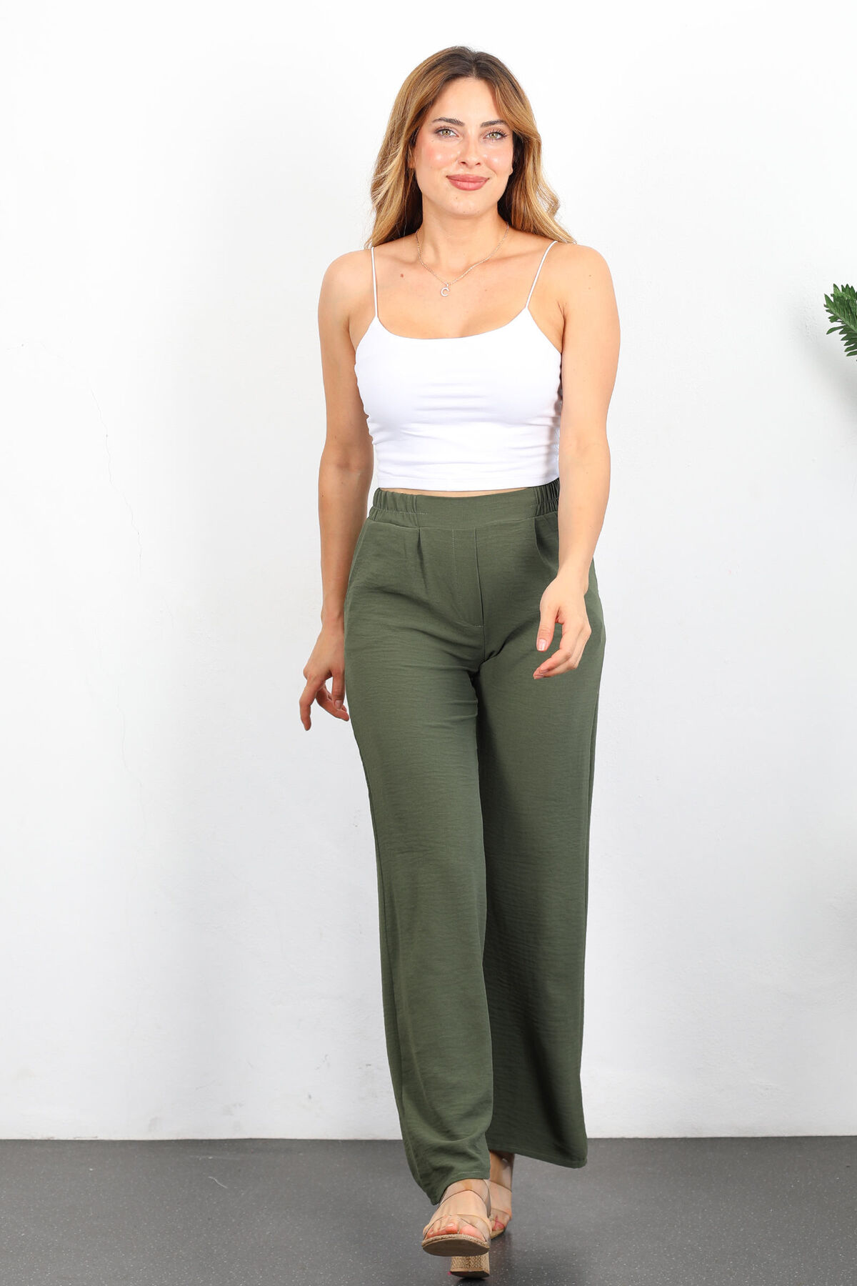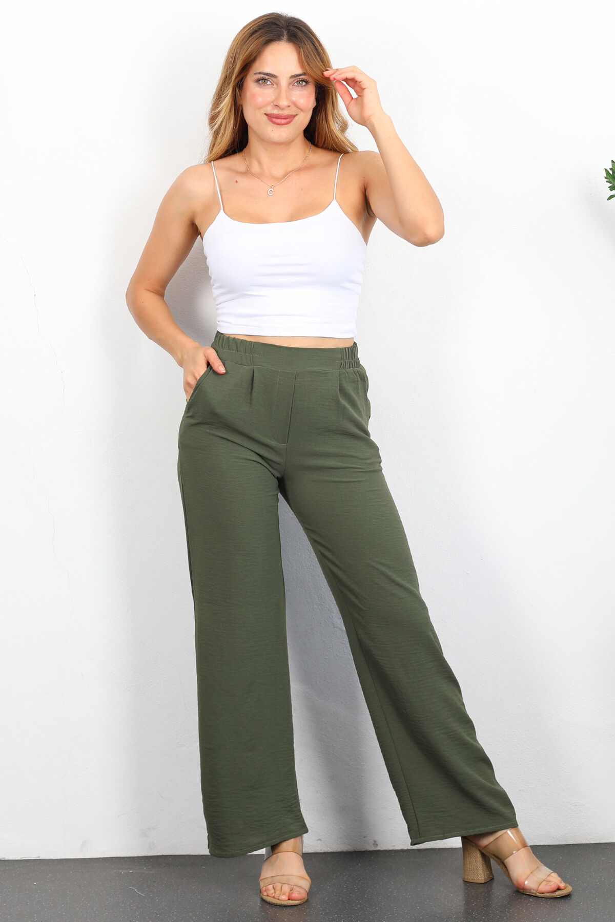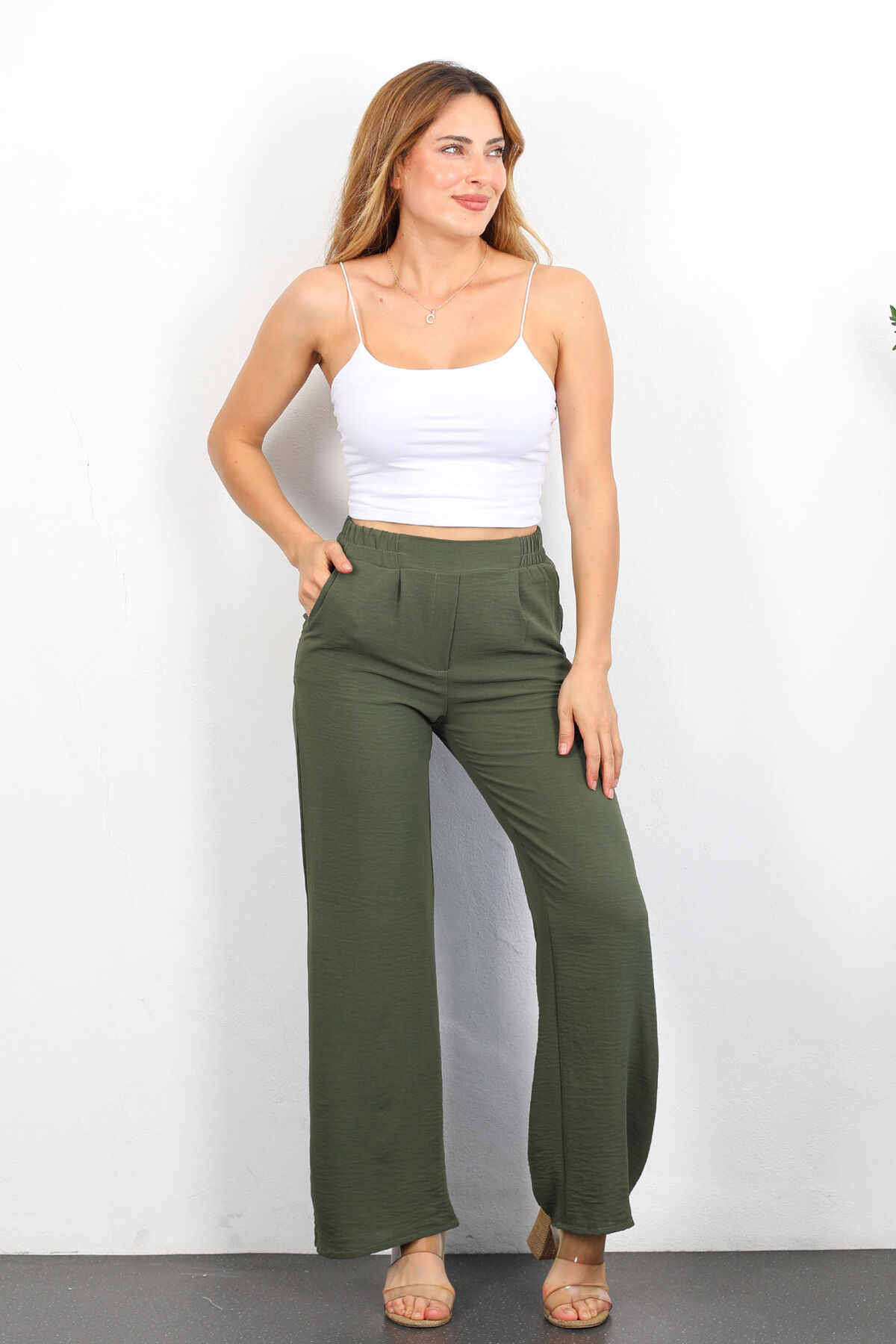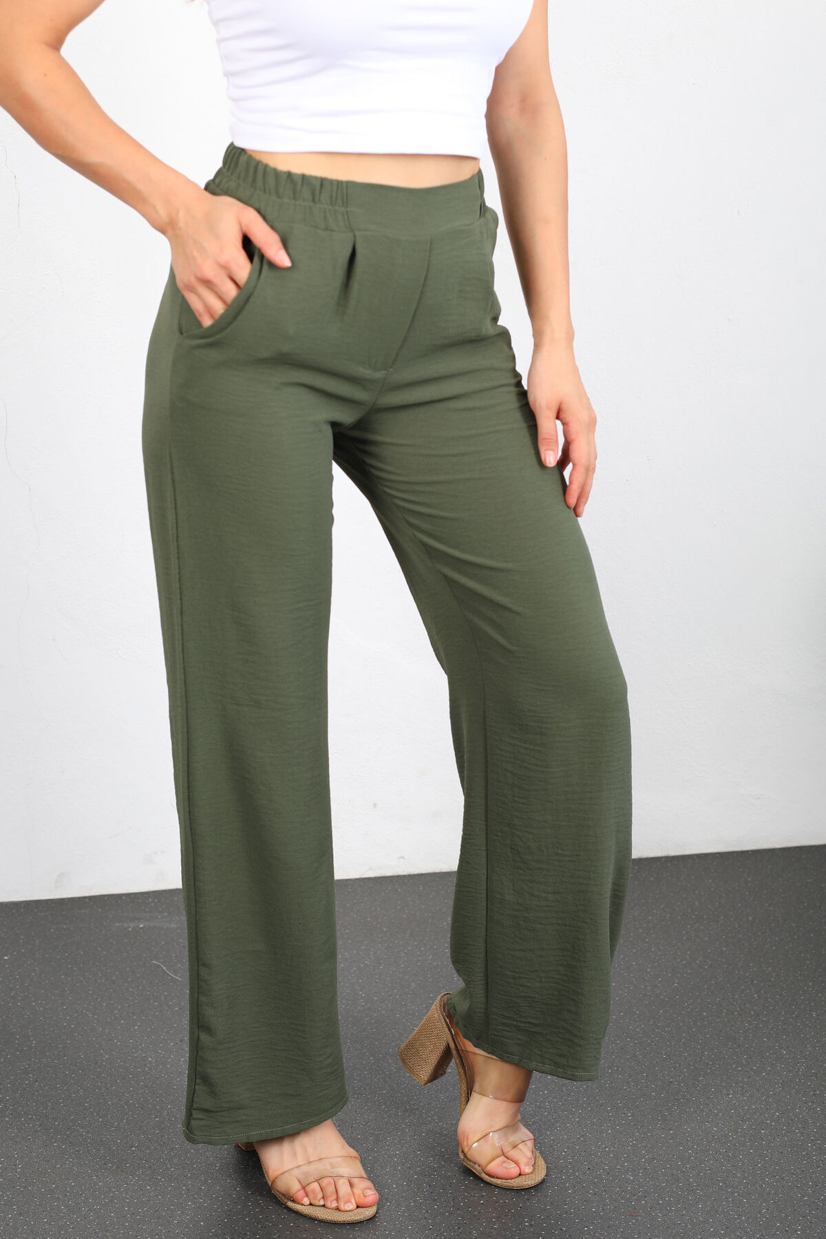 Doğanın Ritmini Hissiyle Kucaklayın: Bol Paça Ayrobin Haki Pantolon Haki renginin huzur veren doğallığını yansıtan bu bol paça pantolon, hafif ve dökümlü Ayrobin kumaşı sayesinde tüm gün süren bir konfor vaadi sunar. Pantolonun akışkan silueti, hareketlerinizle birlikte zarif bir dansa dönüşürken beldeki lastik dokunuşu sizi nazikçe kavrar, rahatlığınızdan asla ödün vermez. Ayrobin kumaş, nefes alabilen ve kırışmaya dirençli yapısıyla sıcak günlerde bile ferahlık sağlar.