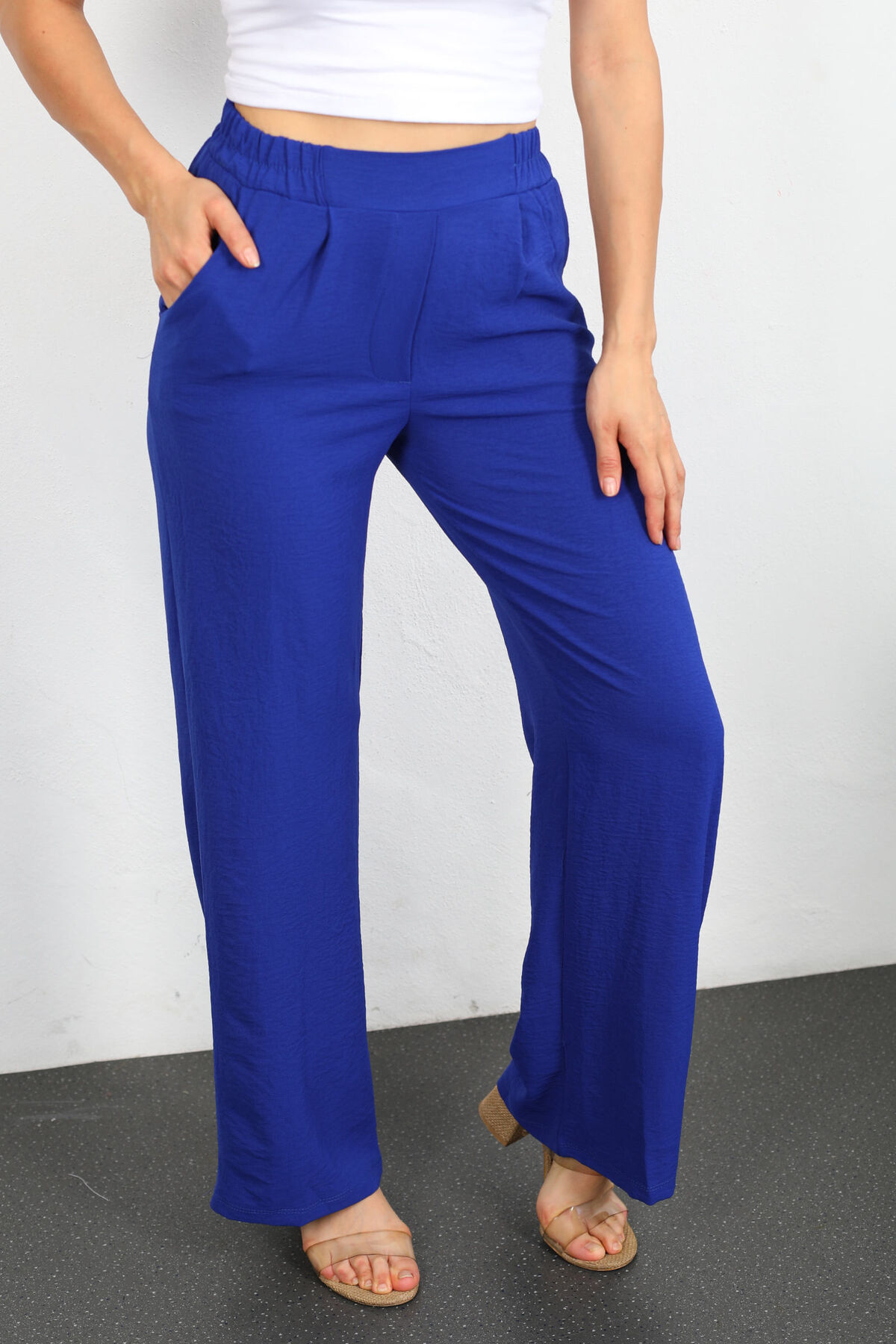 Gökyüzünün Akışını Pantolonunuza Taşıyın: Bol Paça Saks Mavisi Ayrobin Pantolon Saks mavisinin ferahlatan enerjisini modern bir zarafetle buluşturan bu bol paça pantolon, her adımda özgürlüğü ve rahatlığı hissettirir. Ayrobin kumaşın nefes alabilen ve dökümlü yapısı, üzerinizde zarif bir akış sunarken, belindeki lastik detay tüm gün boyunca konforunuzu garanti eder. Gündelik stilinizi sneakers ile dinamikleştirebileceğiniz gibi; şık bir bluz ve topuklu ayakkabılarla sofistike bir vurguda bulunmanız da mümkün.