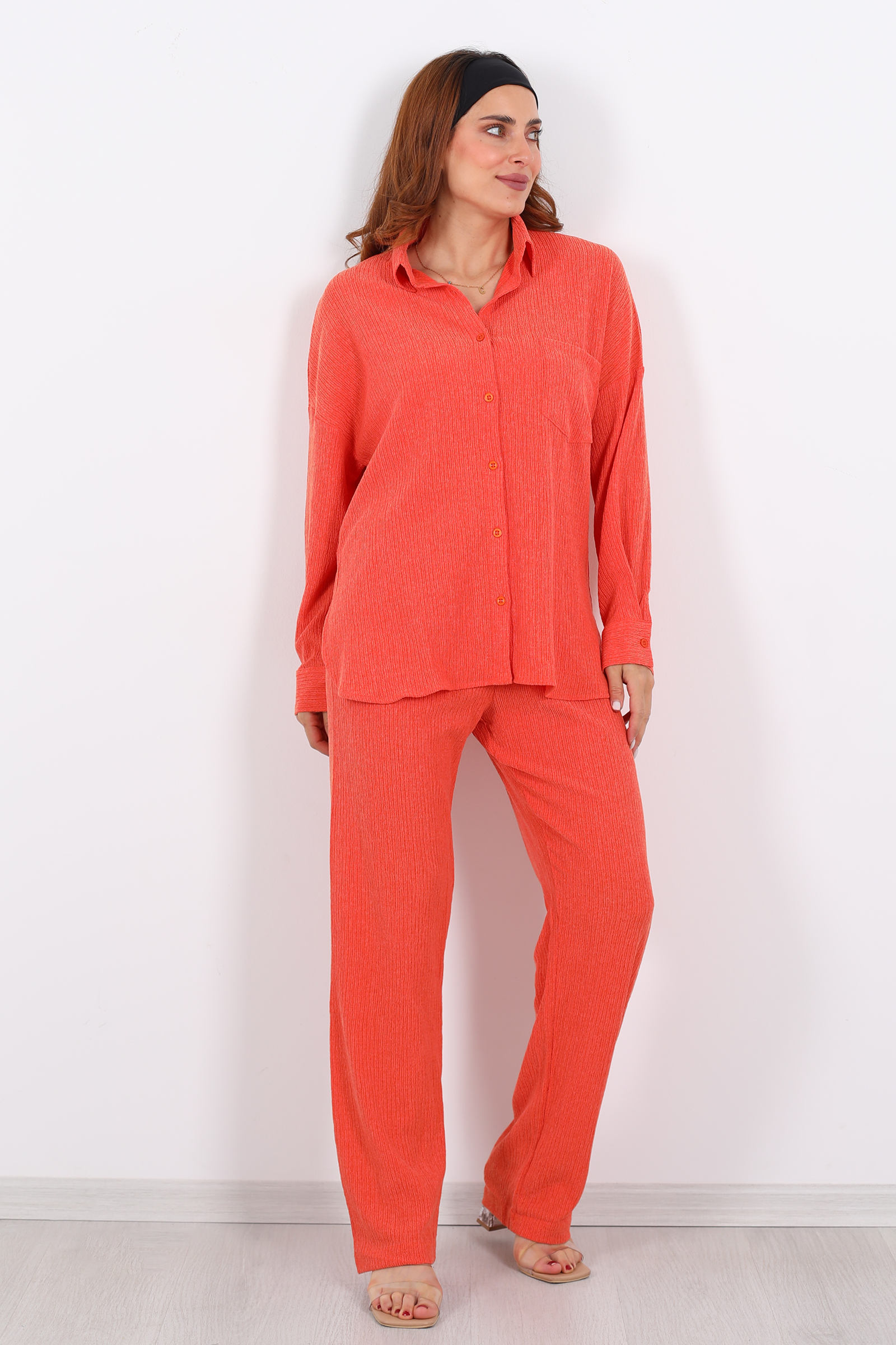 Günlük yaşamın hızlı temposunda, şıklığı ve rahatlığı bir arada sunan bu turuncu rengi gömlek takımı, gardırobunuzun vazgeçilmezi olmaya aday. %95 polyester ve %5 likra karışımı kumaşı sayesinde hafif, esnek ve nefes alabilir bir yapı sunar, böylece hem rahat hem de şık bir kullanım sağlar. Bürümcük kumaş dokusu, takıma sofistike bir hava katıyor. Normal kalıp kesimi ve bol paça pantolonuyla vücuda oturmaz, rahat bir kullanım sağlar. Turuncu rengi ise enerjik bir hava katar ve dikkatleri üzerinize çeker.