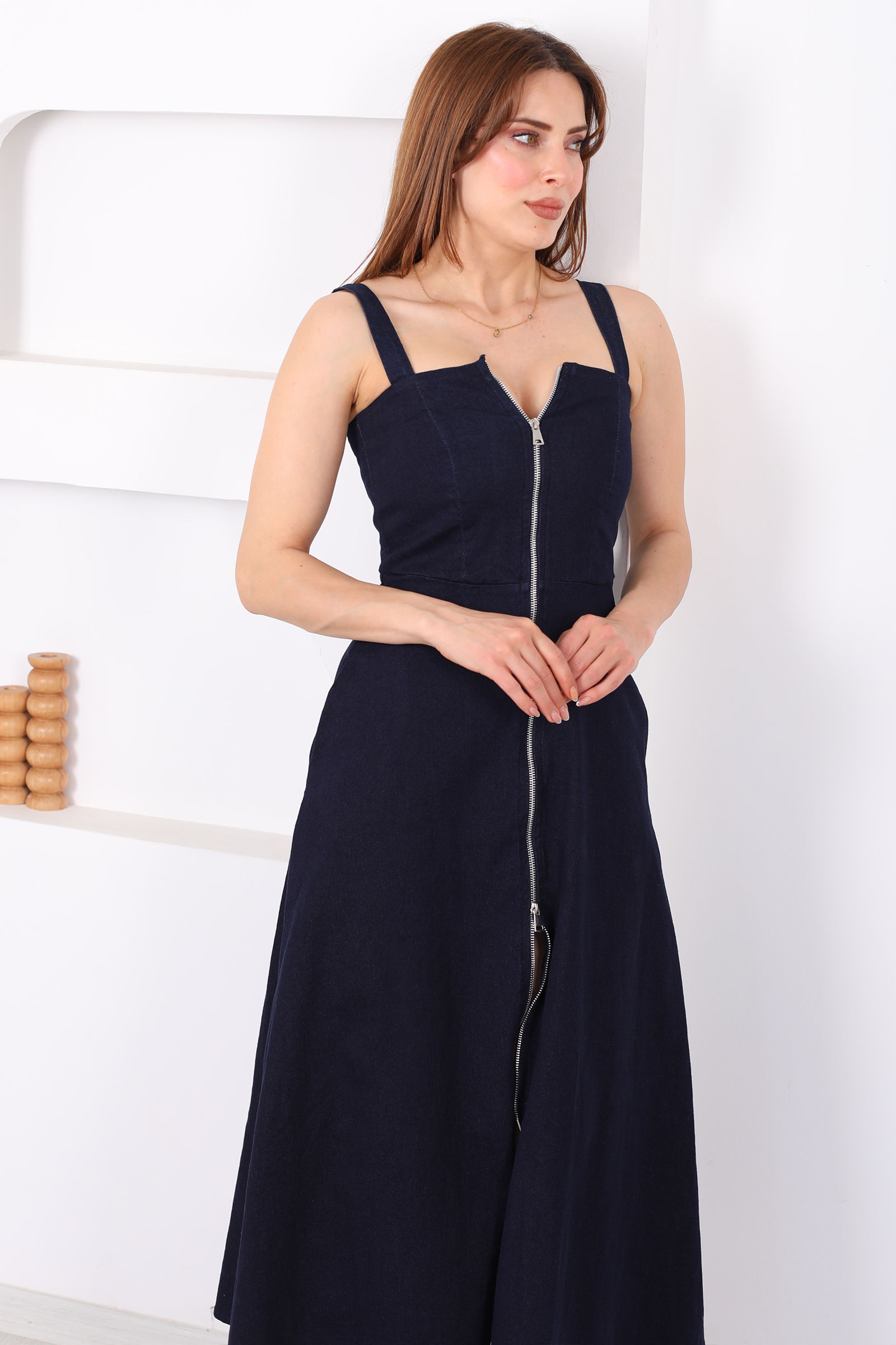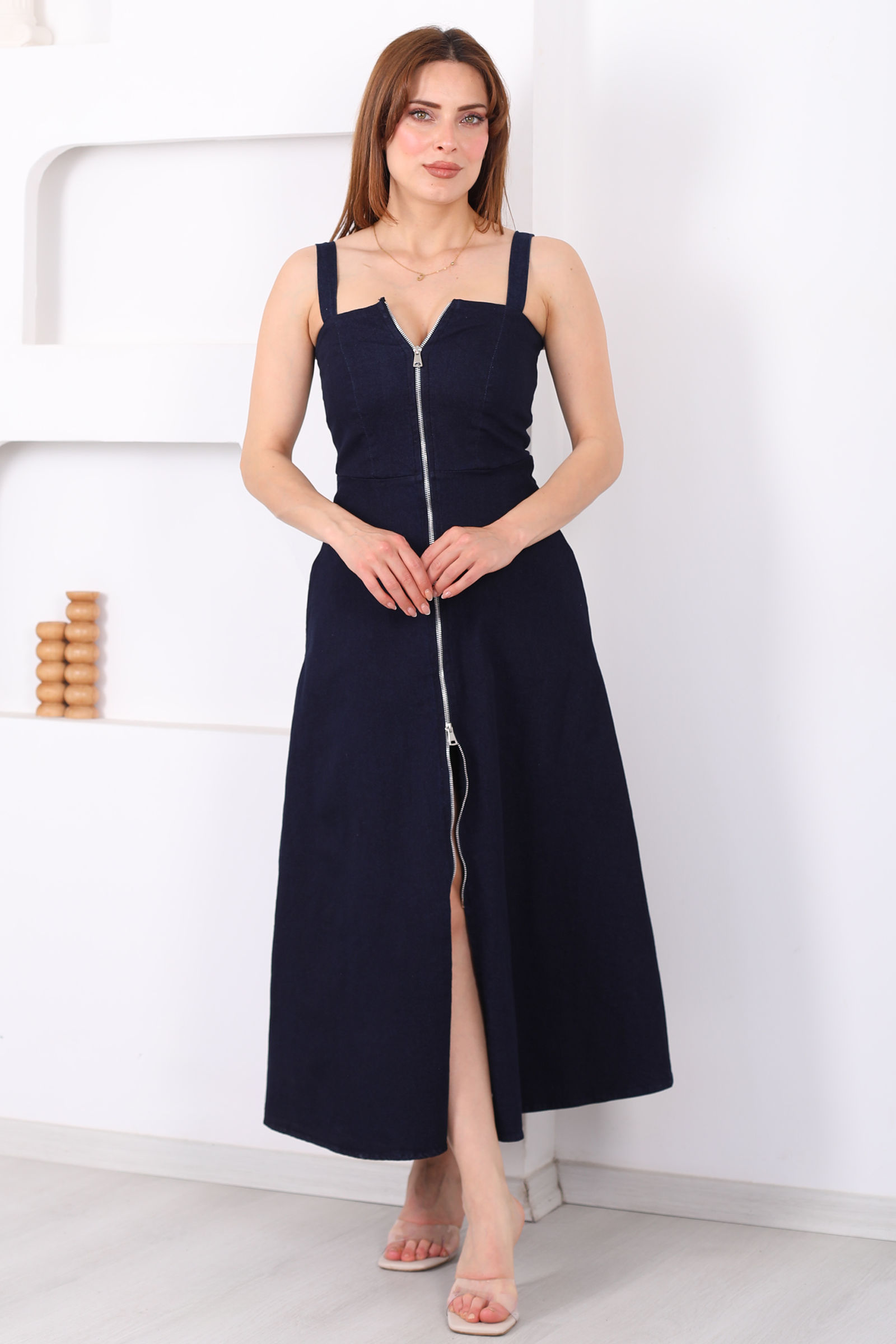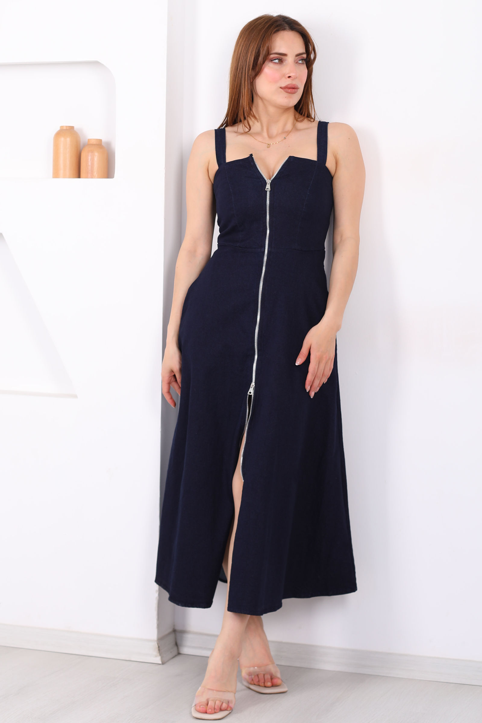 Boydan Fermuarlı Önü Yırtmaçlı Kadın Lacivert Denim Elbise
