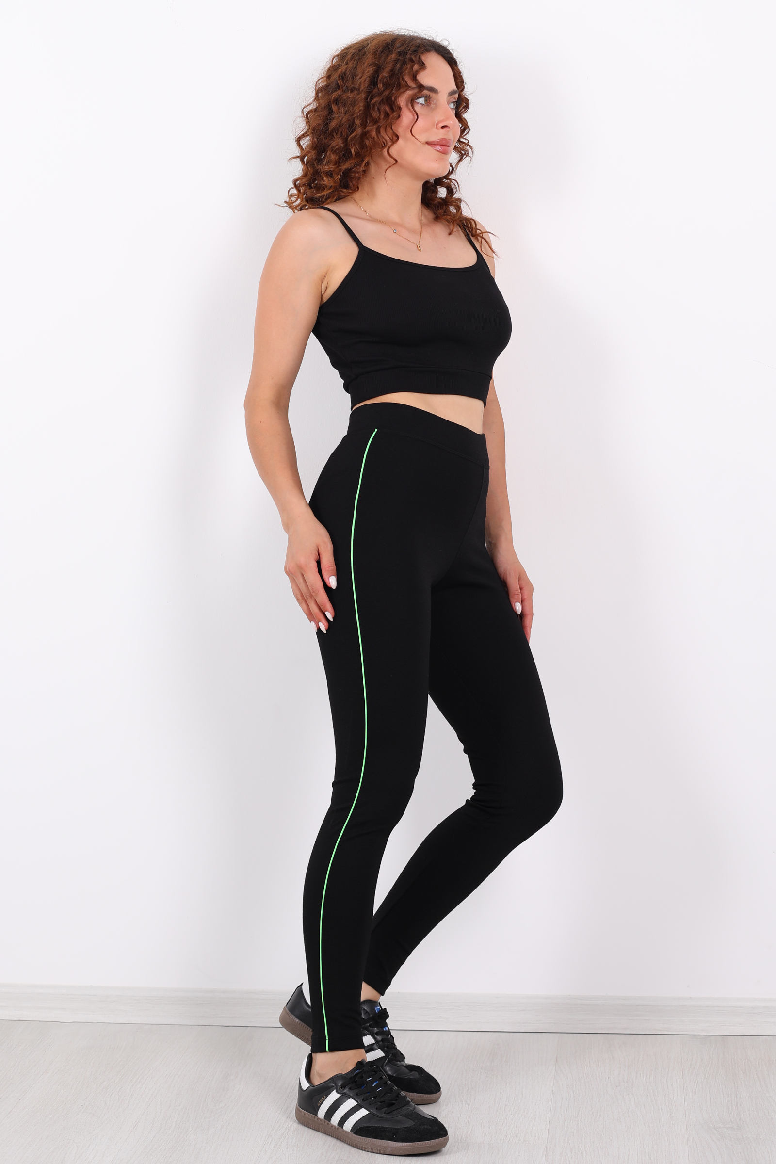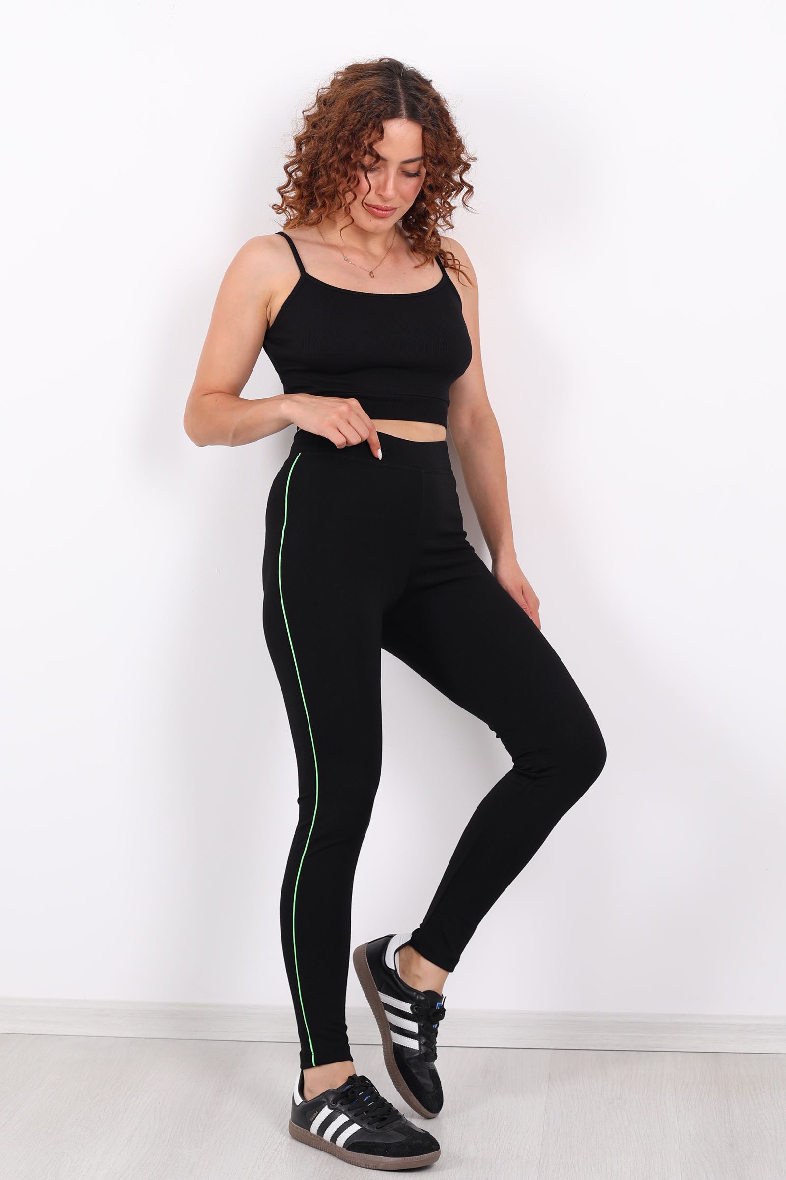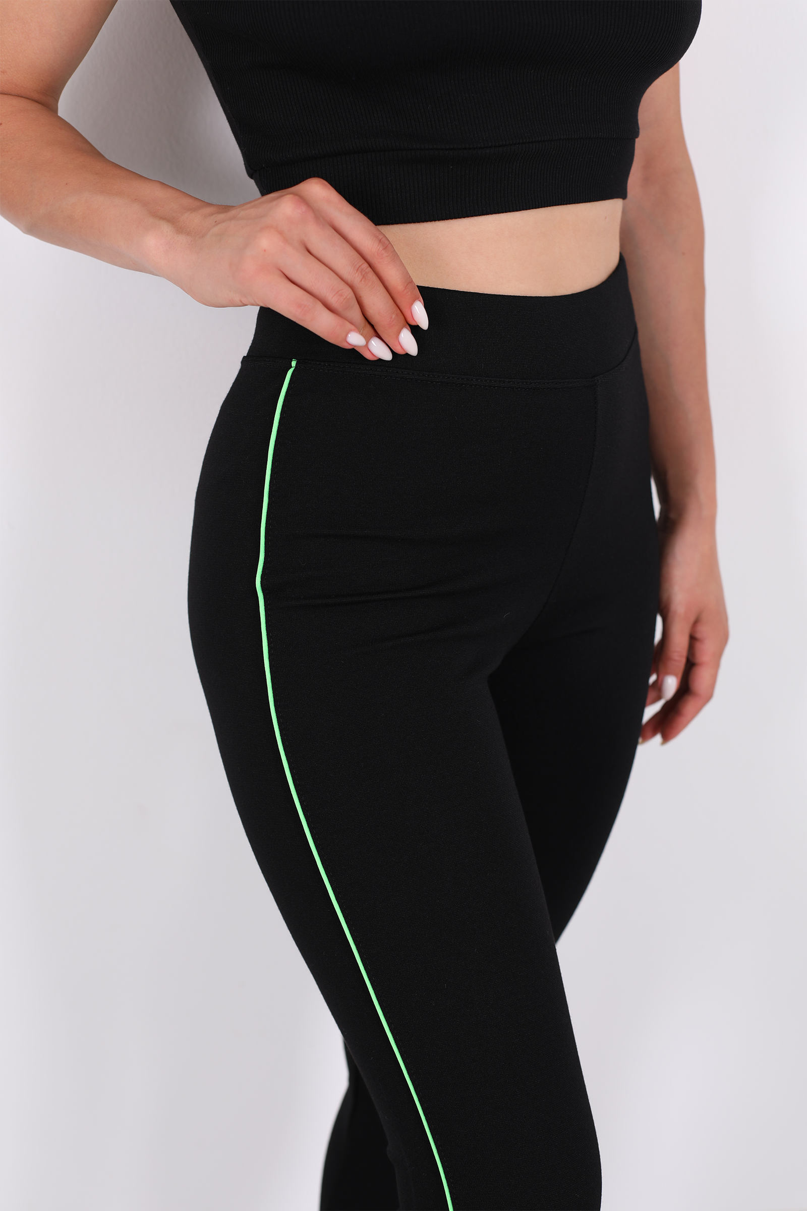 Siyahın asaletiyle yeşil şeridin enerjisini bir araya getiren bu tayt, spor ruhunu modern stille harmanlıyor. Şerit detayı, bacak boyunca süzülerek sade siluete dikkat çekici bir hareket getirirken, form tutan çelik örgü kumaşı her adımda sizi destekliyor.Siyahın klasik görünümüne canlı bir hava katan bu taytı, oversize sweatshirtler veya minimalist crop üstlerle kombinleyerek günlük stilinizi anında dinamikleştirebilirsiniz.