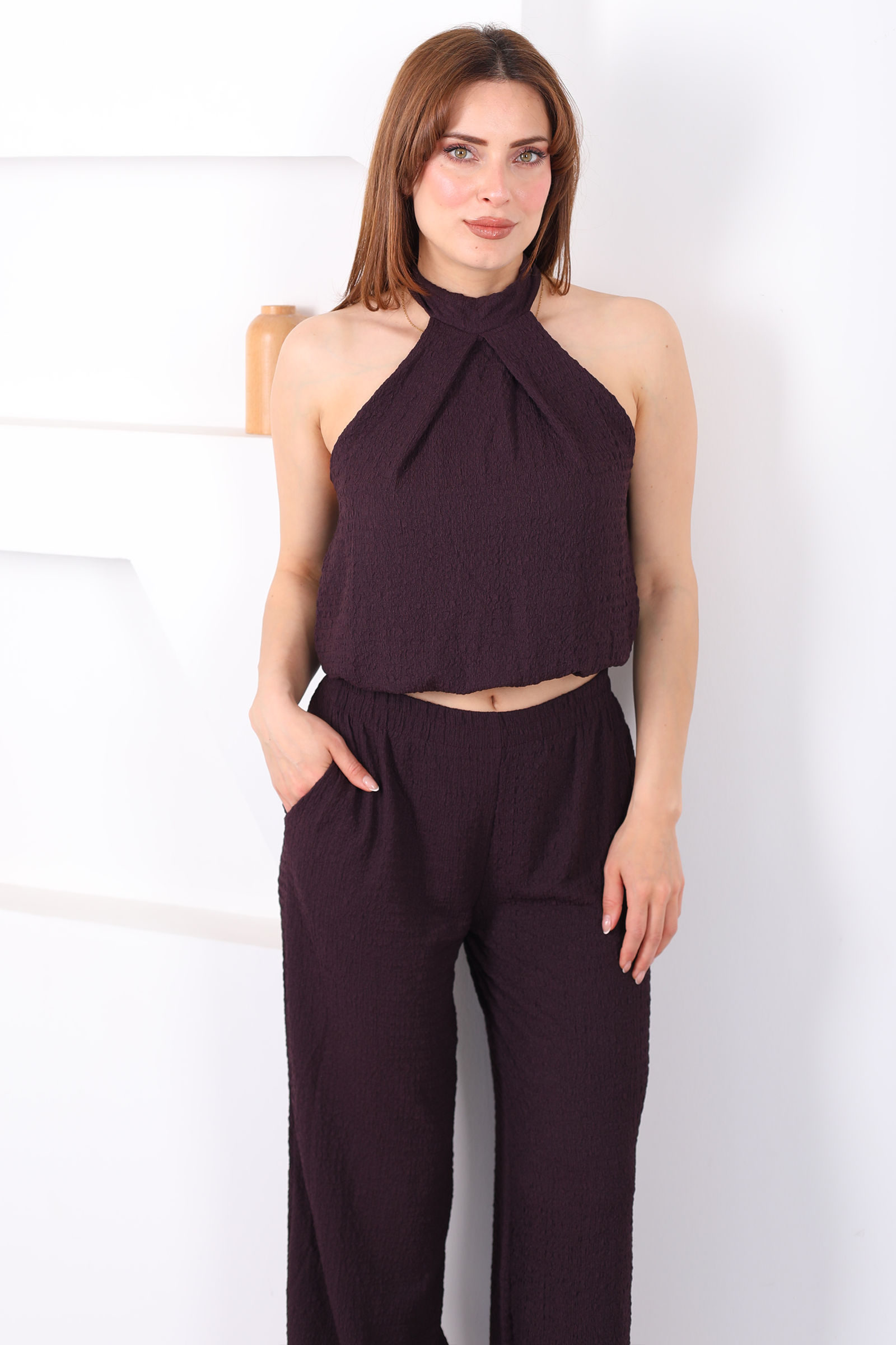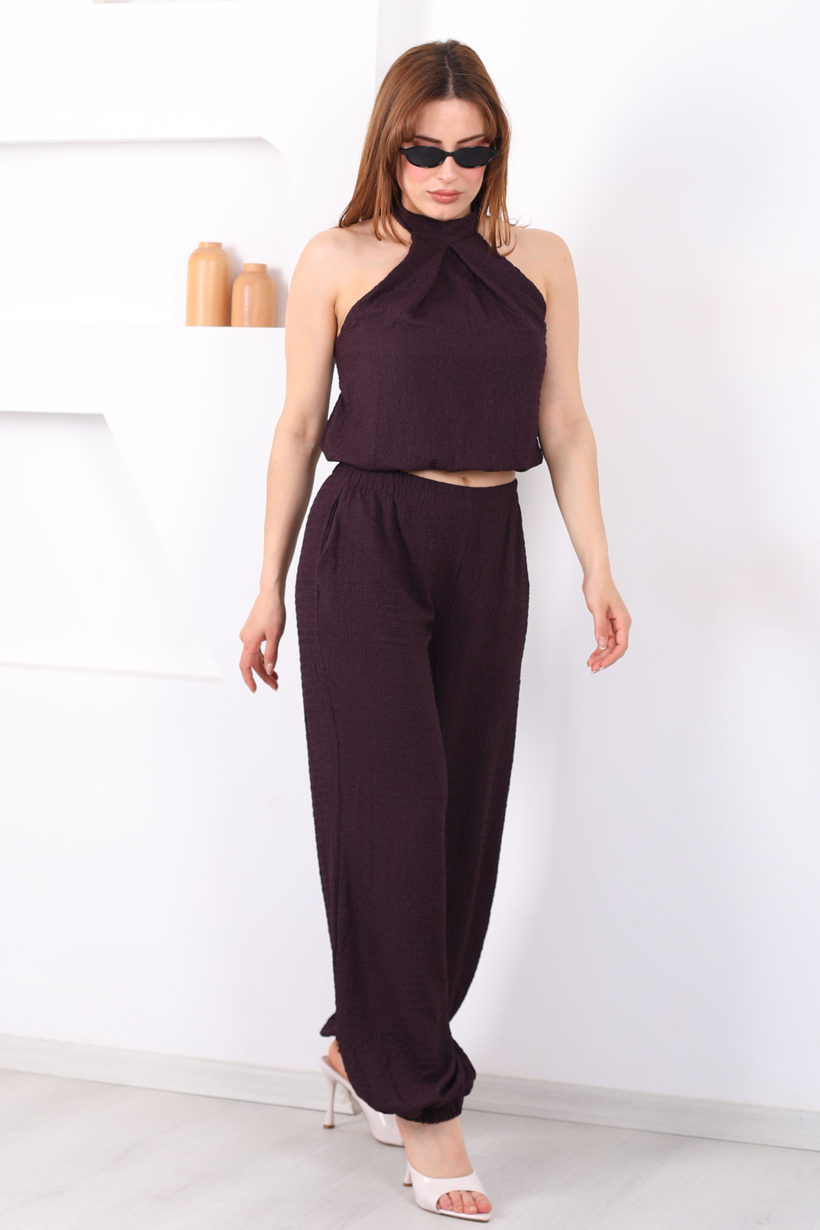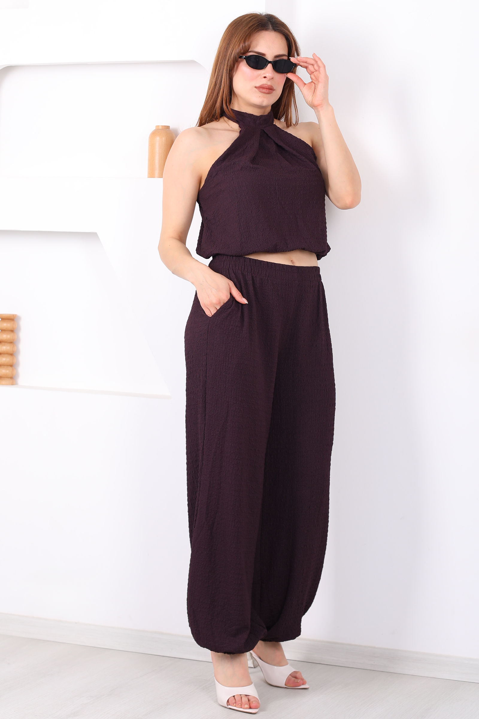 Boyundan Bağlamalı Paça Lastikli Mor Kadın Pantolon Takım