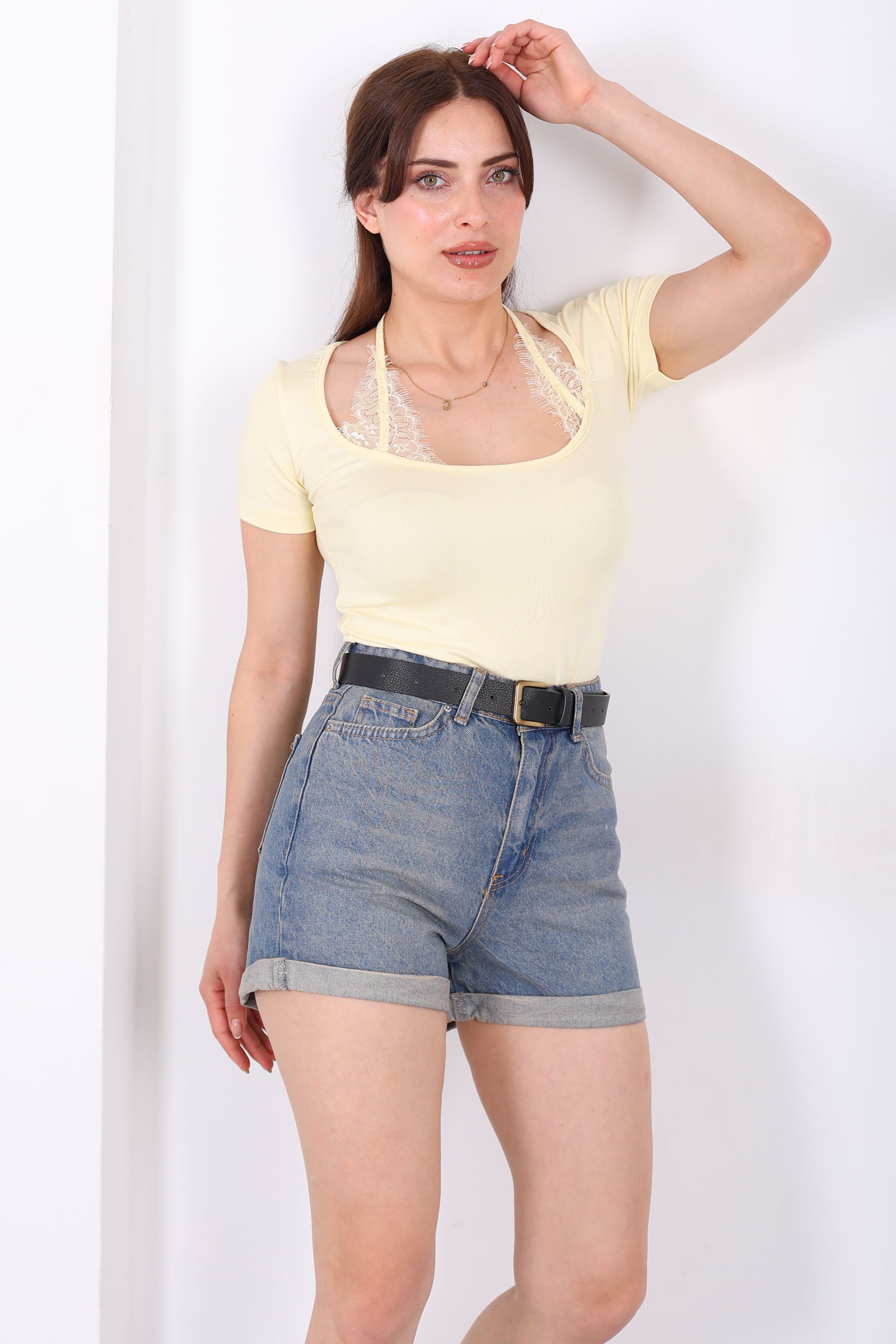 Boyundan Dantel Bağlamalı Kadın Sarı Body