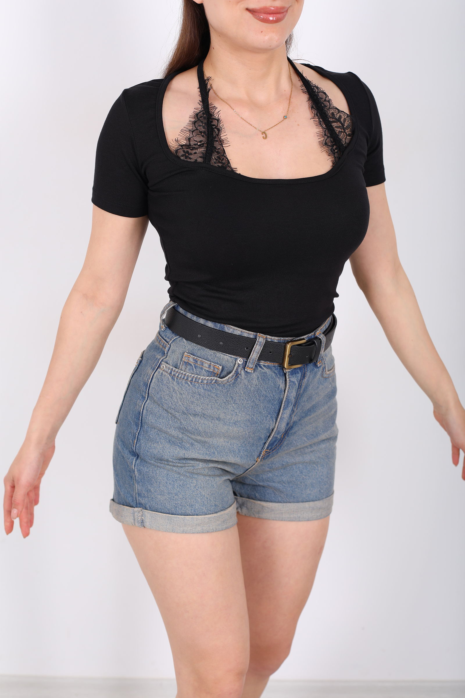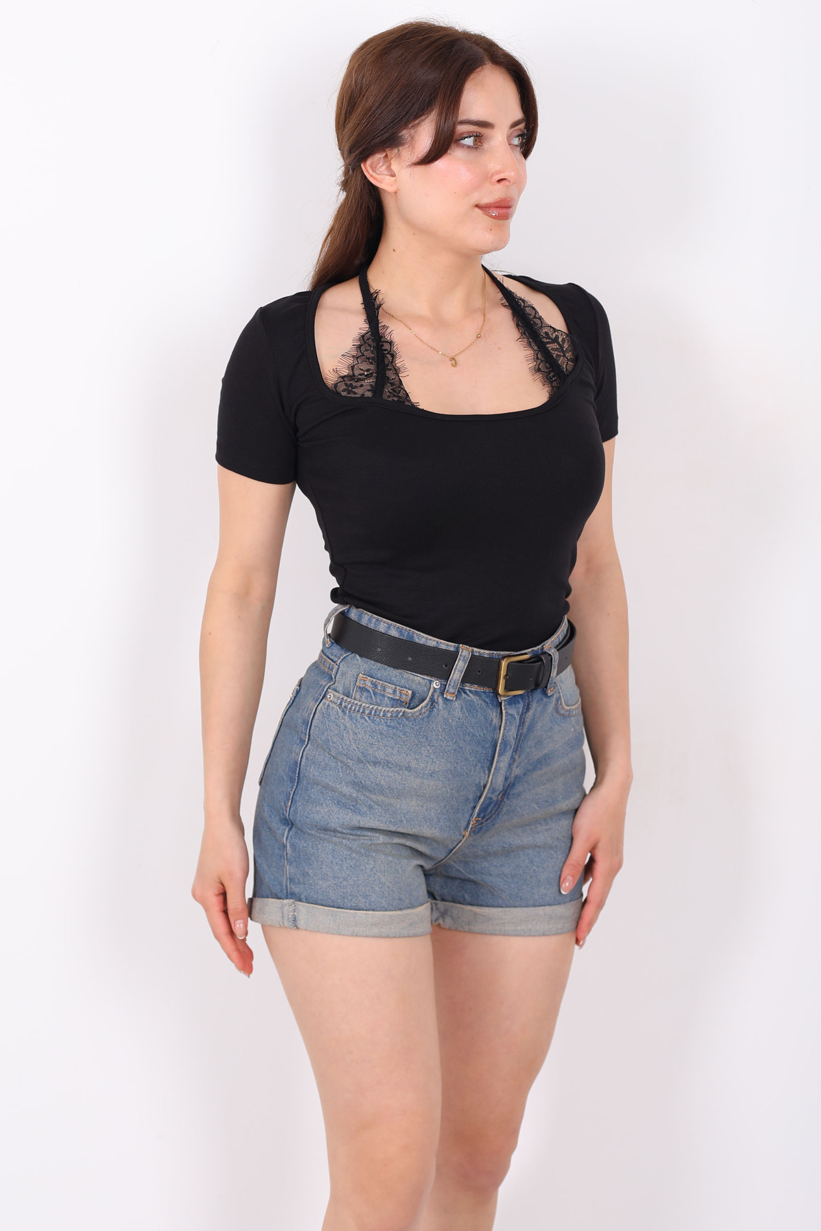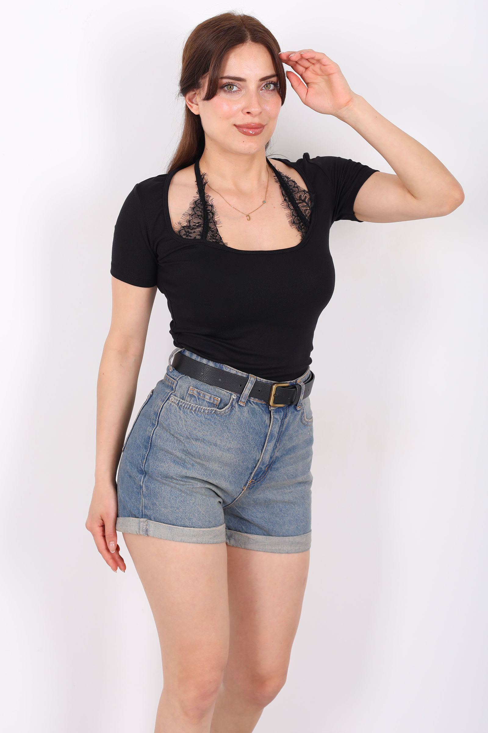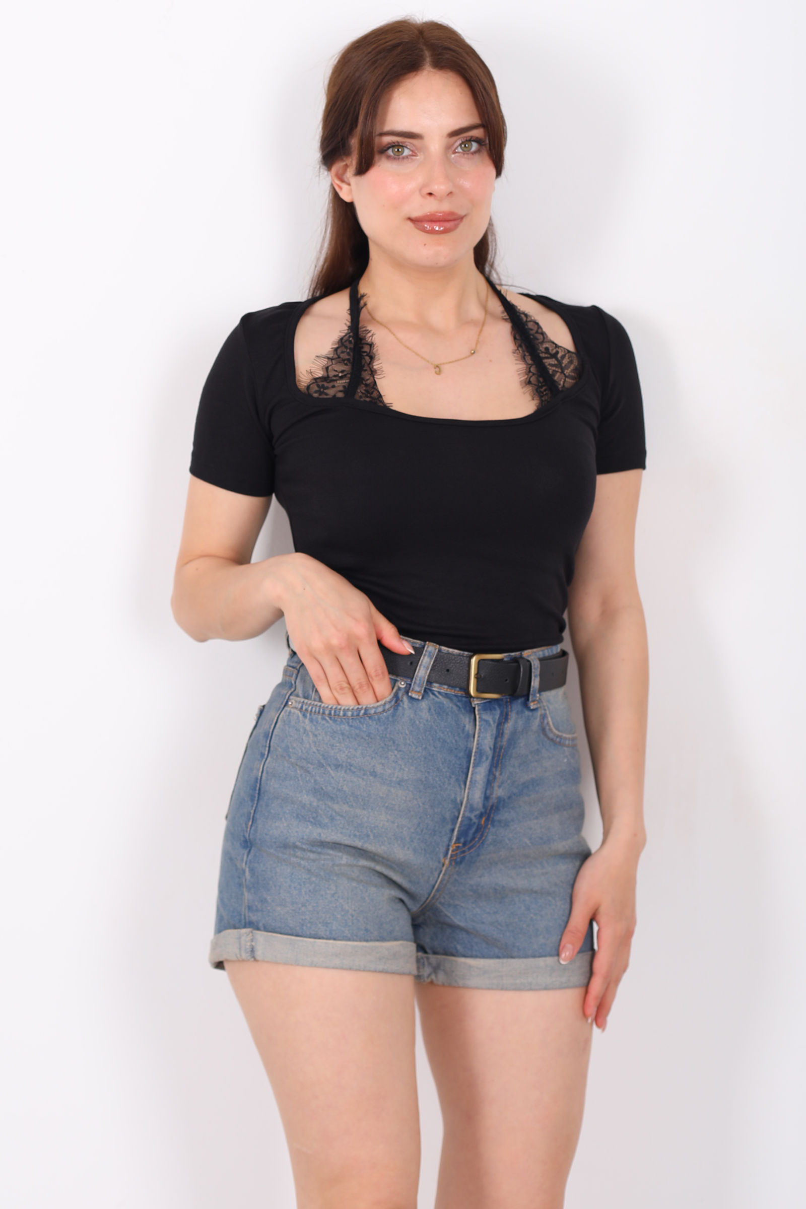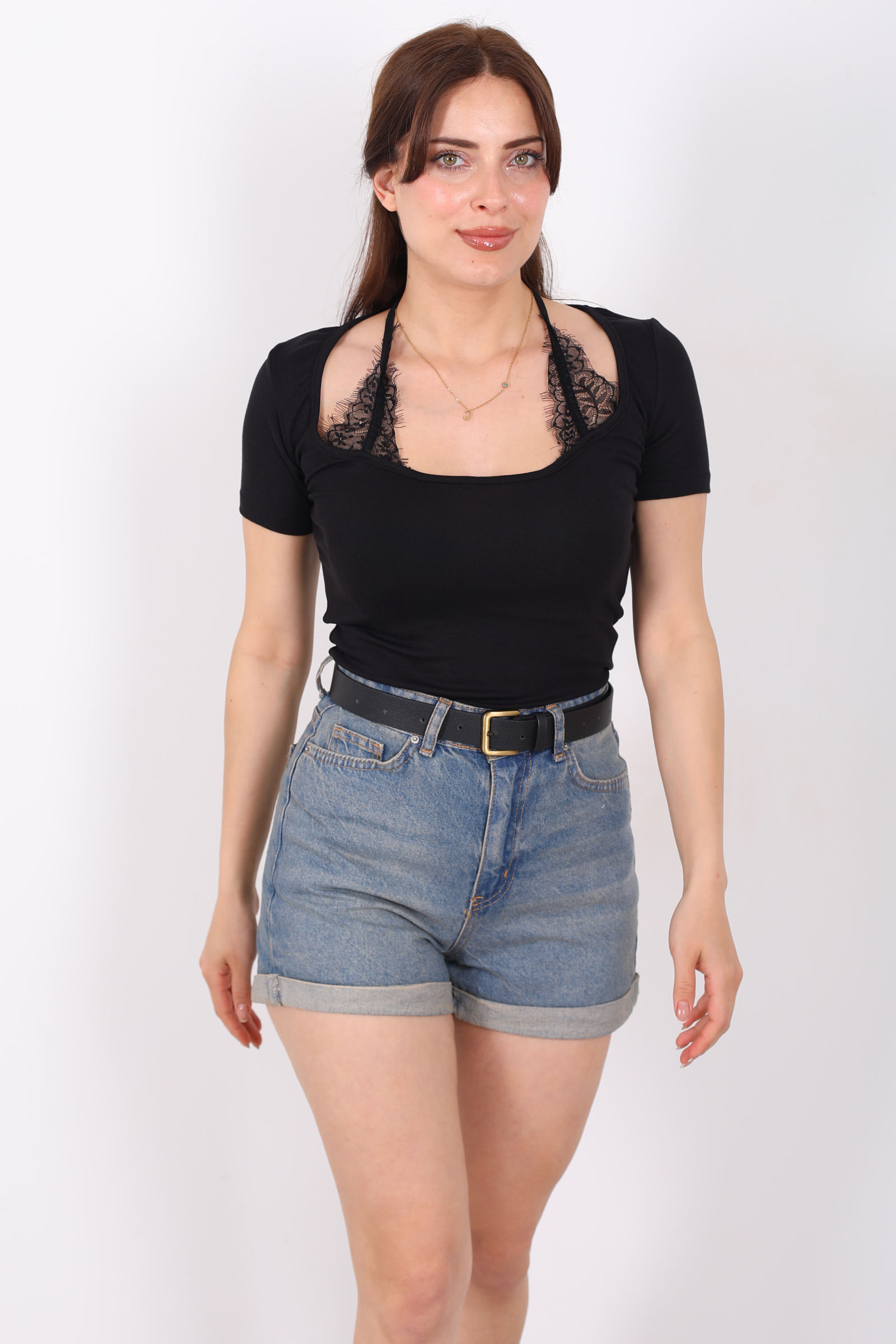 Boyundan Dantel Bağlamalı Kadın Siyah Body