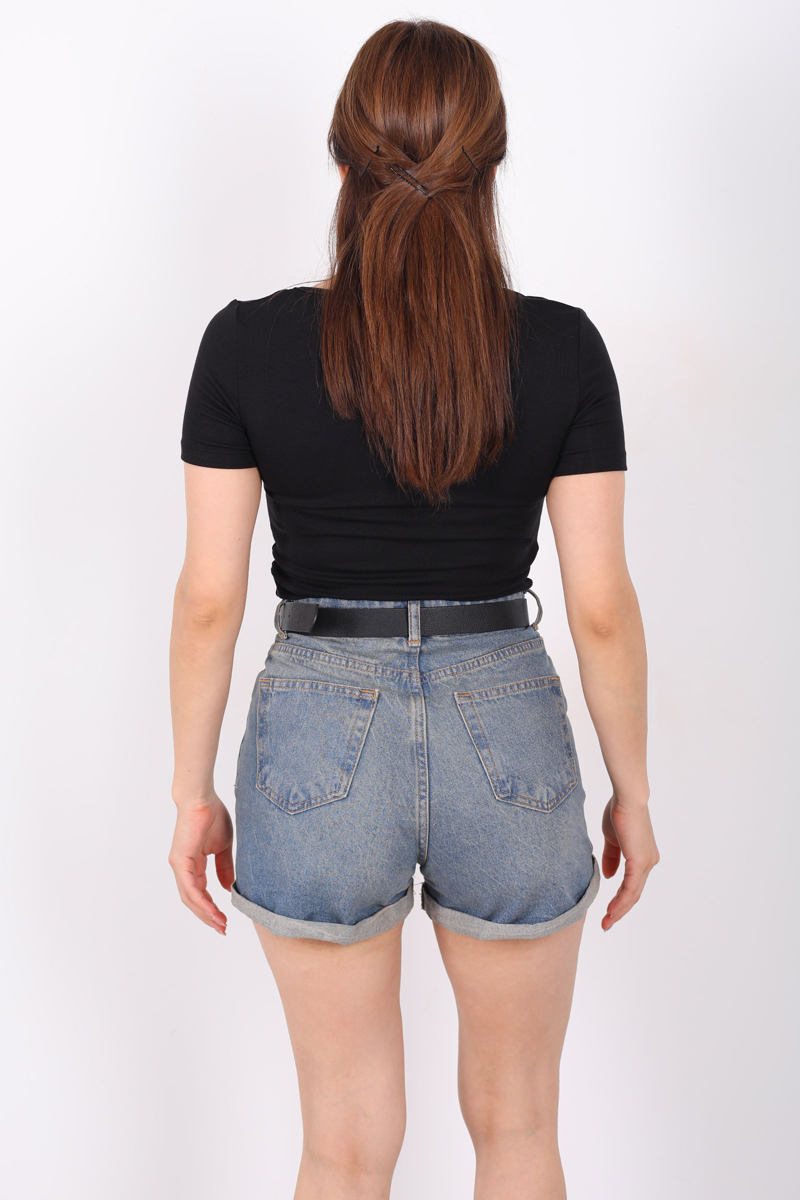 Çizgili Düğmeli Yandan Büzgülü Siyah Kadın Body