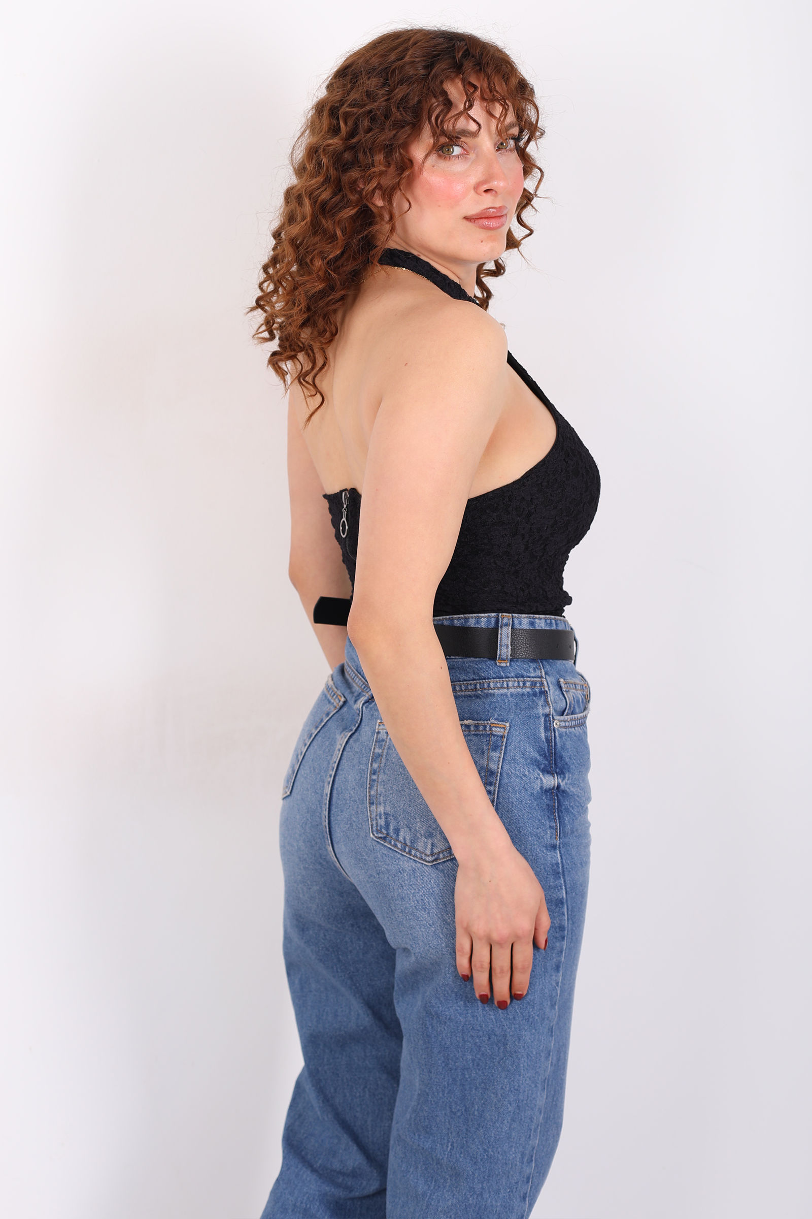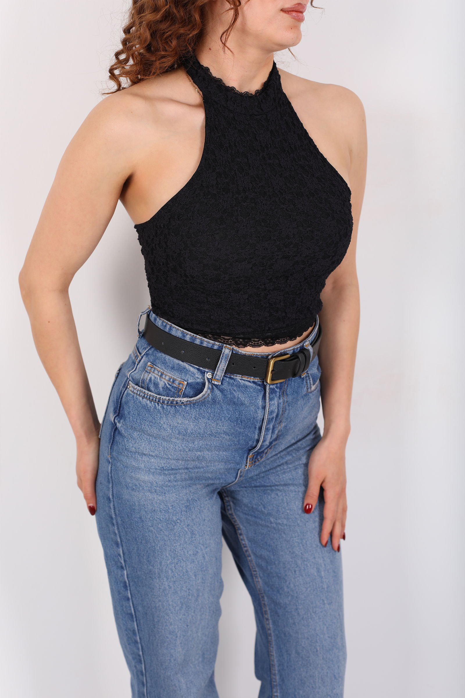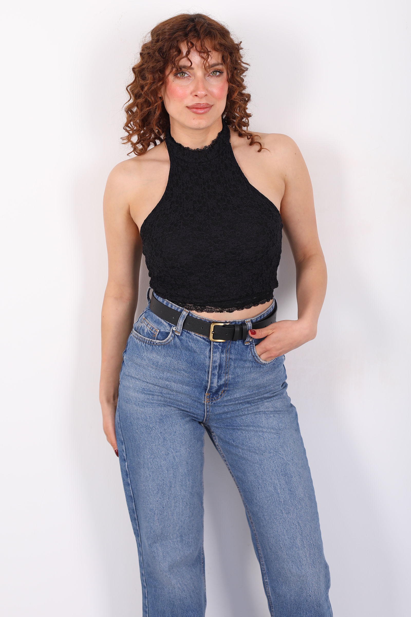 Boyundan Geçirmeli Sırtı Açık Siyah Kadın Dantel Crop