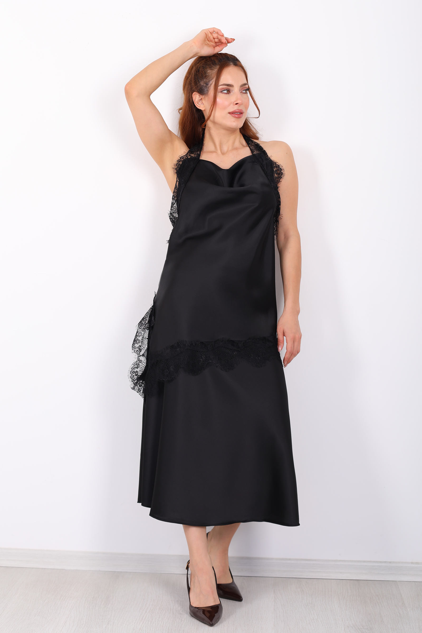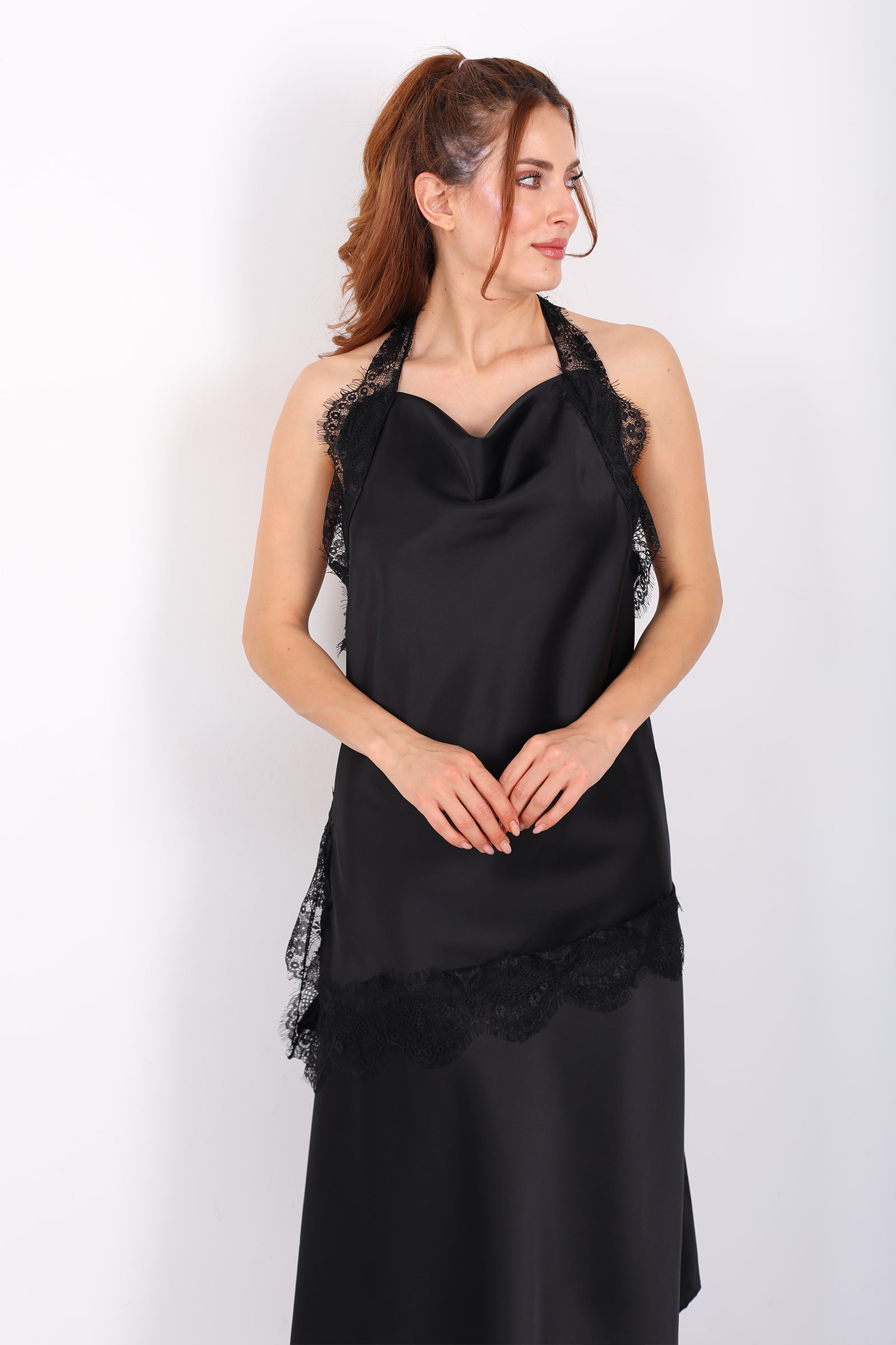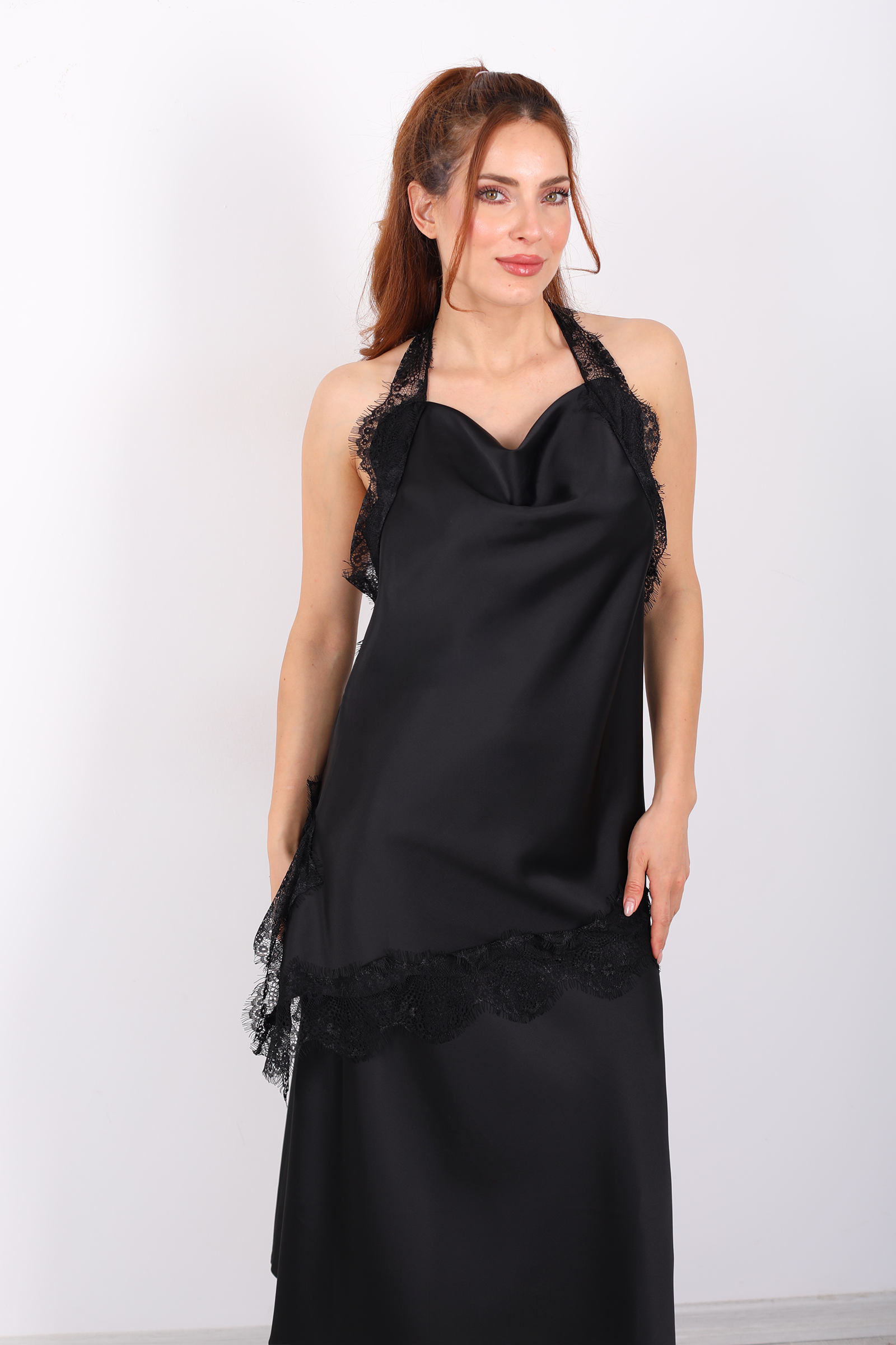 Boyundan Tül Bağlamalı Siyah Kadın Asimetrik Saten Bluz