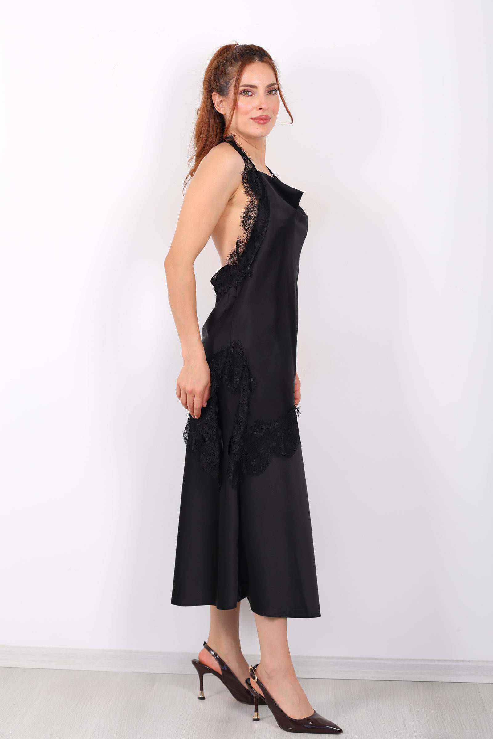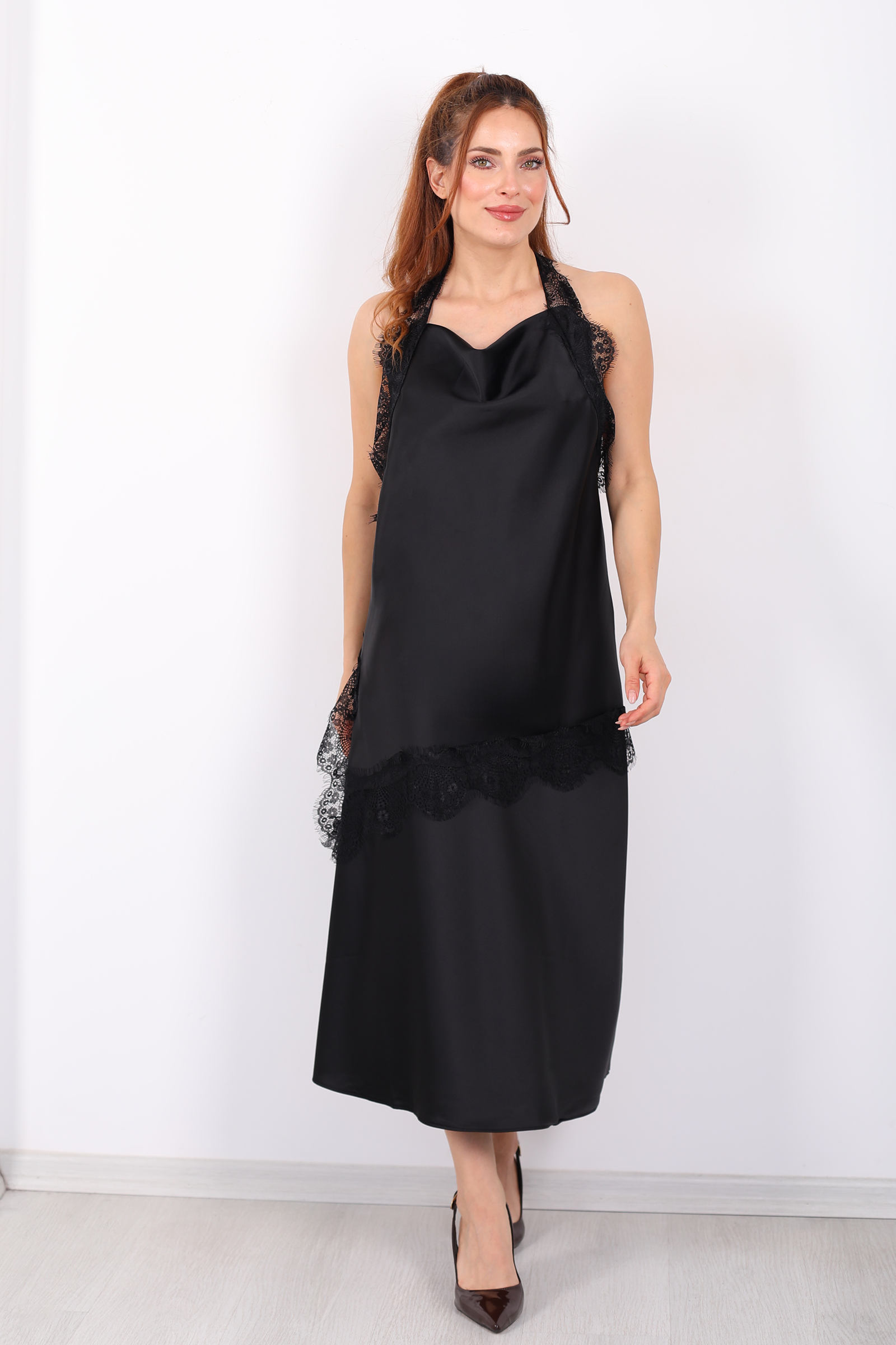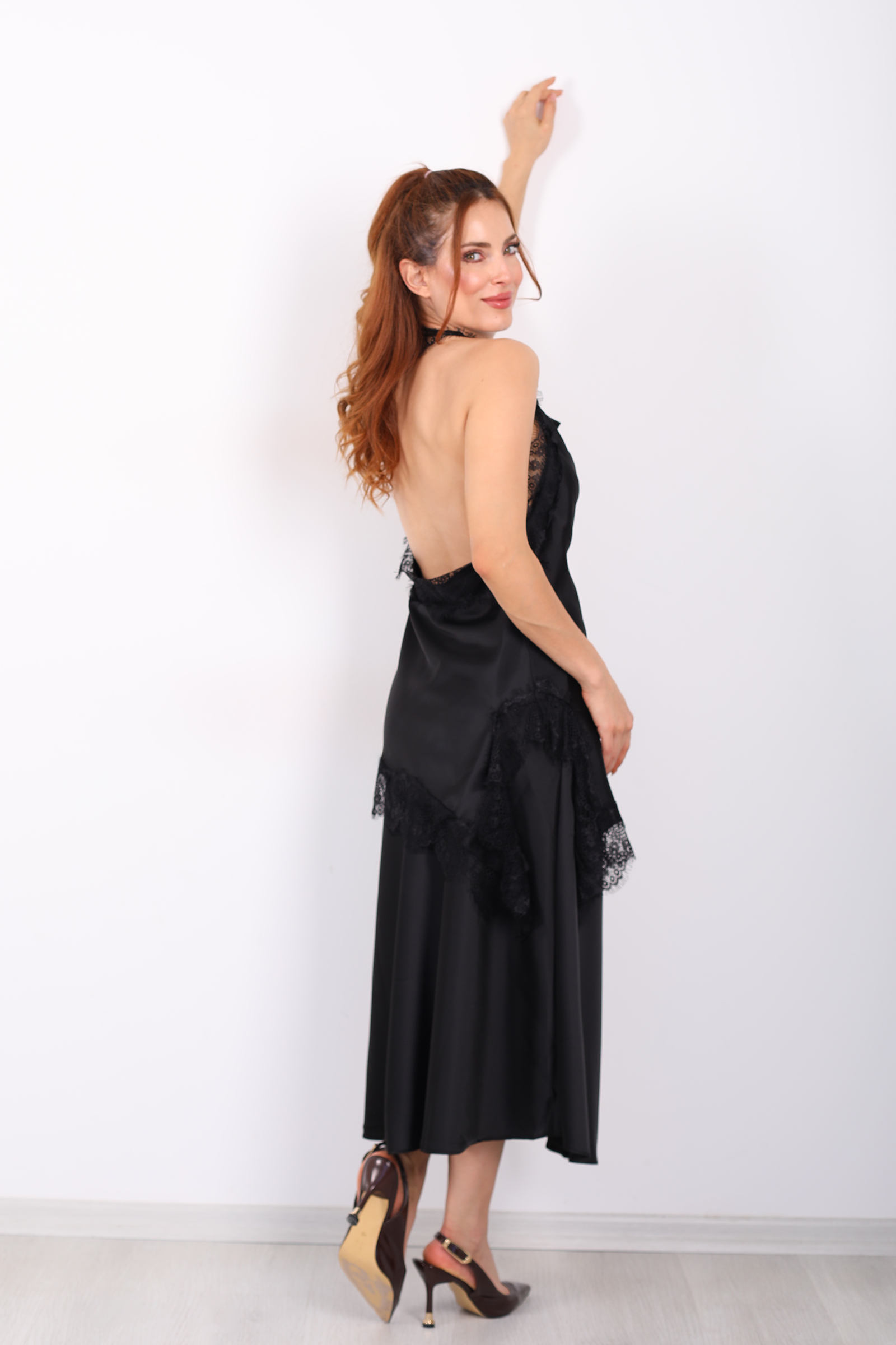 Boyundan Tül Bağlamalı Siyah Kadın Asimetrik Saten Bluz