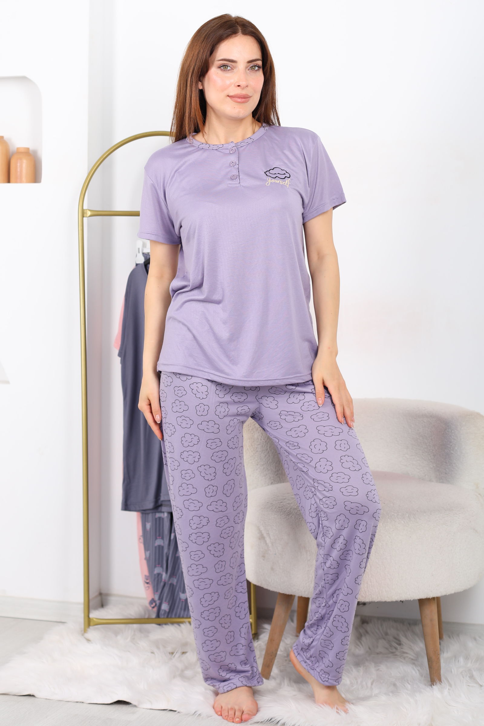 Bulut Desenli Lila Kadın Yarım Düğmeli Pijama Takımı