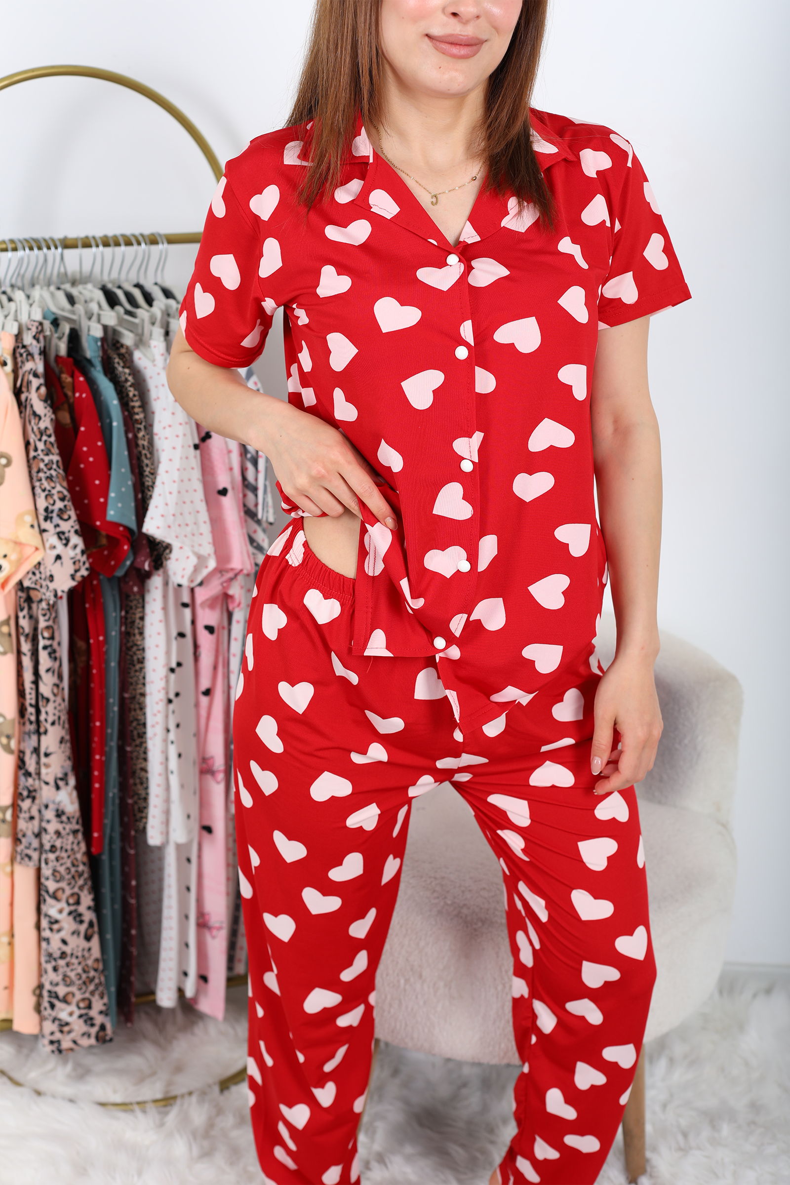 Büyük Kalp Desenli Düğmeli Kırmızı Kadın Pijama Takımı