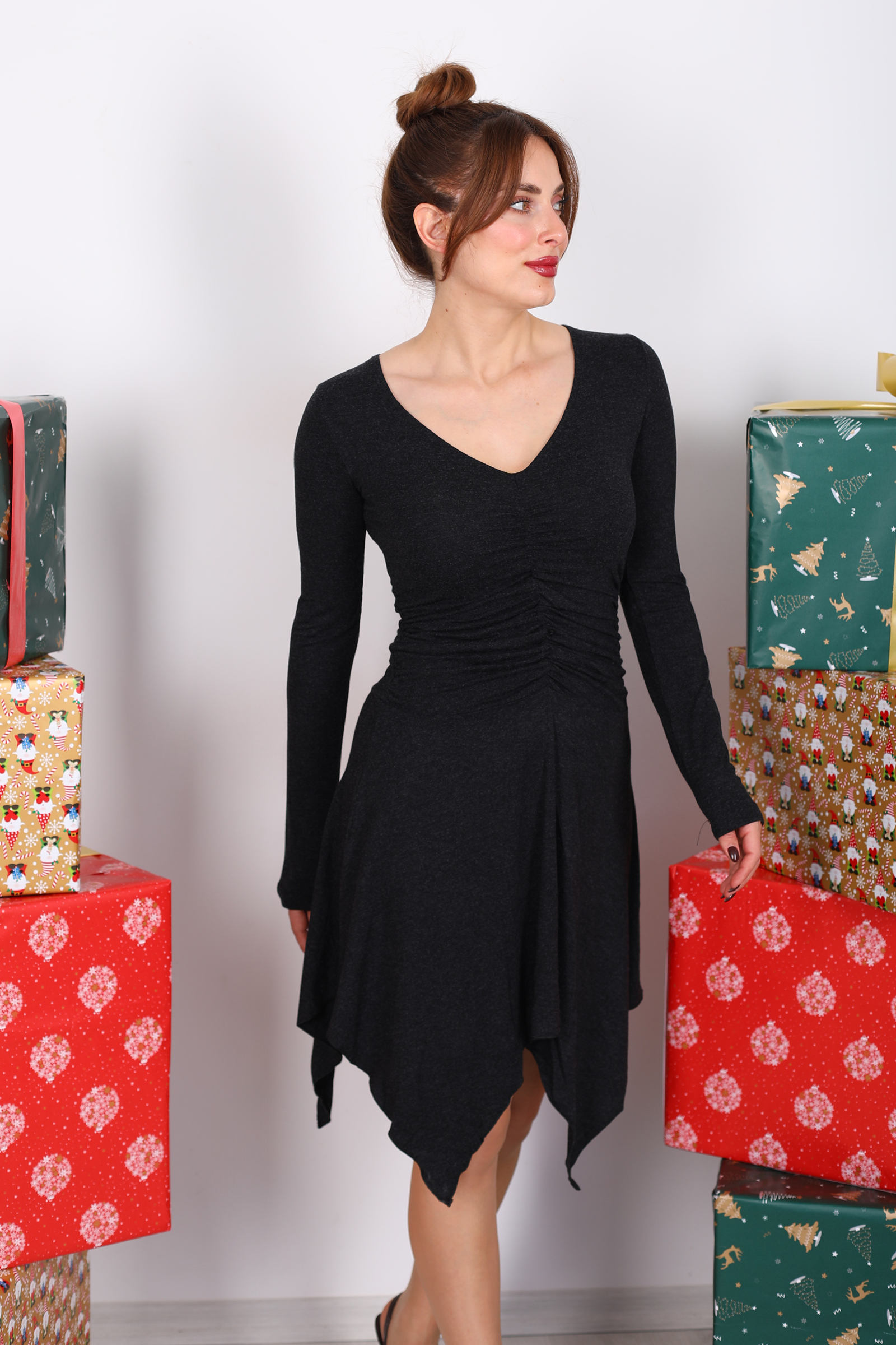 Siyahın klasik duruşunu cesur bir tasarımla birleştiren bu büzgülü asimetrik elbise, gardırobunuza sofistike ve modern bir enerji getirir. Asimetrik kesimi sayesinde siluetinizde dikkat çekici bir hareket yaratırken, elbisenin bel ve etek kısmındaki büzgü detayları feminen bir ritim sunar. Bu özel tasarım, sadece gündüz stilinizde değil, akşam davetlerinde de zarif bir tercih olarak öne çıkar.Siyah tonunun derinliği, aksesuar seçimlerinizi ön plana çıkarır ve bu parçayla yarattığınız stili istediğiniz yöne taşıma özgürlüğü verir. Topuklu ayakkabılarla gece şıklığını güçlendirebilir, sneaker ile cool bir şehir stiline dönüştürebilirsiniz. Minimal ama etkileyici çizgilerin buluştuğu bu elbise, sade görünümün altında güçlü bir karakter saklar.