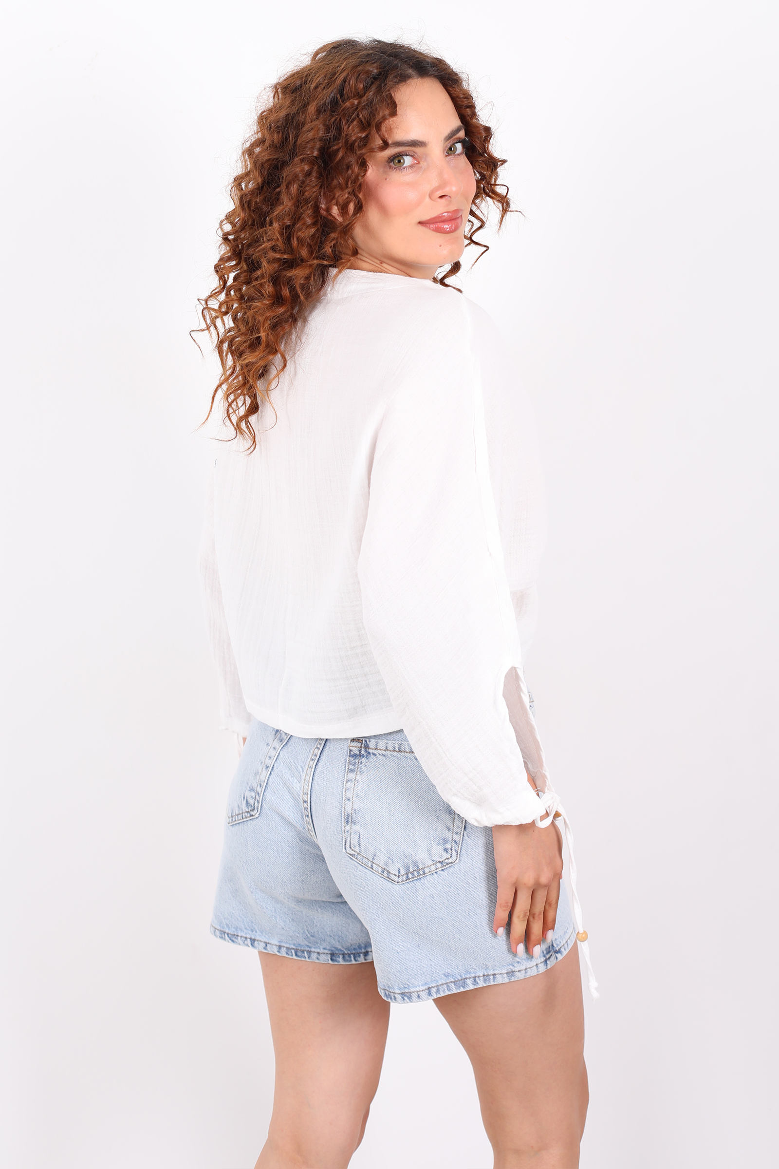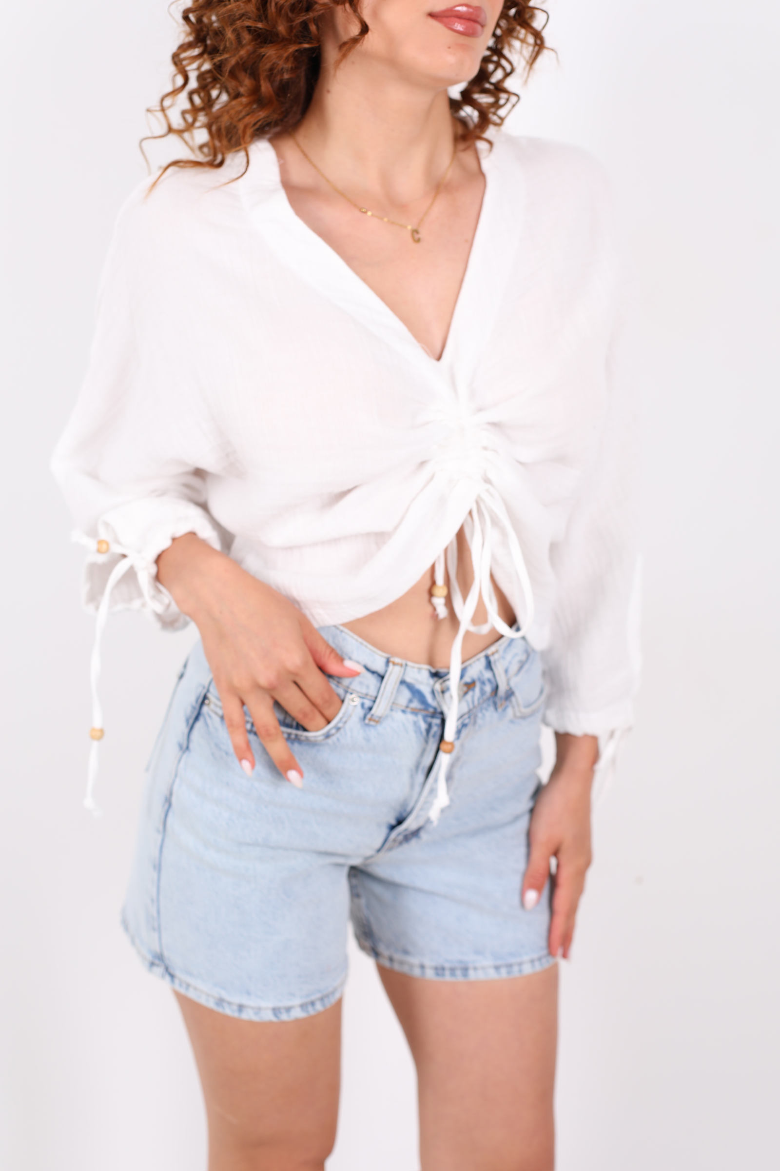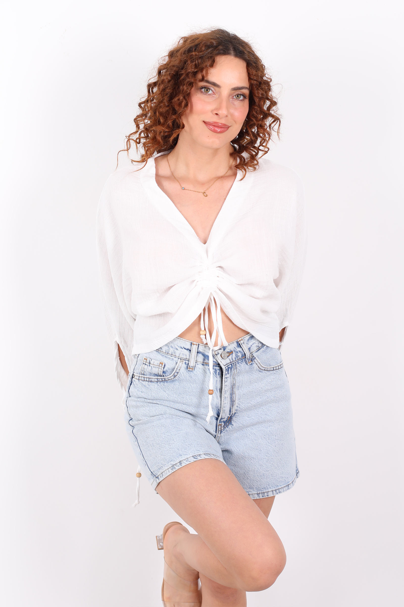 Hafifliğiyle öne çıkan müslin kumaş, bu beyaz bluzda sade zarafetle buluşuyor. V yaka kesimi ve ön kısmındaki büzgü detayı, doğal dökümlü formuna hareket katarken, feminen ve rahat bir siluet oluşturuyor. Yumuşak dokusu sayesinde ciltte ferah bir his bırakırken, nefes alabilir yapısı yaz ayları için ideal bir seçenek sunuyor. Minimal ama dikkat çekici detaylarıyla ister günlük ister şık kombinlerde öne çıkan bu parça, dolabınızın kurtarıcılarından biri olmaya aday.
