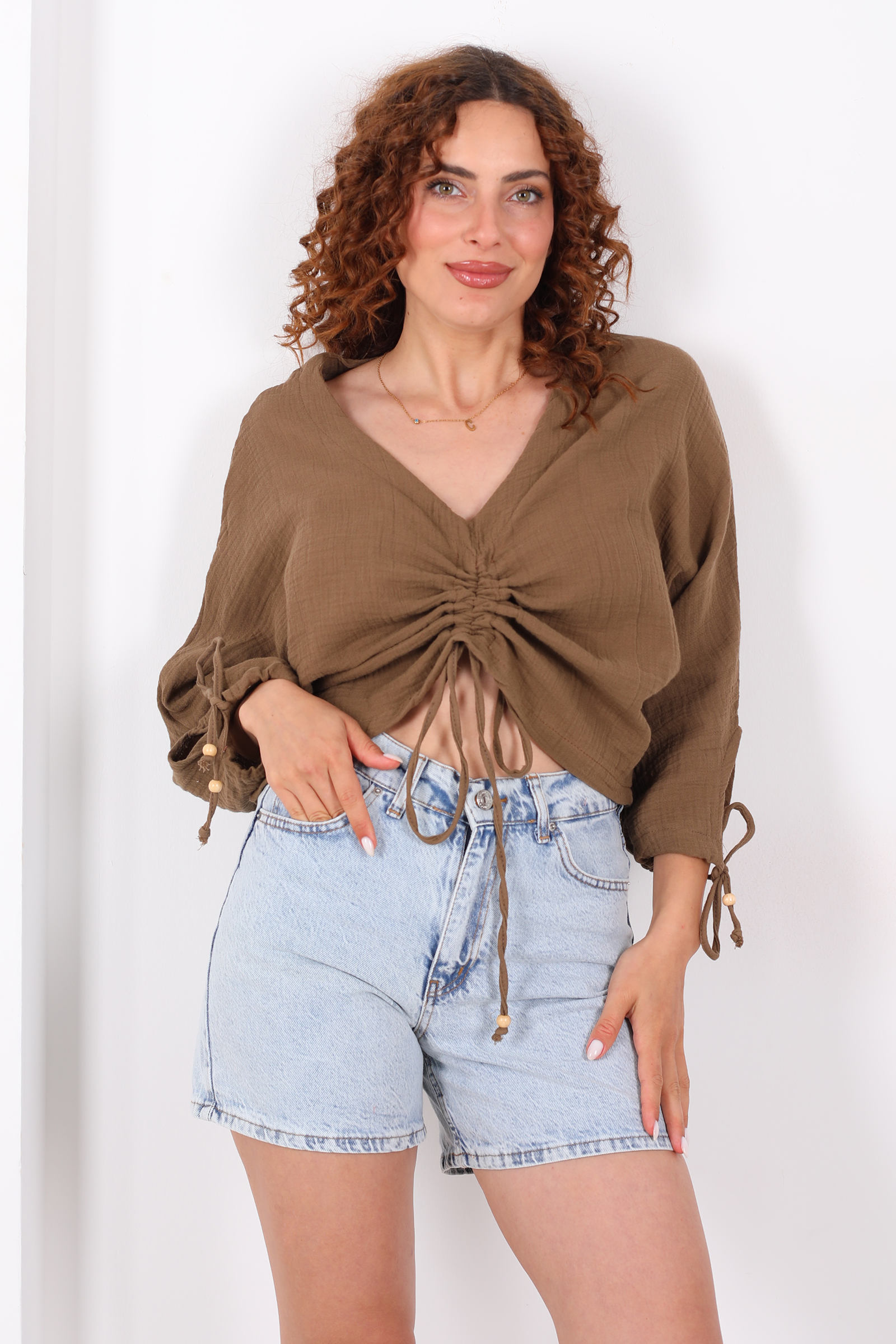 Doğal tonların zarif dokunuşu: Kahverengi büzgülü V yaka bluz, sade şıklığı ve rahatlığı bir arada sunuyor. %100 pamuklu müslin kumaşı, cildinizle dost olup nefes alabilir yapısıyla sıcağın en zorlu anlarında bile ferahlık sunar. Büzgülü V yaka tasarımı, boyun bölgesini zarifçe vurgular ve şıklığınızı artırır. Geniş kalıbı ve esnek yapısı sayesinde gün boyu konfor sunar. Sade tasarımıyla hem günlük kombinlerinizde hem de özel davetlerde rahatlıkla kullanabileceğiniz bu bluz, gardırobunuzun vazgeçilmezi olmaya aday. Sade takılar ve topuklu ayakkabılarla tamamladığınızda, zarif ve etkileyici bir görünüm elde edebilirsiniz.
