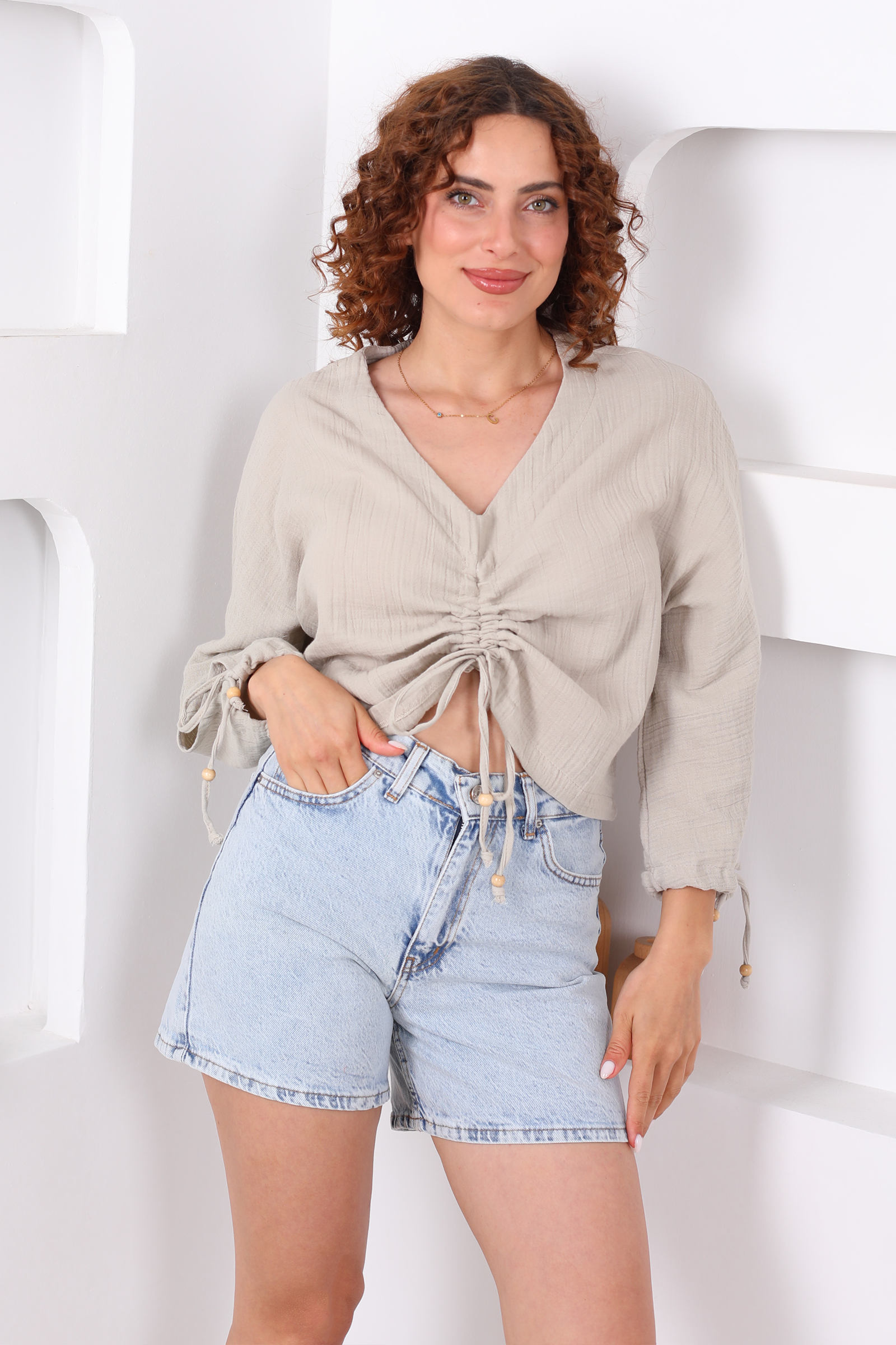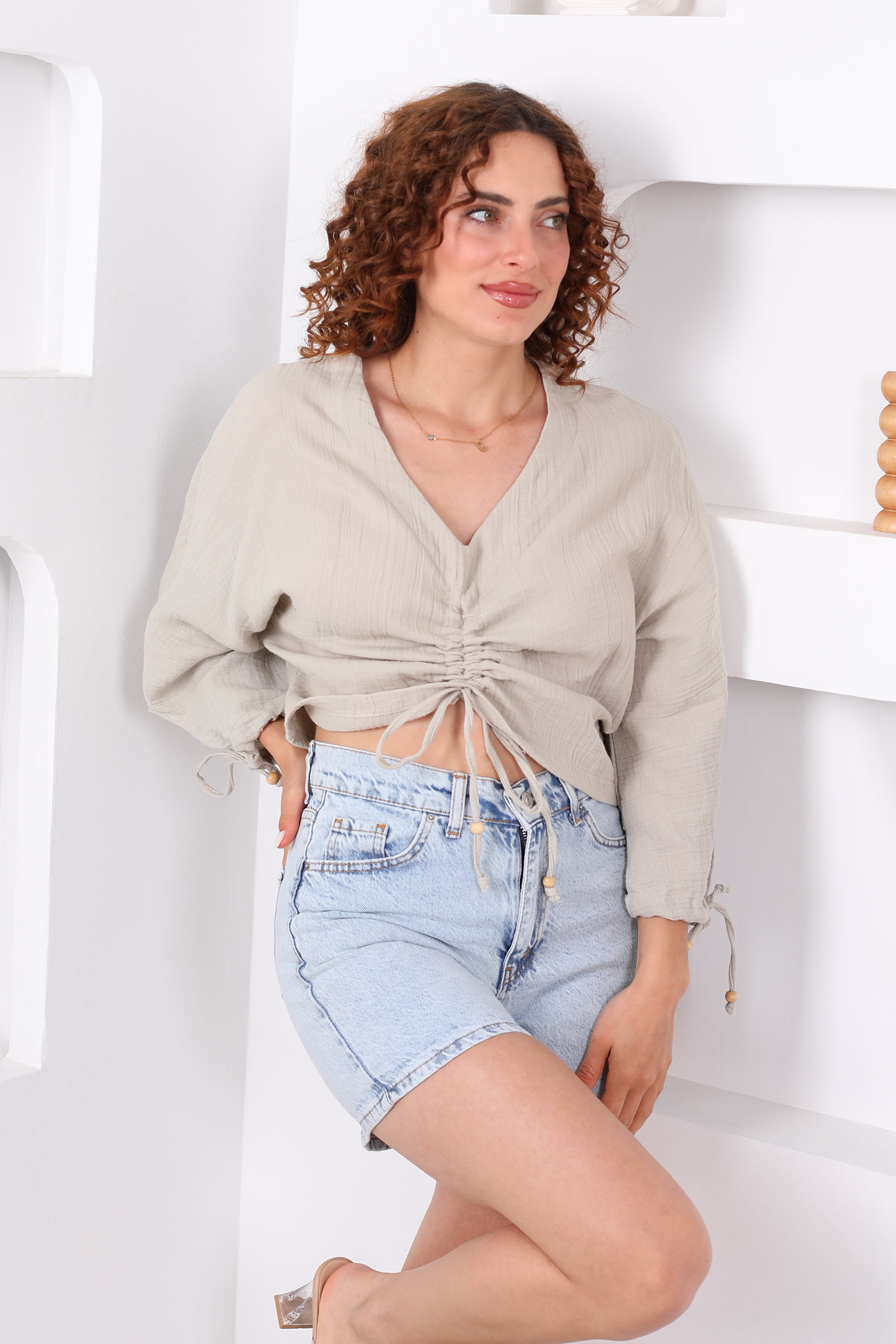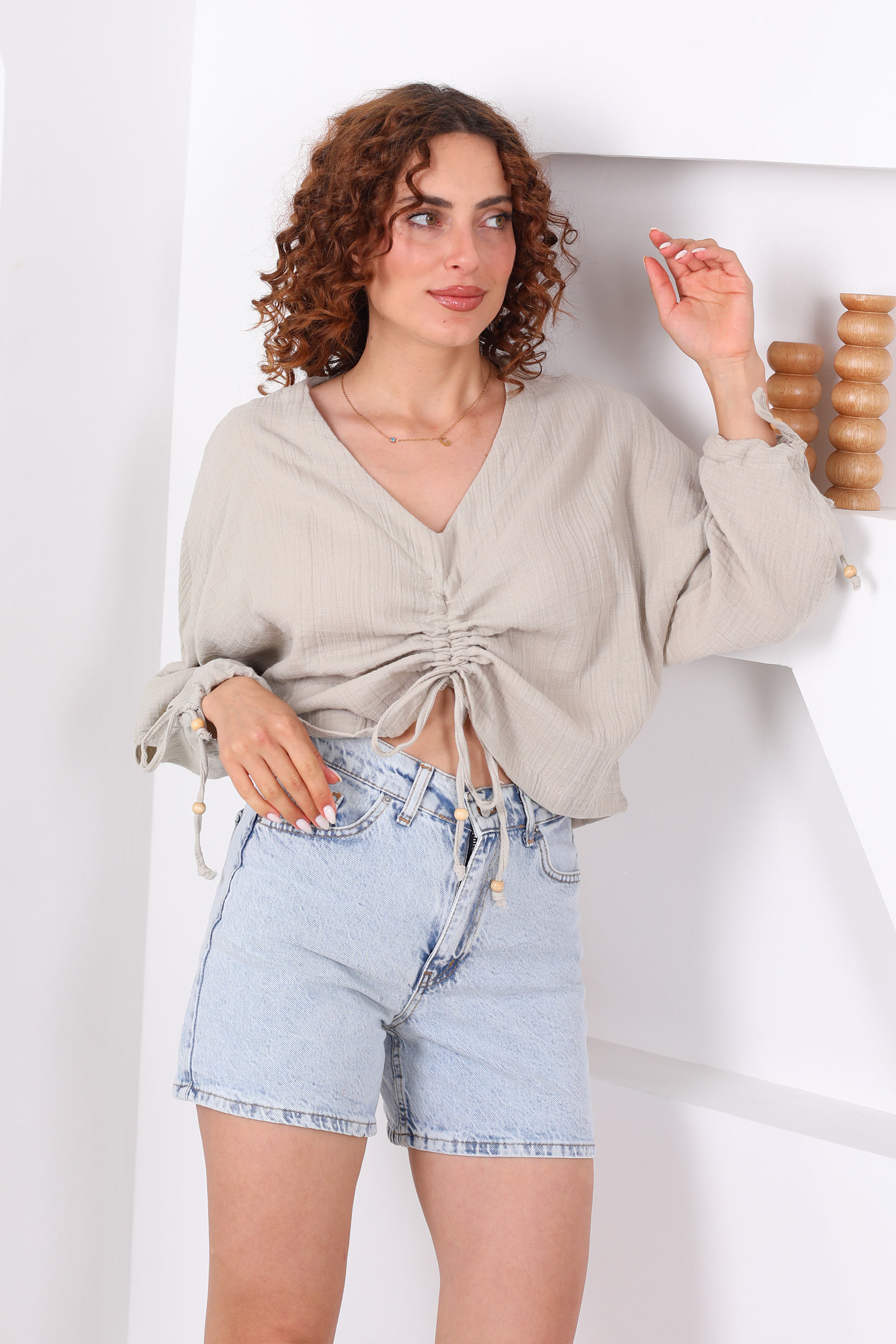 Sade şıklığı ve rahatlığı bir arada sunan bu taş rengi bluz, yaz aylarının vazgeçilmezi olmaya aday. %100 pamuklu müslin kumaşı, cildinizle dost olup nefes alabilir yapısıyla sıcağın en zorlu anlarında bile ferahlık sunar. Büzgülü V yaka tasarımı, boyun bölgesini zarifçe vurgular ve şıklığınızı artırır. Geniş kalıbı ve esnek yapısı sayesinde gün boyu konfor sunar. Sade tasarımıyla hem günlük kombinlerinizde hem de özel davetlerde rahatlıkla kullanabileceğiniz bu bluz, gardırobunuzun vazgeçilmezi olmaya aday.