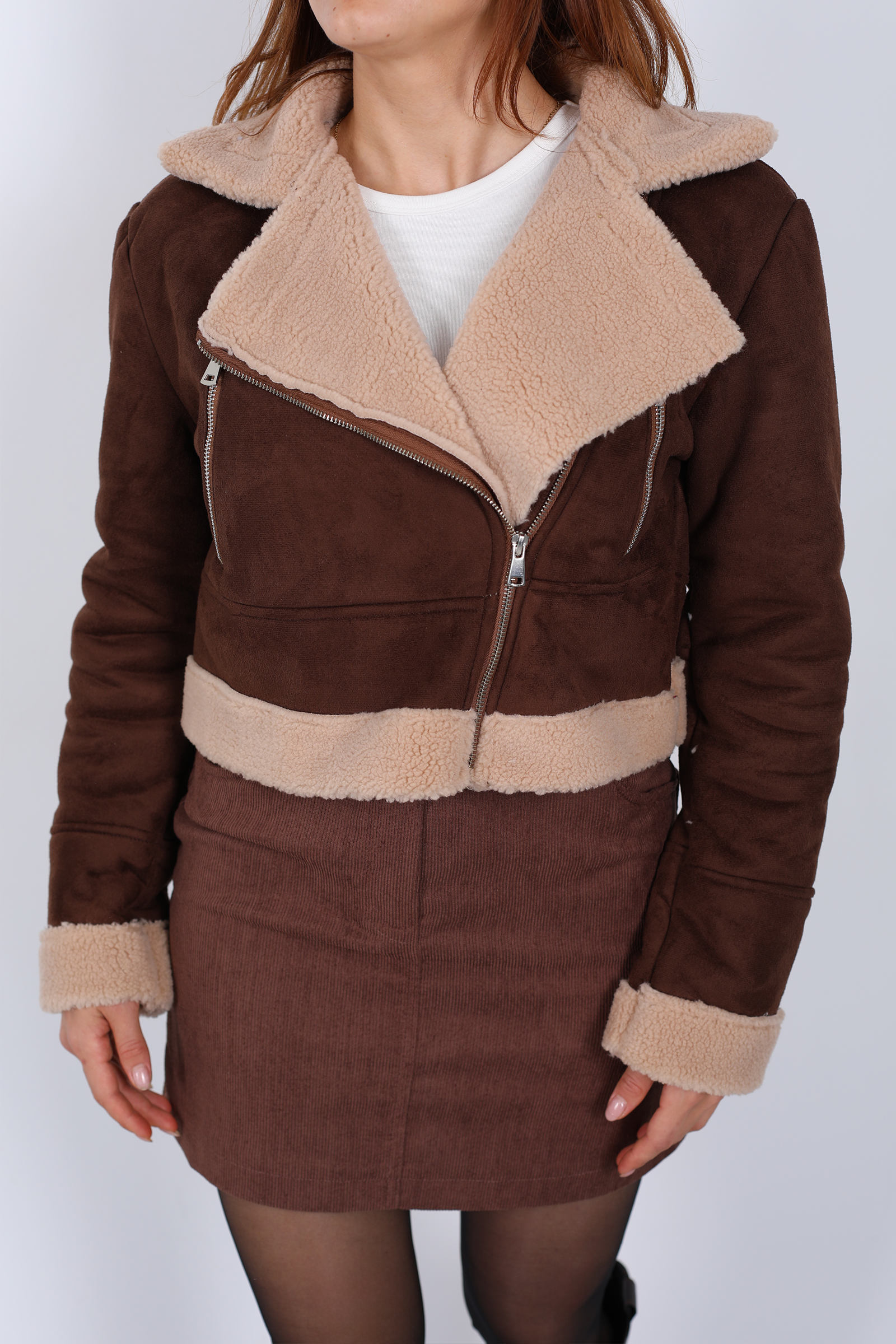 Işıl ışıl günlerin sıcak tonuna sahip Çapraz Fermuarlı Kürklü Açık Kahve Süet Kısa Mont, zarafet ile konforu bir araya getiren özgün bir dış giyim parçası. Süetin yumuşak ve dokusal dokusu ile kürk biyeli yakası, hem stilinize lüks bir dokunuş hem de sıcaklık sağlar.Siyah dar pantolon + zarif çanta + topuklu ayakkabılar ile sofistike ama sıcak bir görünüm oluşturun.