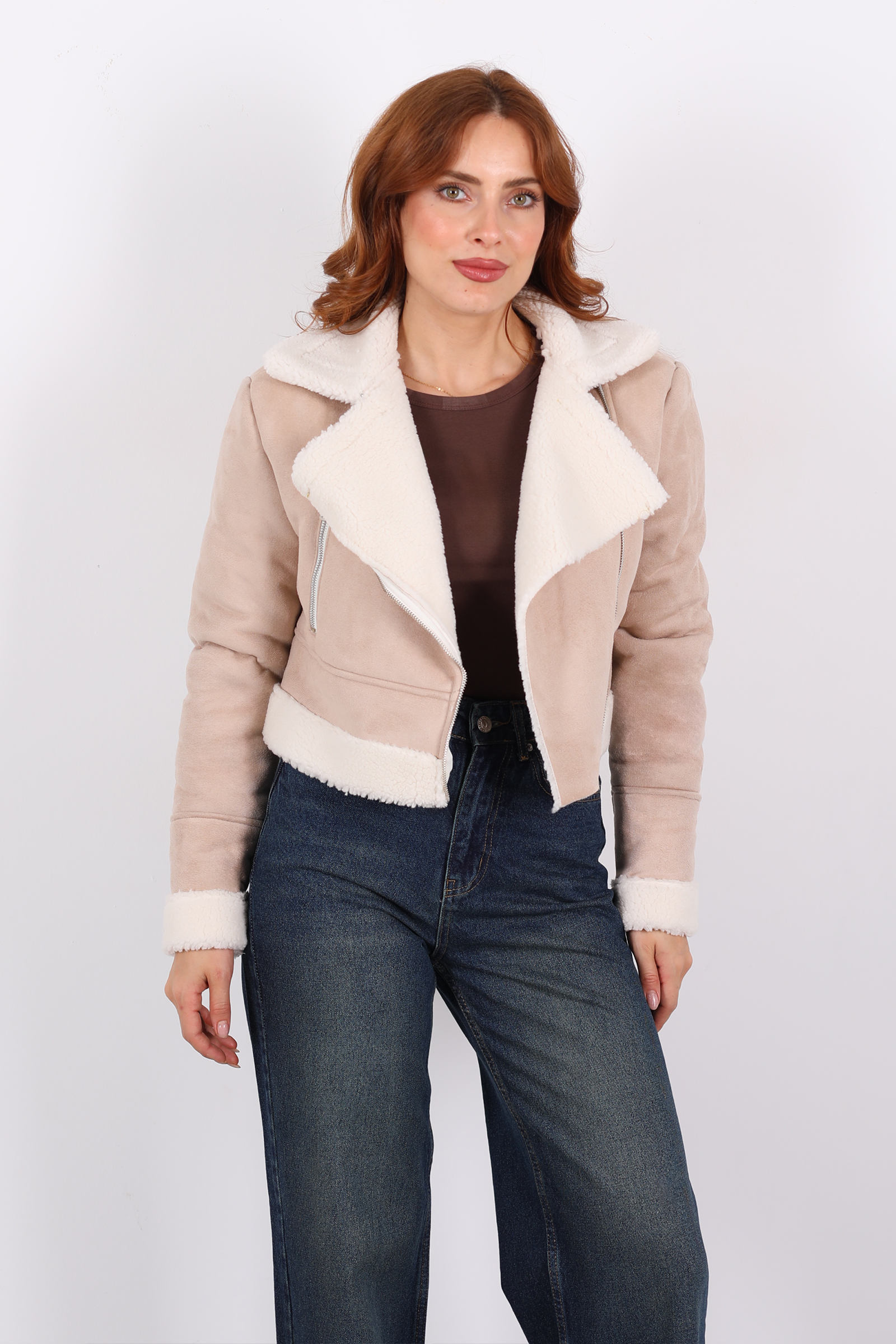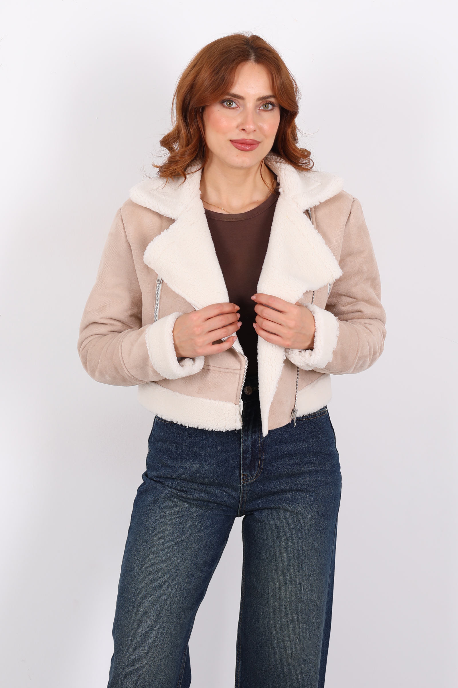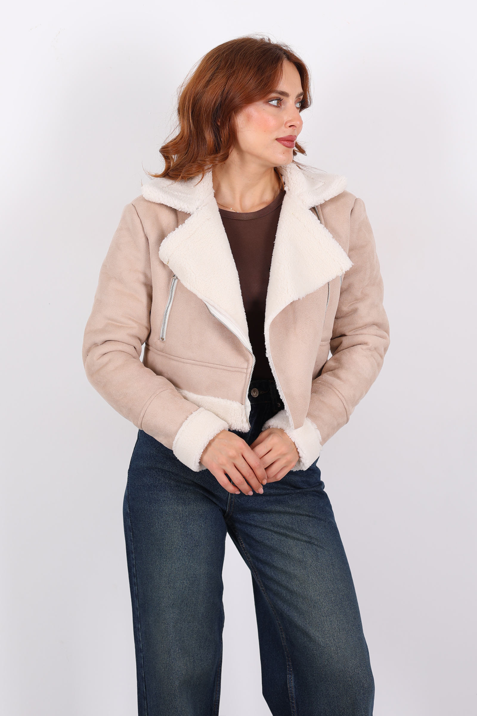 Yumuşak krem tonuyla sakin ama dikkat çeken bir ifade sunan bu kısa süet mont, çapraz fermuarı ve hacimli kürk yakasıyla hem zarif hem modern bir duruş yakalıyor. Süetin mat yüzeyi ve kürk detaylarının uyumu, montu hem lüks bir parça hem de günlük kullanım için rahat bir alternatif haline getiriyor.Gardırobuna şıklık ve konfor katmak isteyen, nötr tonları tercih eden ve zarif dış giyim parçalarında kalite arayanlar için mükemmel bir seçimdir.