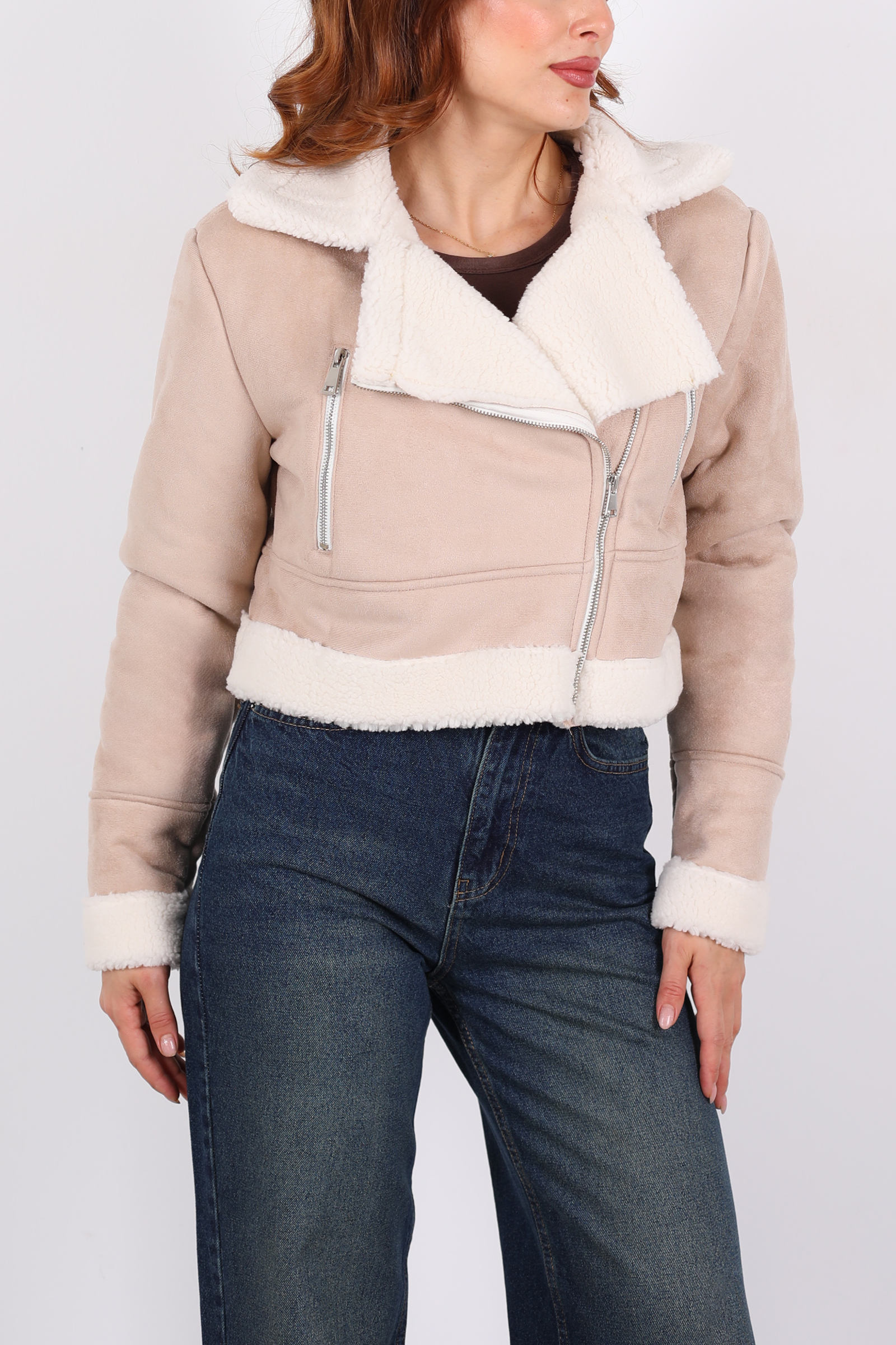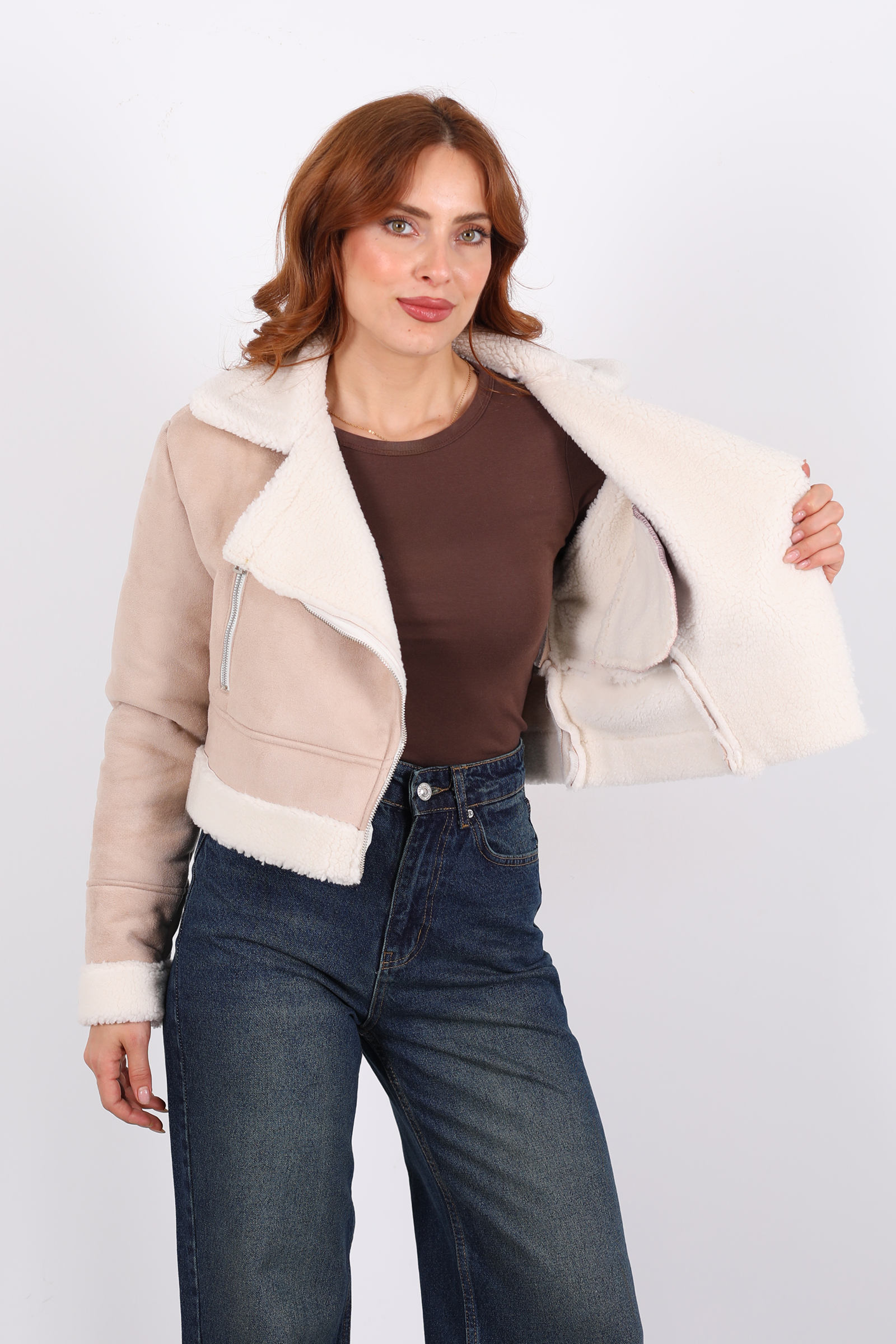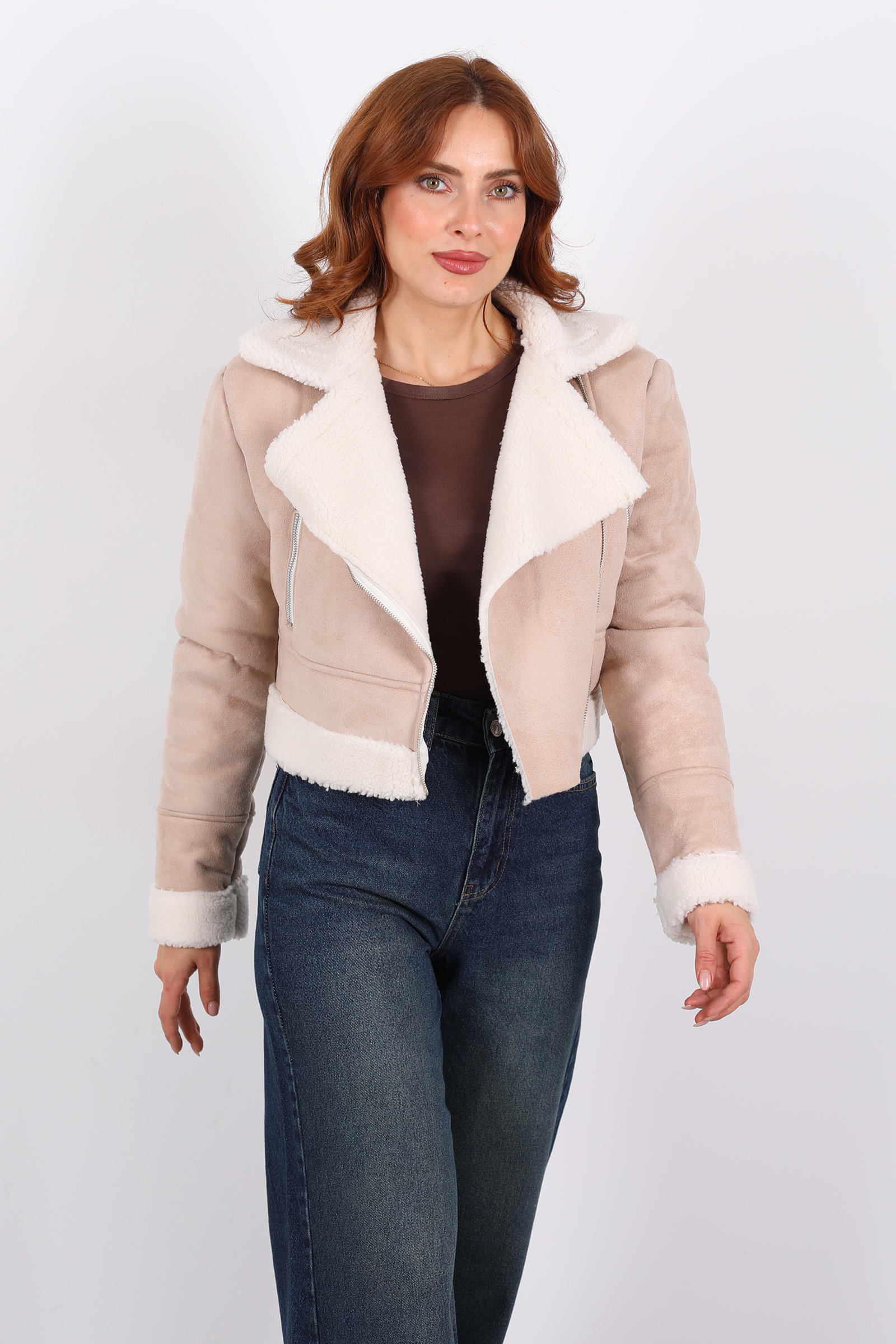 Yumuşak krem tonuyla sakin ama dikkat çeken bir ifade sunan bu kısa süet mont, çapraz fermuarı ve hacimli kürk yakasıyla hem zarif hem modern bir duruş yakalıyor. Süetin mat yüzeyi ve kürk detaylarının uyumu, montu hem lüks bir parça hem de günlük kullanım için rahat bir alternatif haline getiriyor.Gardırobuna şıklık ve konfor katmak isteyen, nötr tonları tercih eden ve zarif dış giyim parçalarında kalite arayanlar için mükemmel bir seçimdir.