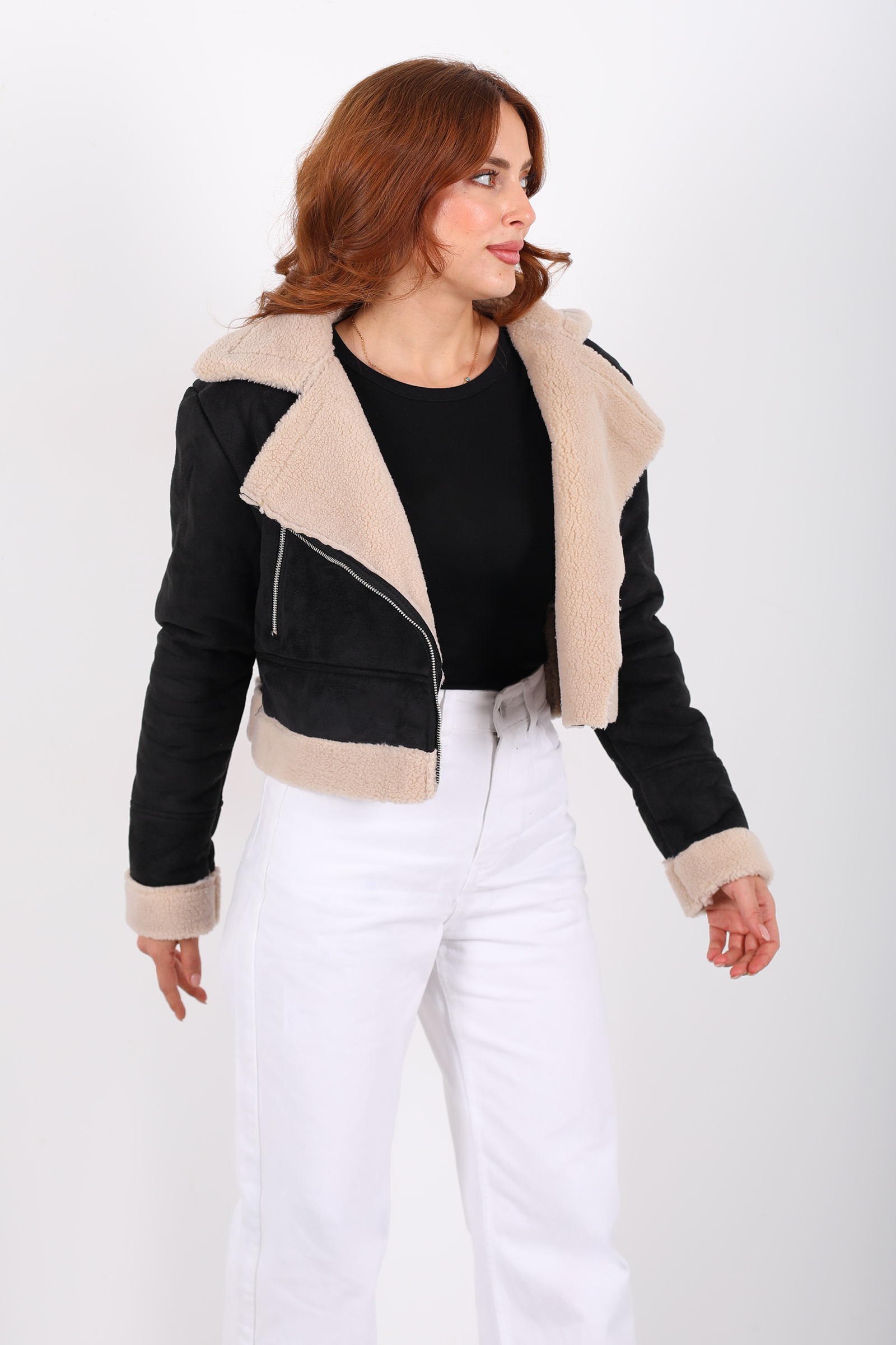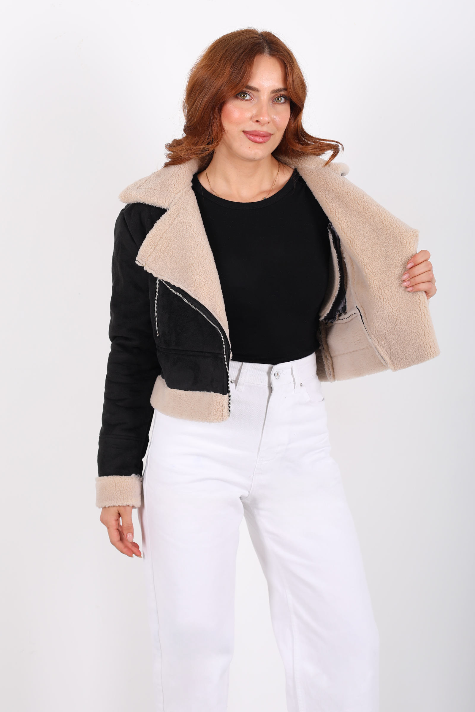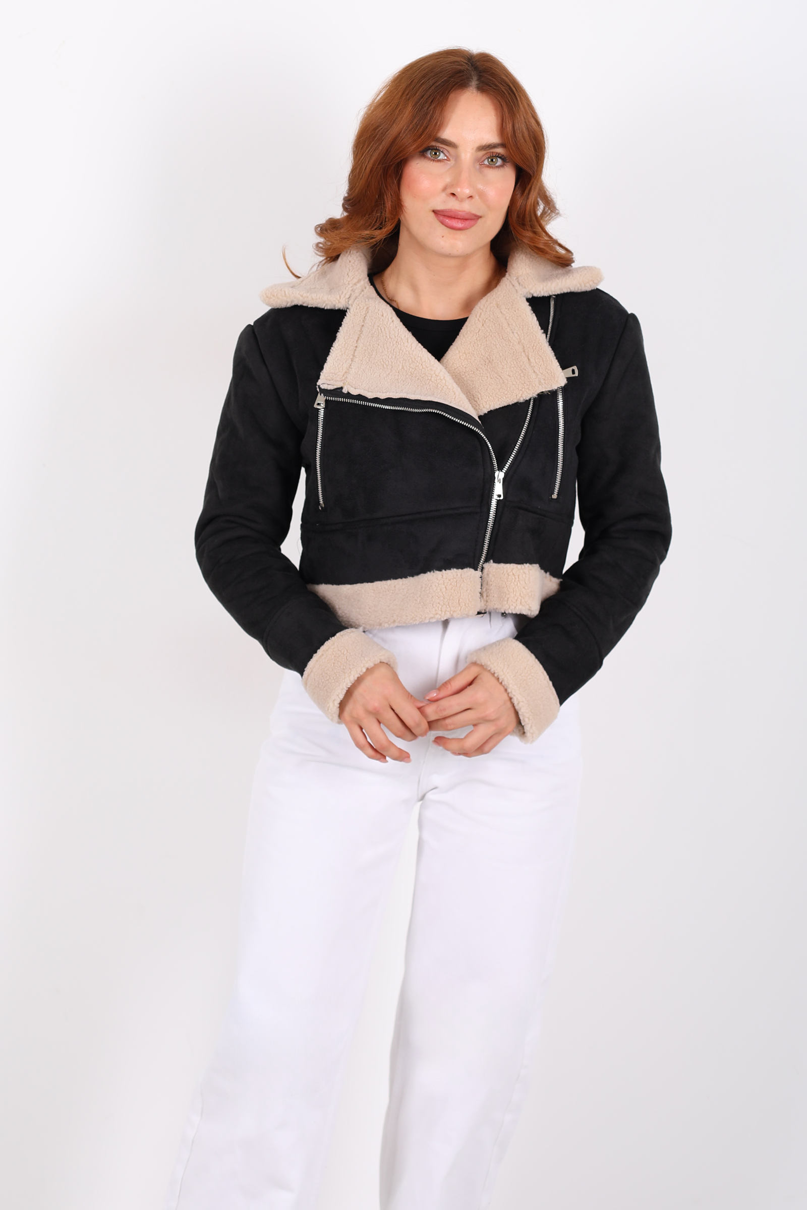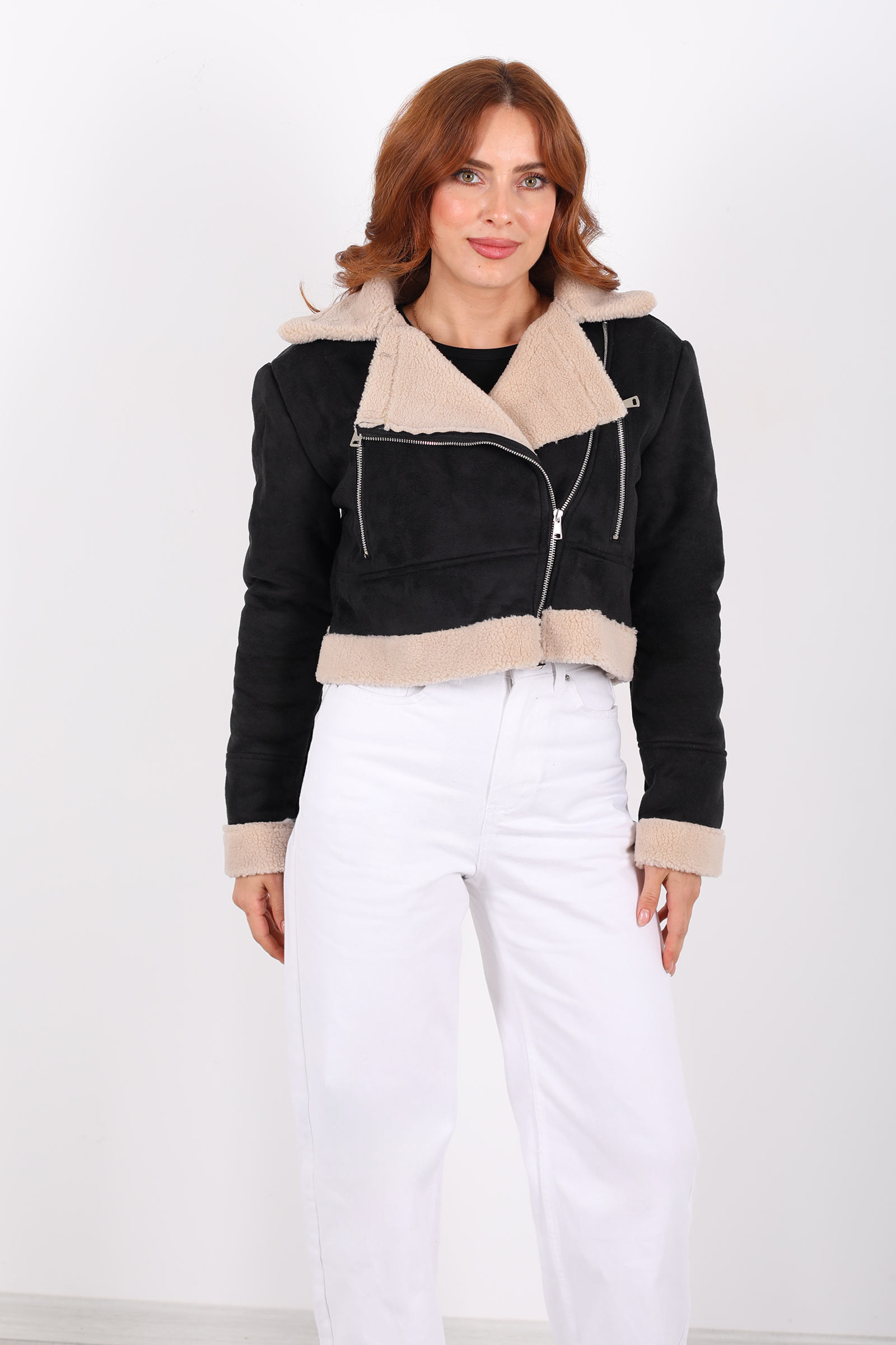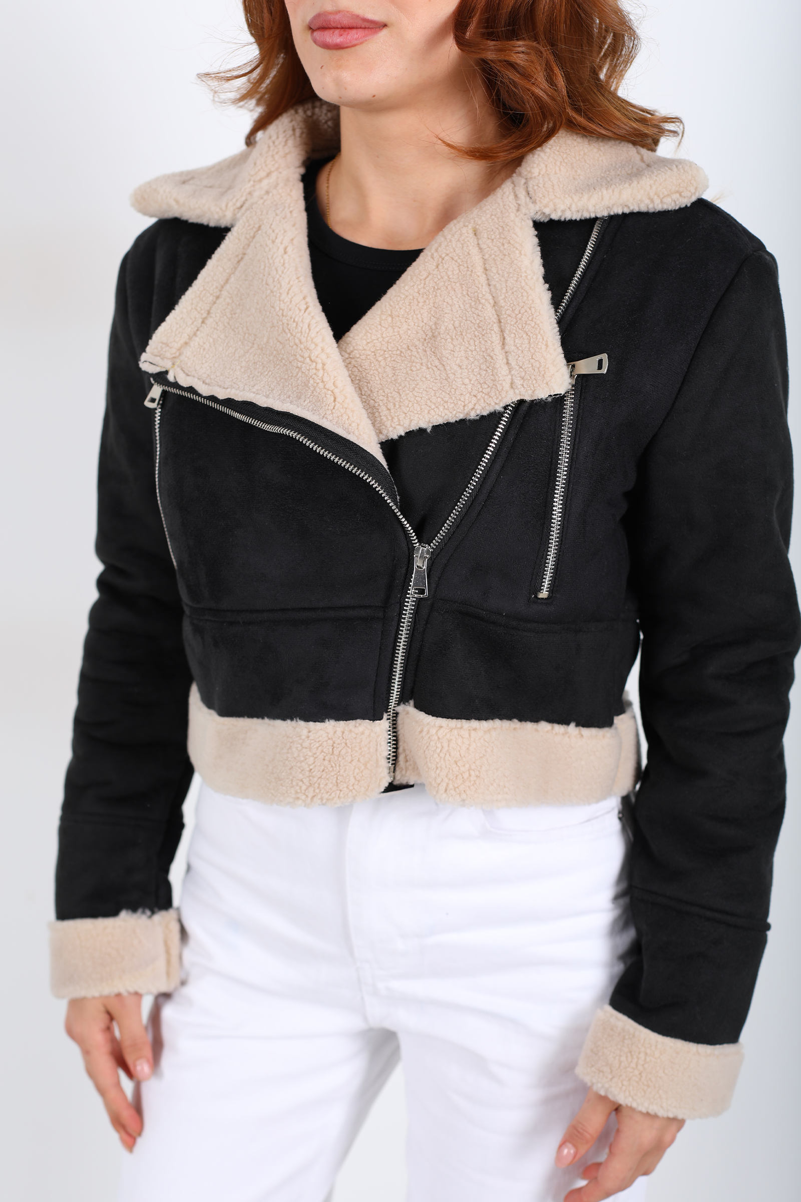 Bu kısa mont, siyah süet dokusuyla güçlü bir duruş sergilerken, çapraz fermuar tasarımı ve kürklü yakasıyla sofistike ve asi bir enerji yakalıyor. Süet yüzeyin dokusu, hem yumuşak hem mat bir görünüm sunar; kürk detayı ise yakayı sıcak tutarken estetik açıdan dikkat çeker.Kapalı kesimi ve çapraz fermuarı sayesinde modern bir hava kazanan mont, omuz hatlarını belirginleştirerek stilinize net bir yapı kazandırır.Fermuar, montu kapatırken bedeninize hoş bir form verirken, açıldığında ise V‑yaka etkisiyle farklı bir silhouette yaratır.