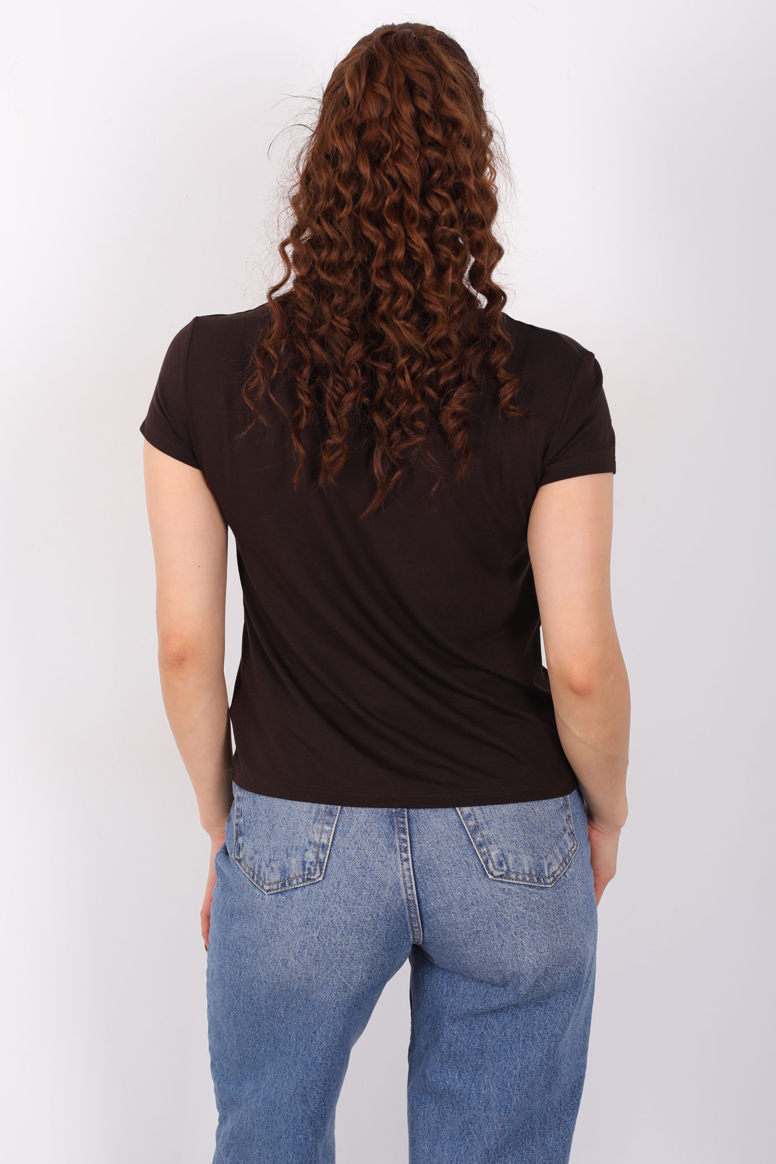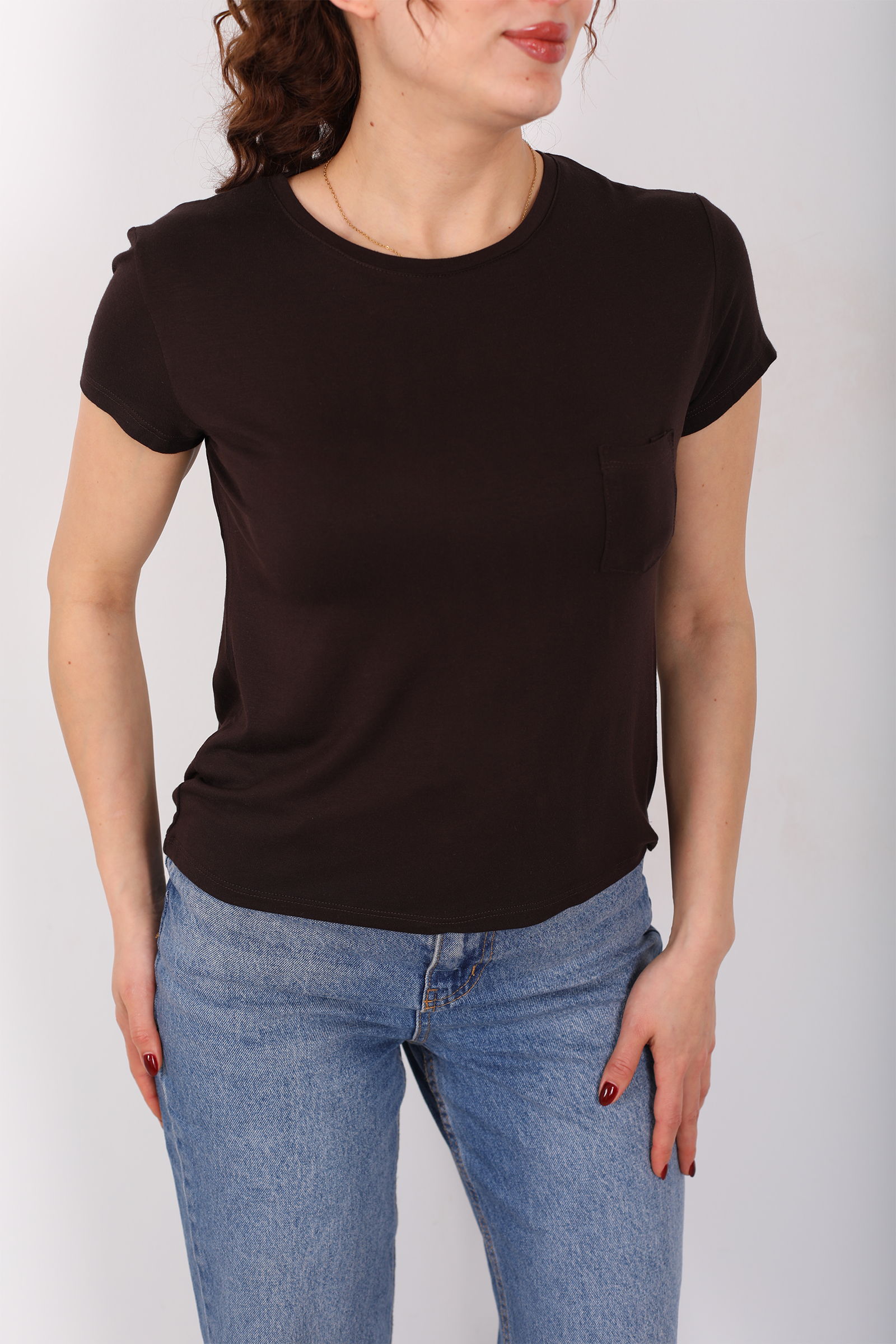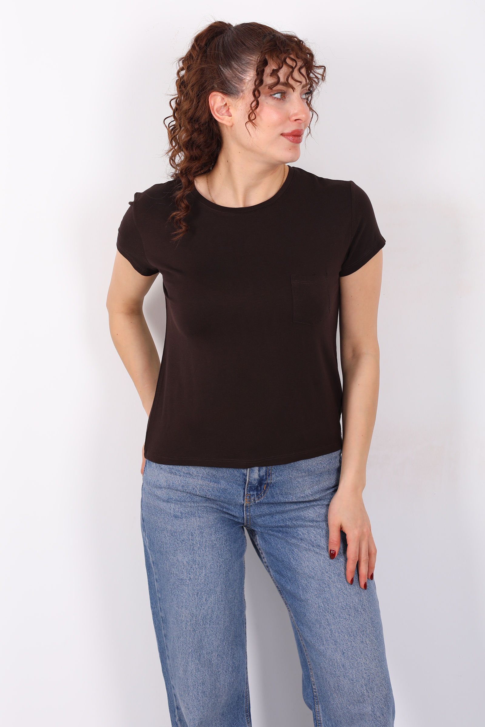 Cep Detaylı Bisiklet Yaka Acı Kahve Kadın T-Shirt