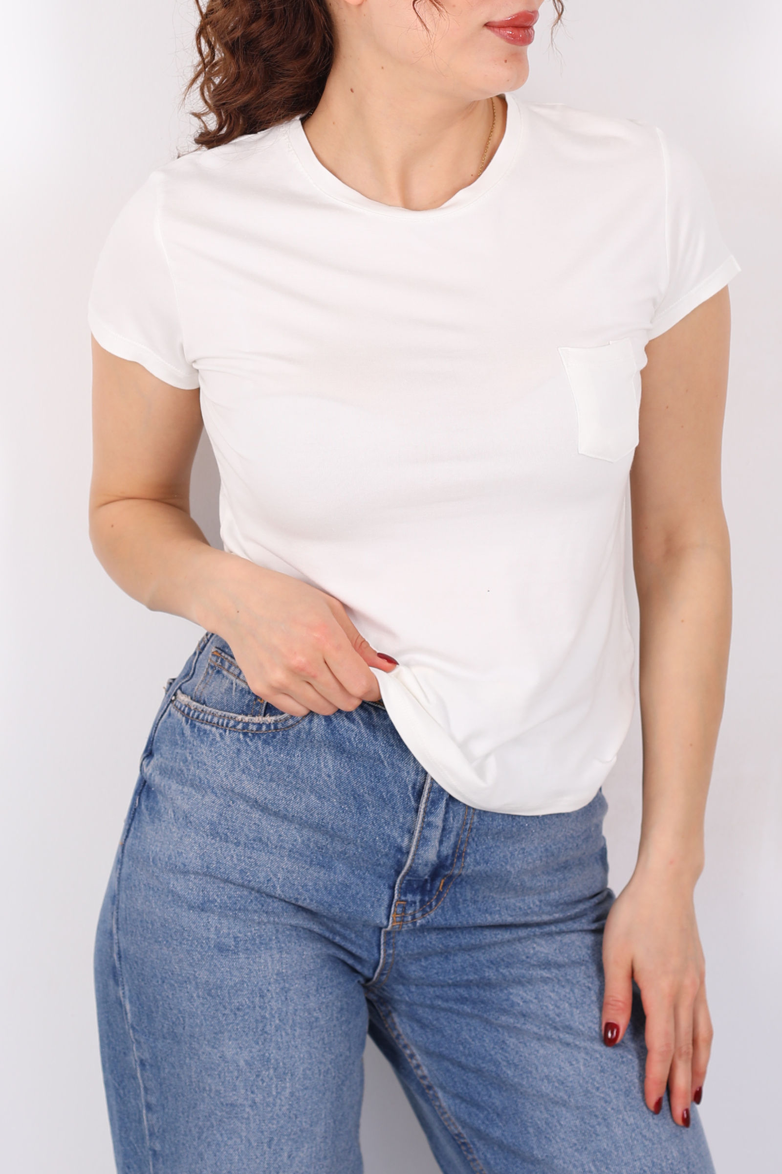 Cep Detaylı Bisiklet Yaka Ekru Kadın T-Shirt