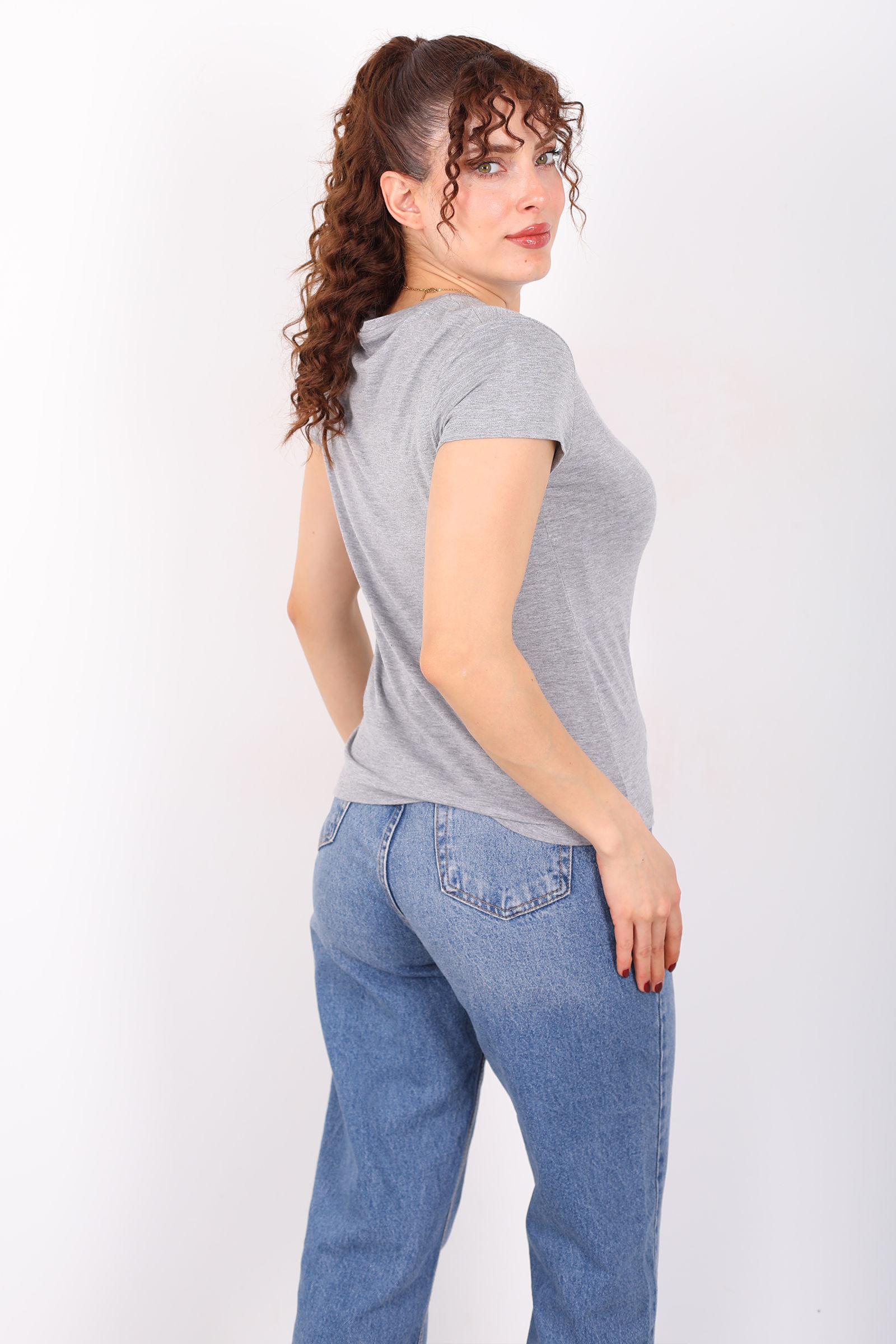 V Yaka Slim Füme Kadın T-Shirt