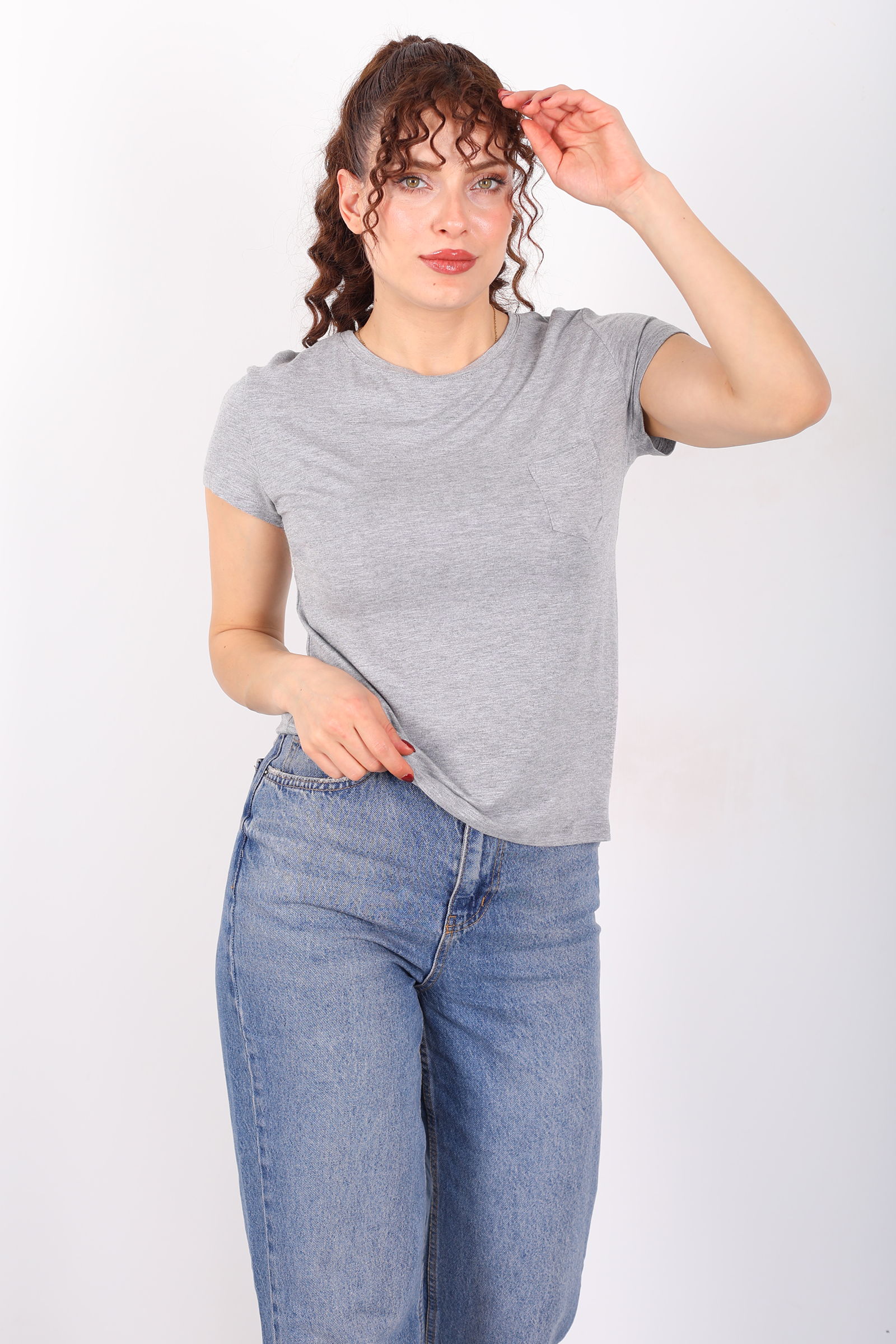 Cep Detaylı Bisiklet Yaka Gri Kadın T-Shirt