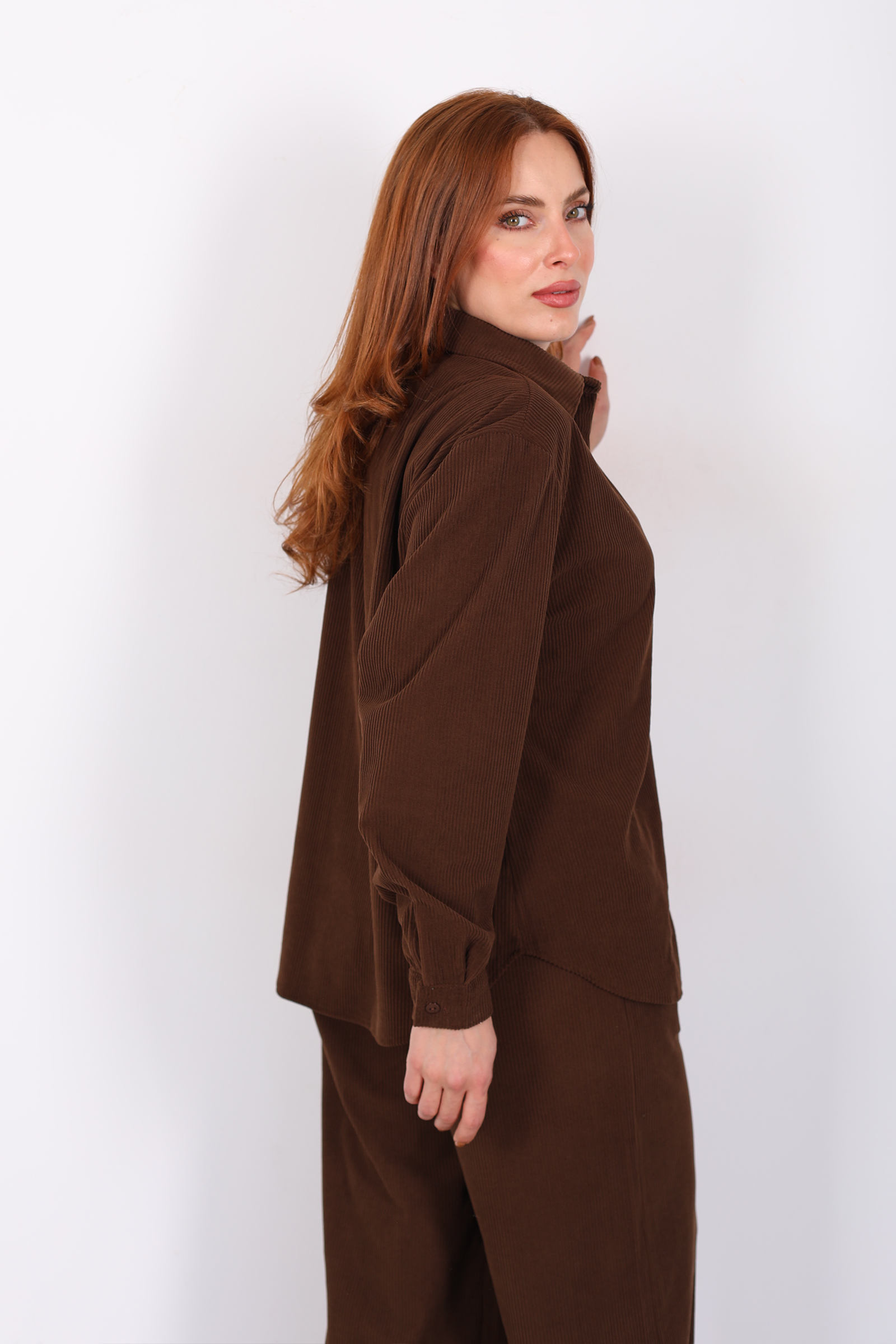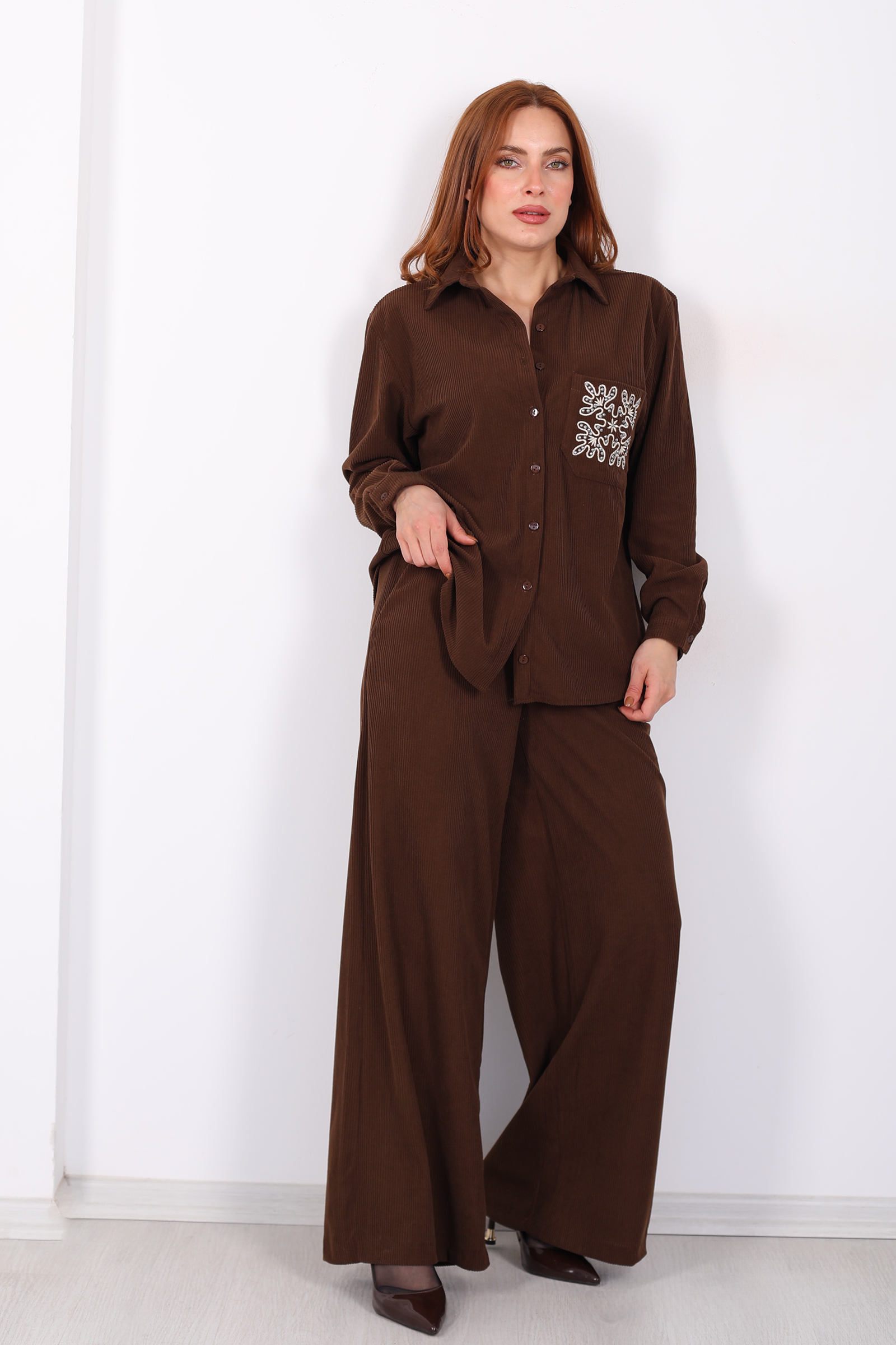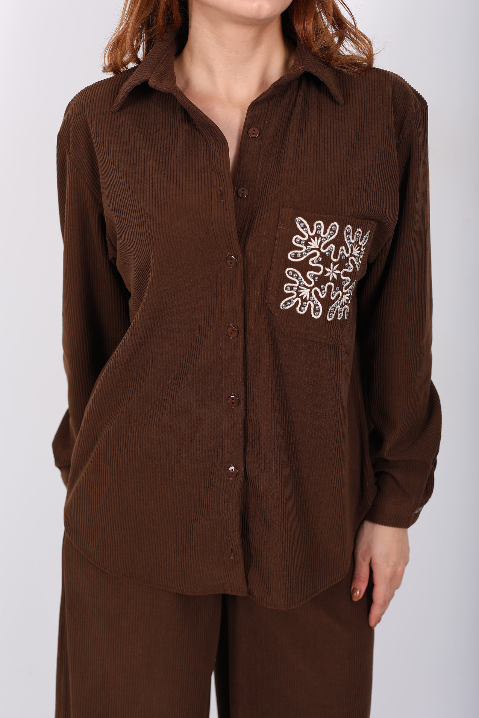 Cep Nakışlı Oversize Acı Kahve Kadın Kadife Gömlek