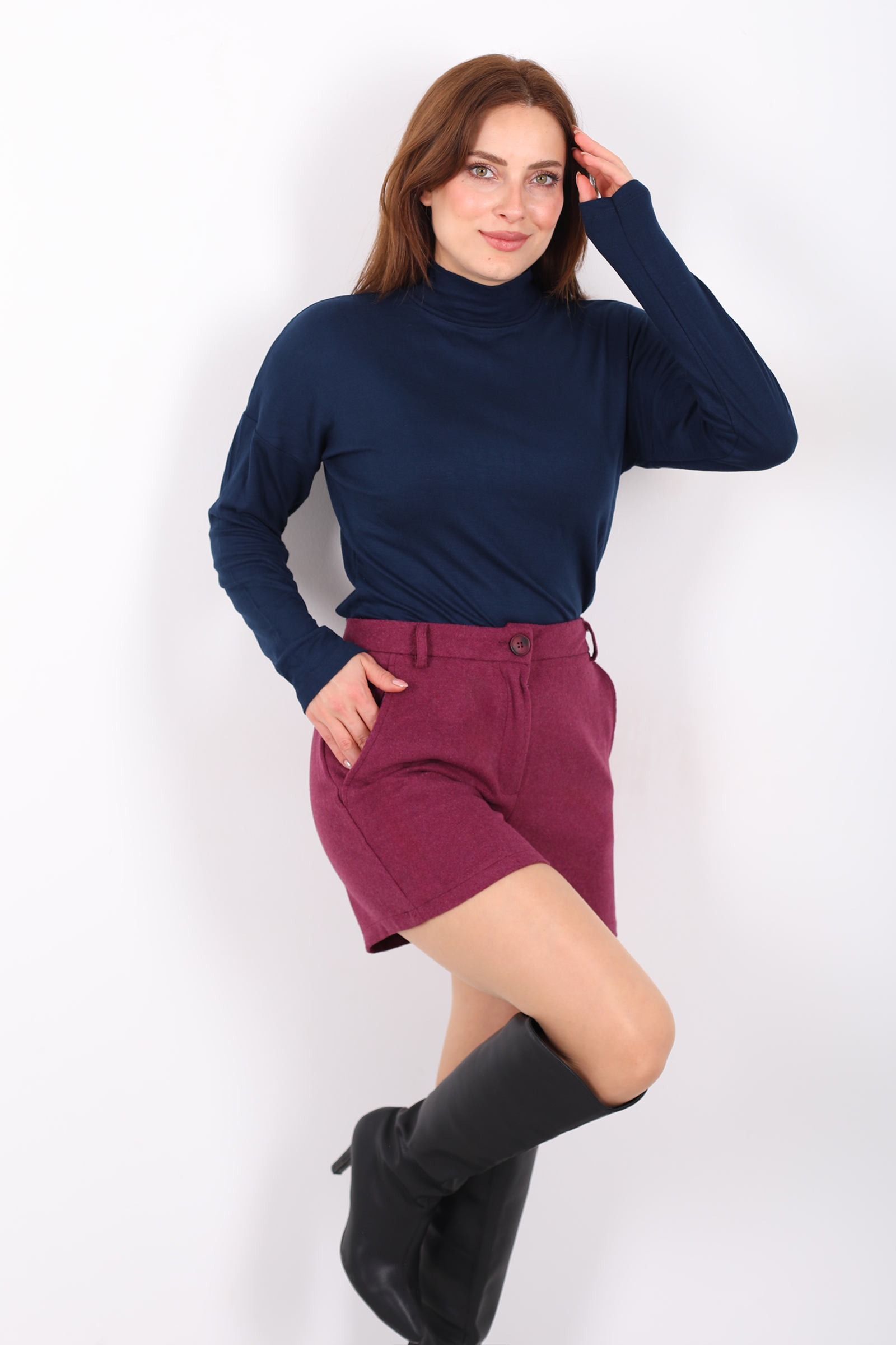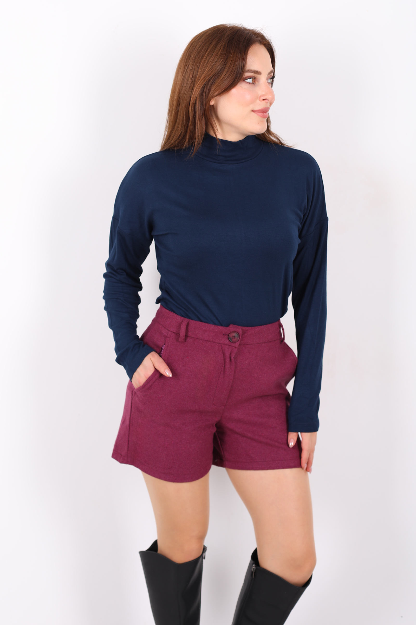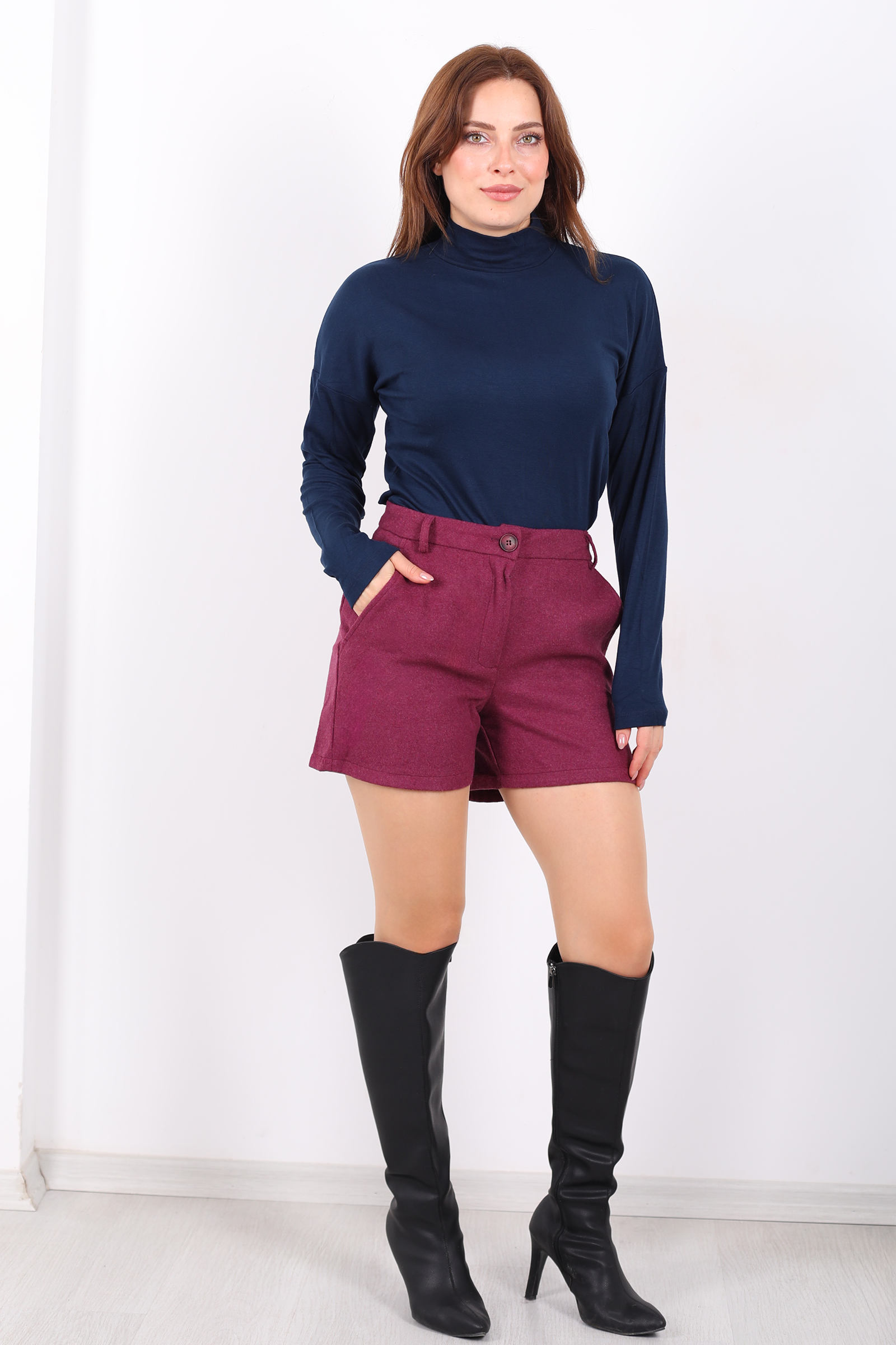 Bu mürdüm cepli kaşe şort, kaşe kumaşın sıcak ve tok dokusuyla dönemin soğuk günlerinde stilinizi korur. Derin mürdüm tonu, gardırobunuza sofistike bir renk dokunuşu ekler. Yan cepler, günlük küçük eşyalarınızı taşımanızı kolaylaştırırken klasik tam kalıp kesim modern ve rahat bir siluet sunar. Triko kazaklar, uzun çoraplar veya botlarla kombinlendiğinde hem şık hem casual bir görünüm yaratır. Çok yönlü tasarımıyla sezonun favori alt giyim parçası olmaya aday.