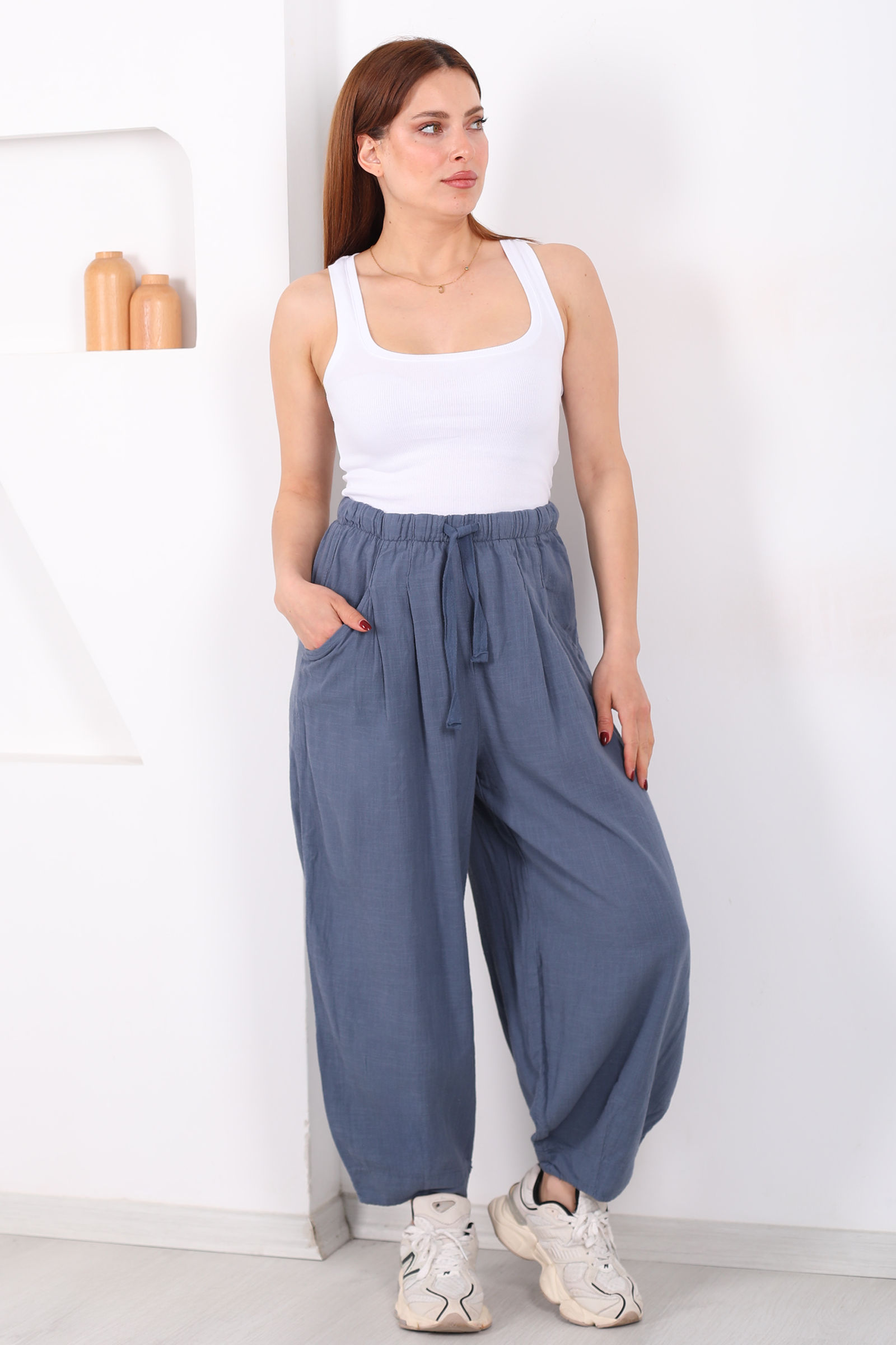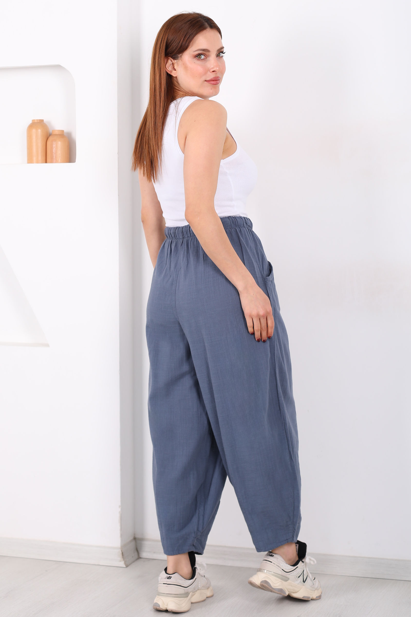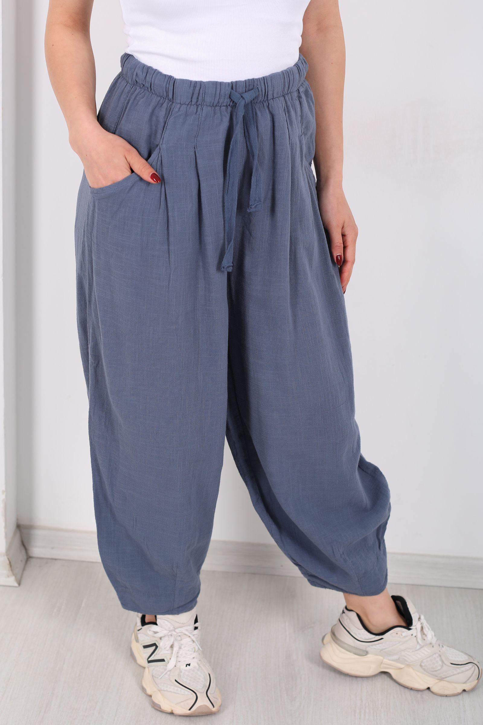 Keten kumaşın doğal dokusunu modern bir kalıpla buluşturan bu şalvar kesim pantolon, antrasit tonuyla her gardıroba zarafet katıyor. Bol kesimi sayesinde gün içinde rahat hareket etmenizi sağlayan model, ketenin nefes alabilen yapısıyla sıcak havalarda bile konfor sunar.