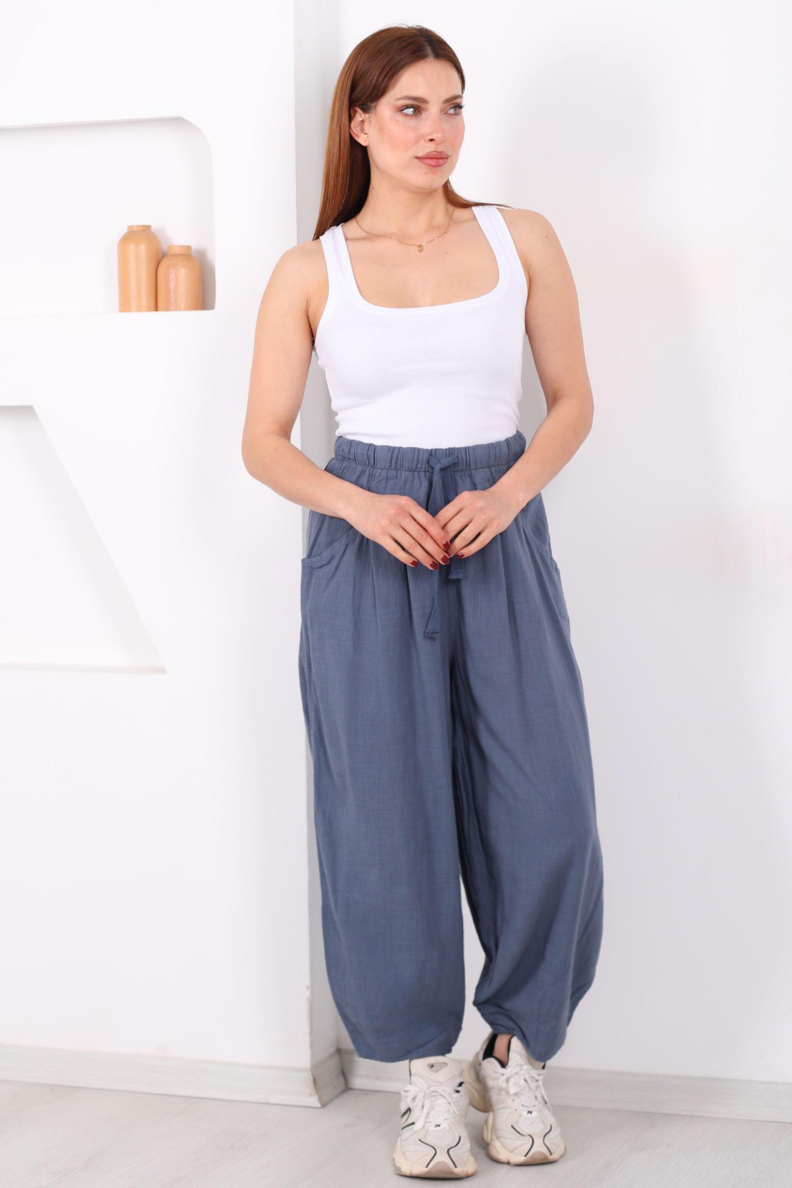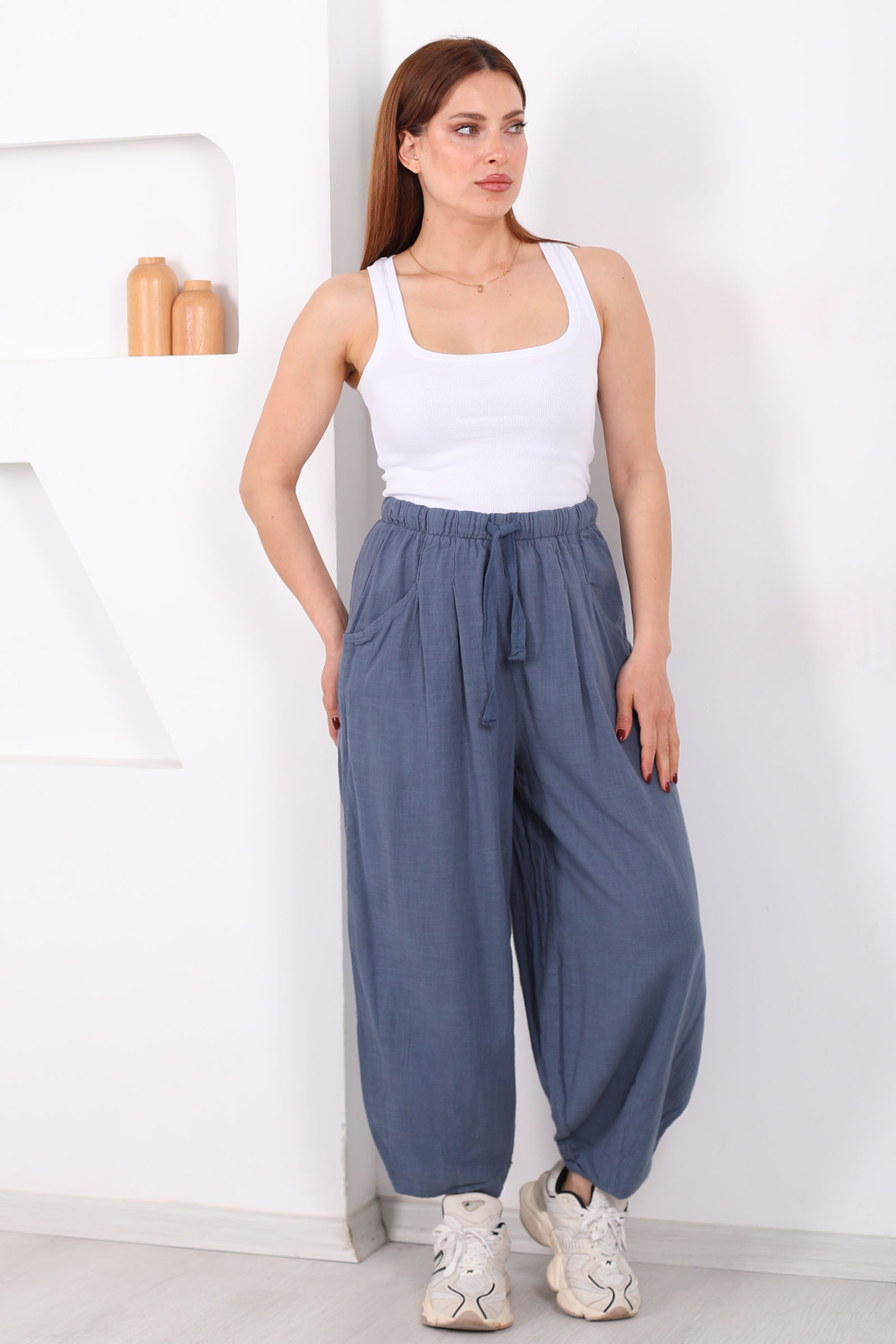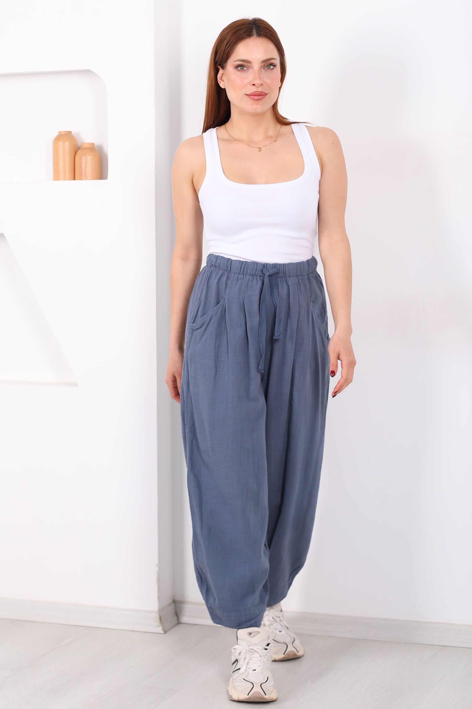 Keten kumaşın doğal dokusunu modern bir kalıpla buluşturan bu şalvar kesim pantolon, antrasit tonuyla her gardıroba zarafet katıyor. Bol kesimi sayesinde gün içinde rahat hareket etmenizi sağlayan model, ketenin nefes alabilen yapısıyla sıcak havalarda bile konfor sunar.