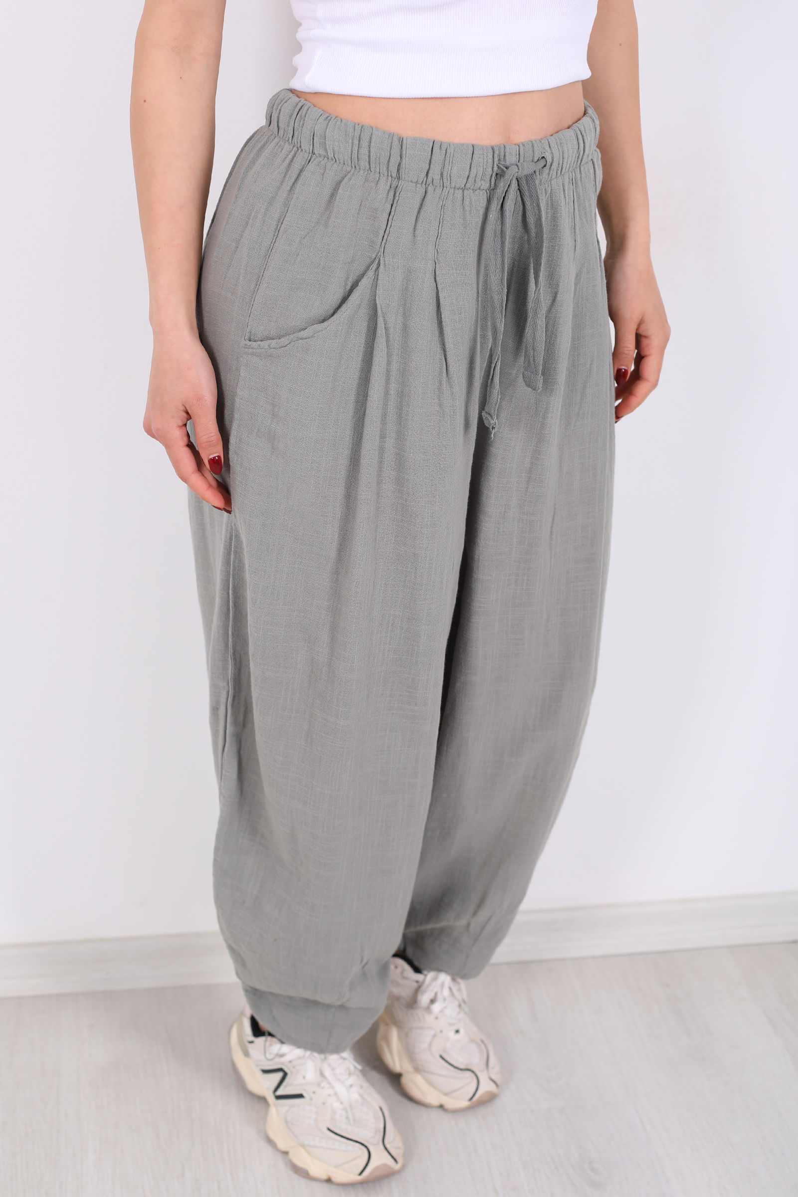 Doğadan ilham alan haki tonuyla dikkat çeken bu keten pantolon, şalvar kesimin ferahlığını günlük gardırobunuza taşıyor. Keten kumaşın hafif ve rahat dokusu, uzun süreli kullanımlarda bile konfor sağlar; aynı zamanda sıcak günlerde bile serin hissettiren doğal bir yapıya sahiptir.