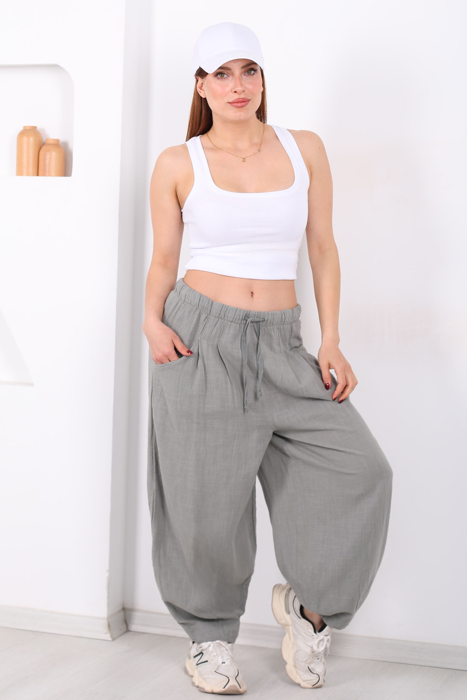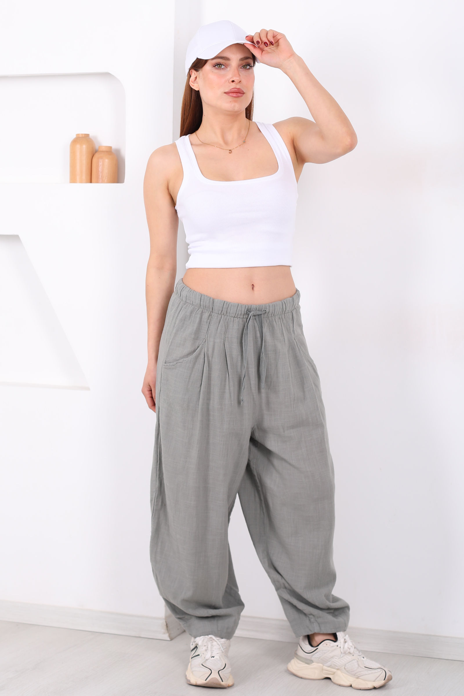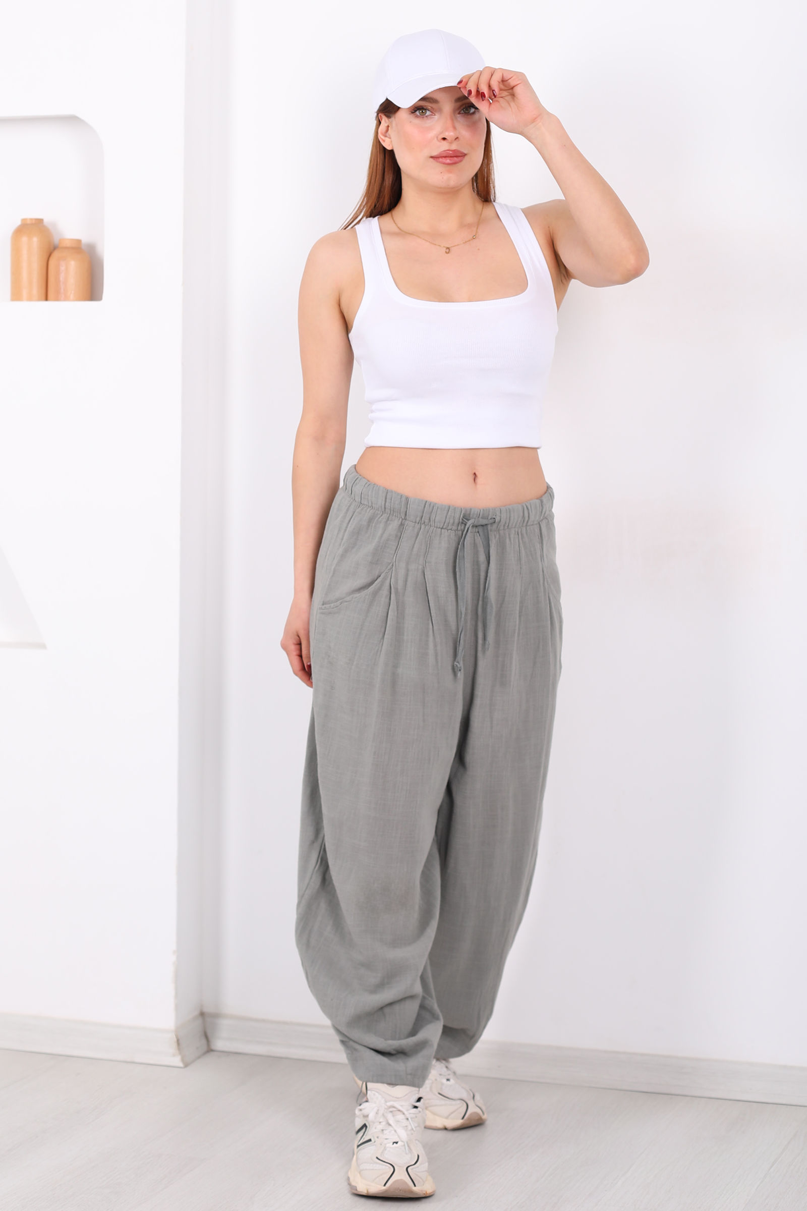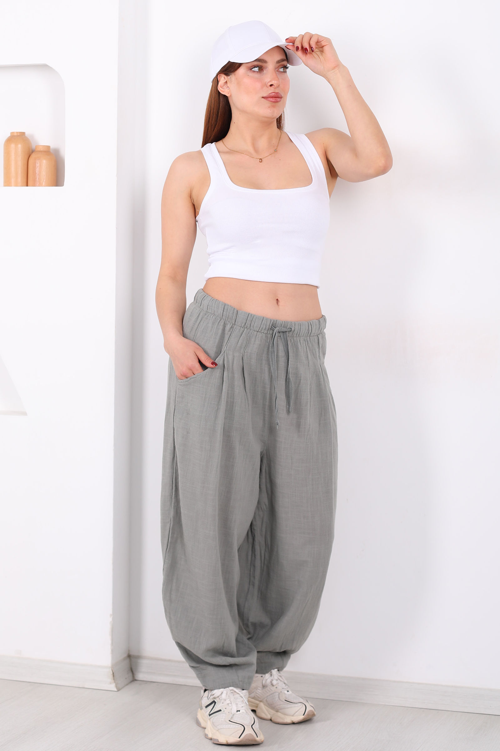 Bol paça formu, hareket halindeyken dahi özgün bir siluet sunar ve pantolona modern bir hava katar. Bel çevresindeki cepler fonksiyonel bir detay yaratırken haki rengin yumuşak tınısı, minimalist tonlarla kombinlerde zarif bir uyum sağlar.
