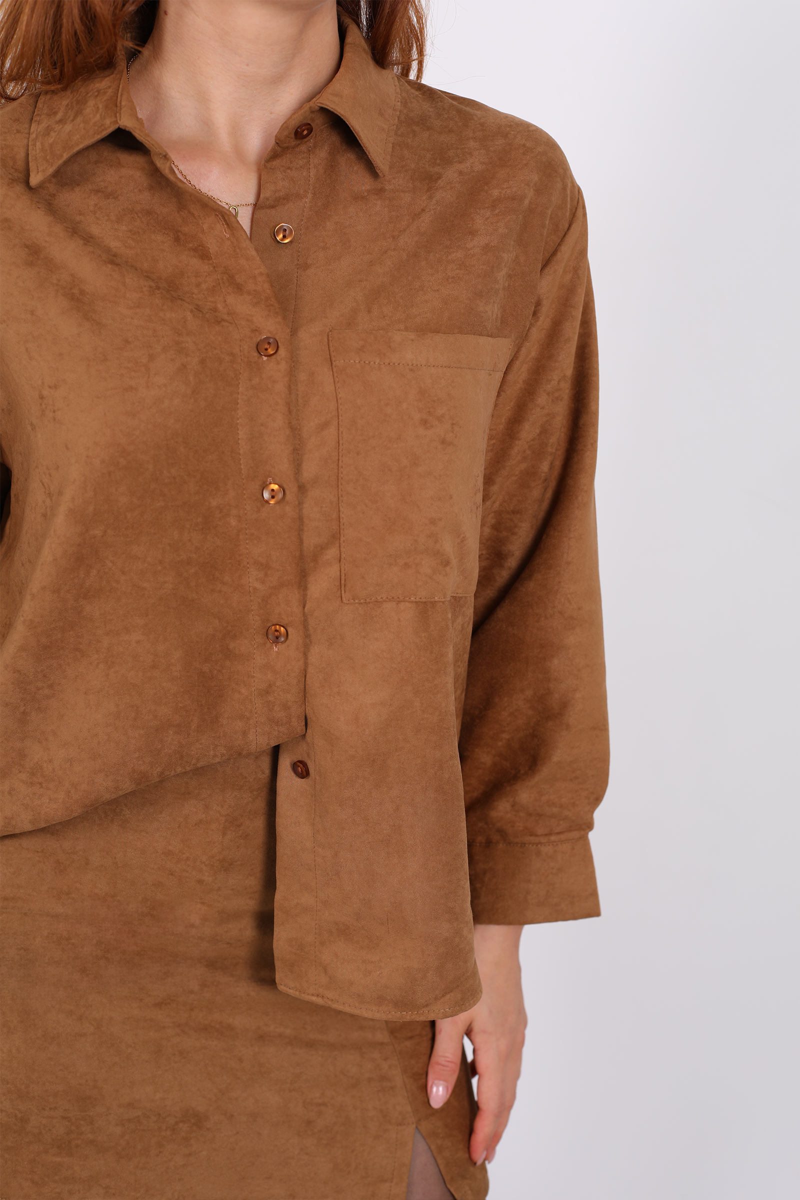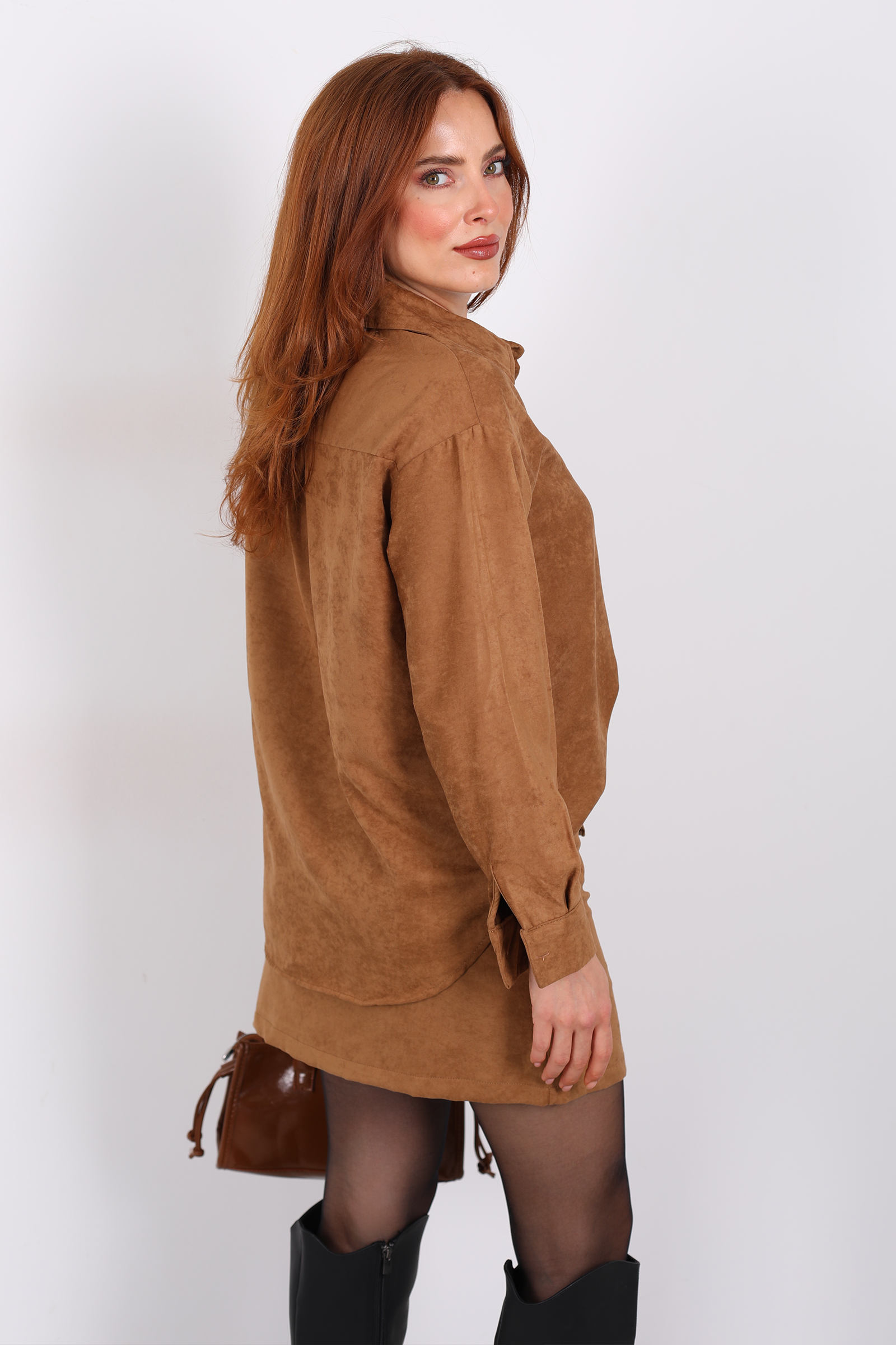 Sıcak taba tonlarıyla dikkat çeken süet kadın gömlek, hem şıklığı hem de rahatlığı bir araya getiriyor. Hafif dokusu ve kadife benzeri yüzeyi sayesinde modern ve sofistike bir görünüm sunarken, cepli tasarımı pratiklik kazandırıyor.Süet kumaşın yumuşak dokusu cilde dost bir his verir ve nefes alabilir yapısı sayesinde gün boyu konfor sağlar. Gömlek, ister tek başına şık bir üst olarak, ister katmanlı kombinlerde hafif bir ceket gibi kullanılabilir. Özellikle kot, kumaş pantolon veya eteklerle kombinlendiğinde stilinizi tamamlar.