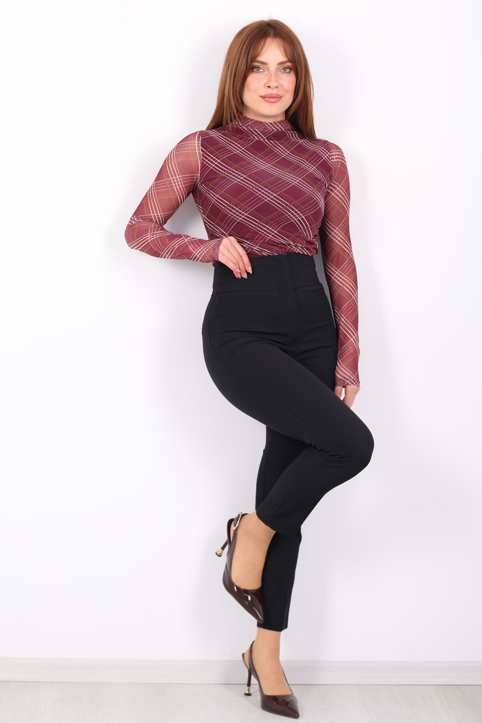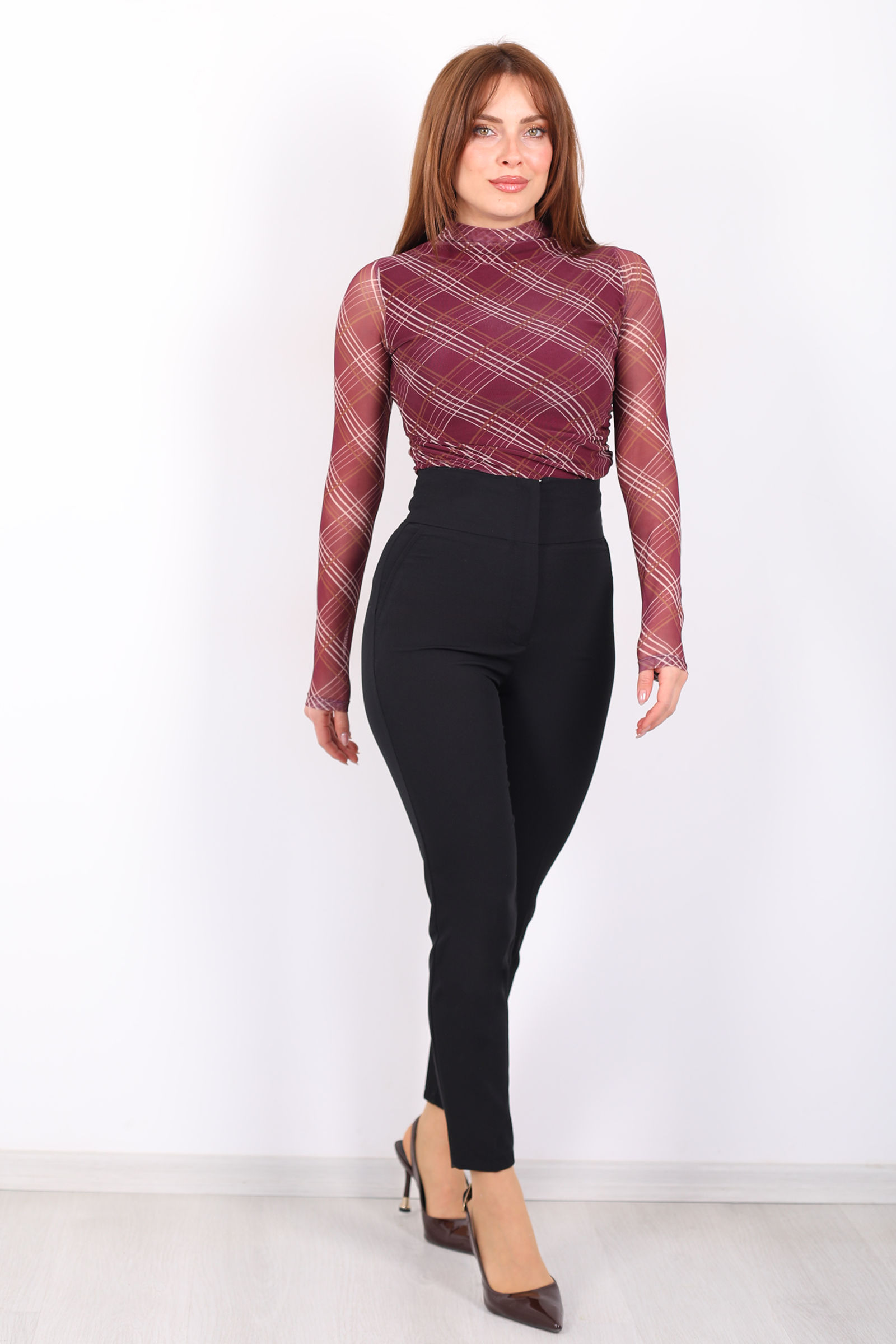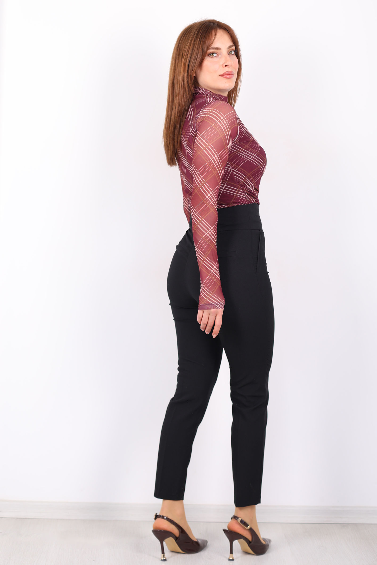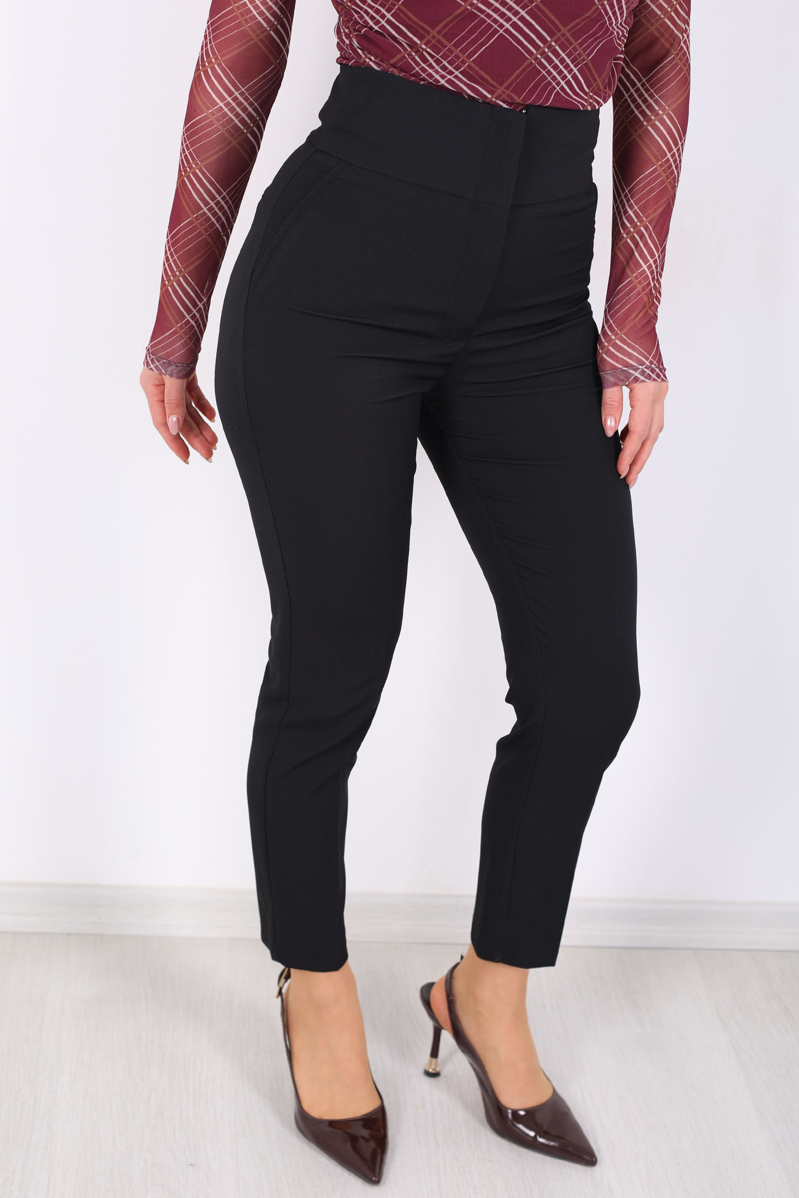 Günlük şıklığınızı tamamlayacak bu siyah kumaş pantolon, cepsiz tasarımıyla sade ve zarif bir görünüm sunuyor. Yüksek bel kesimi, bacak boyunuzu uzun gösterirken, dar paça kesimi modern bir siluet oluşturur. Polyester ve elastan karışımı kumaşı sayesinde esnek ve rahat bir kullanım sağlar.