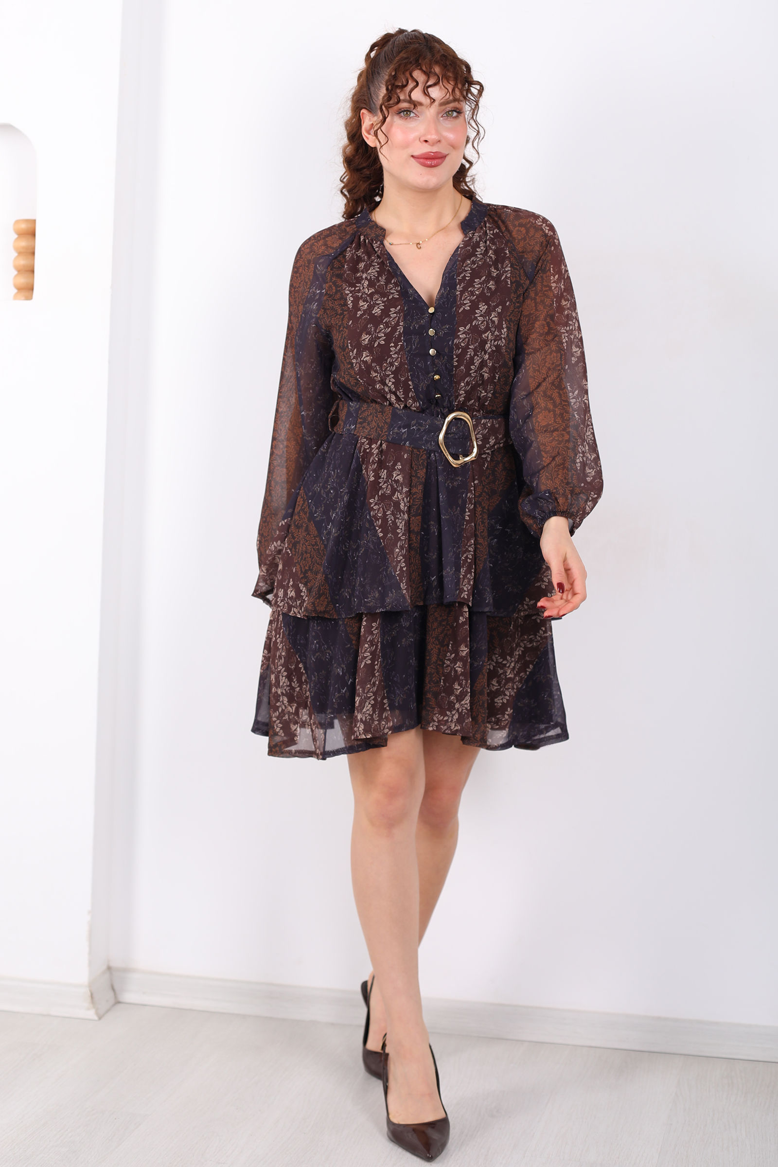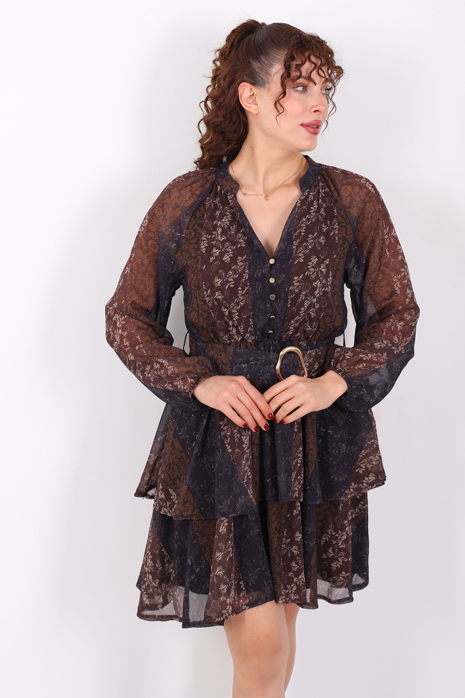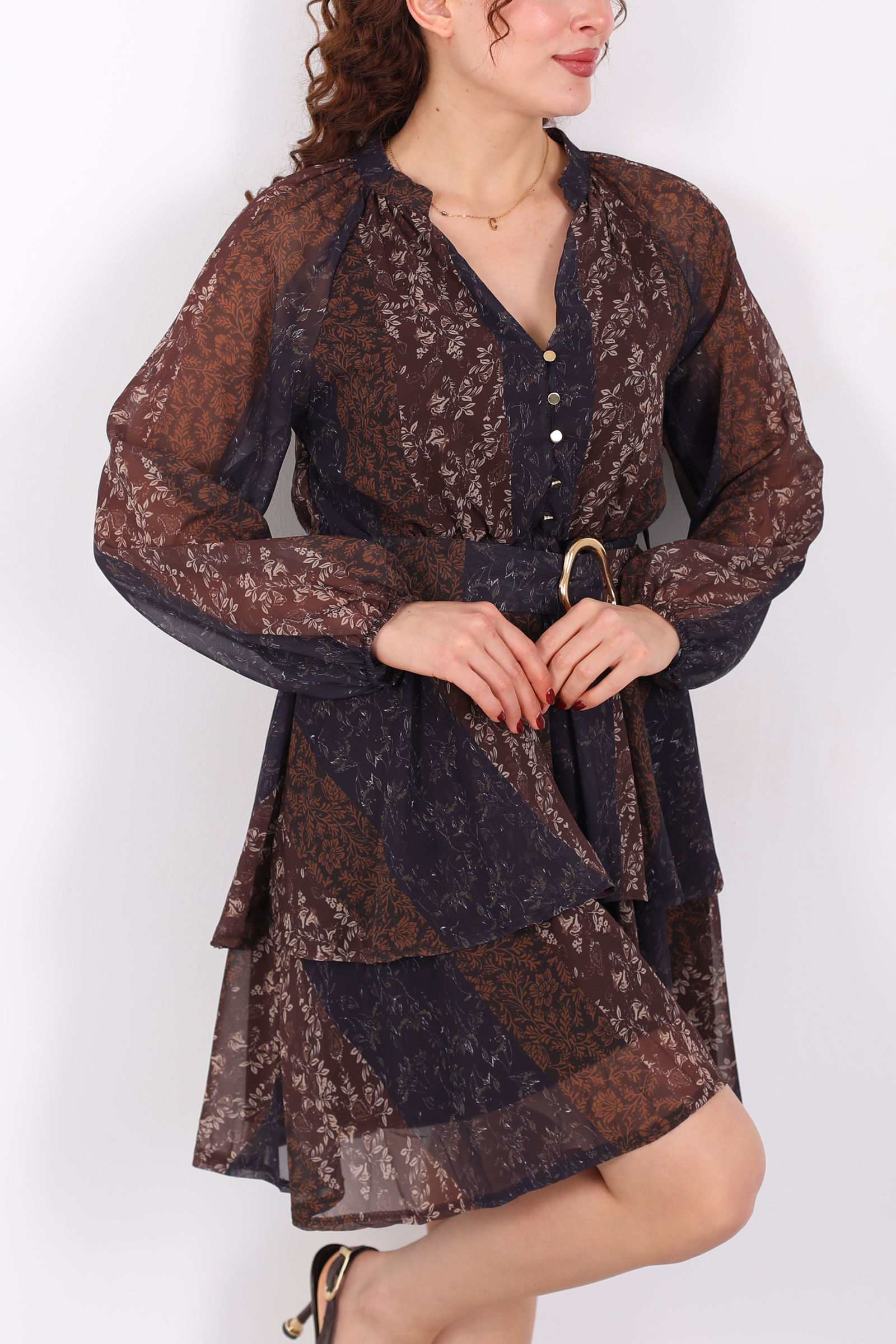 Çiçek Desenli Gold Kemerli Fırfırlı Şifon Kahverengi Kadın Elbise