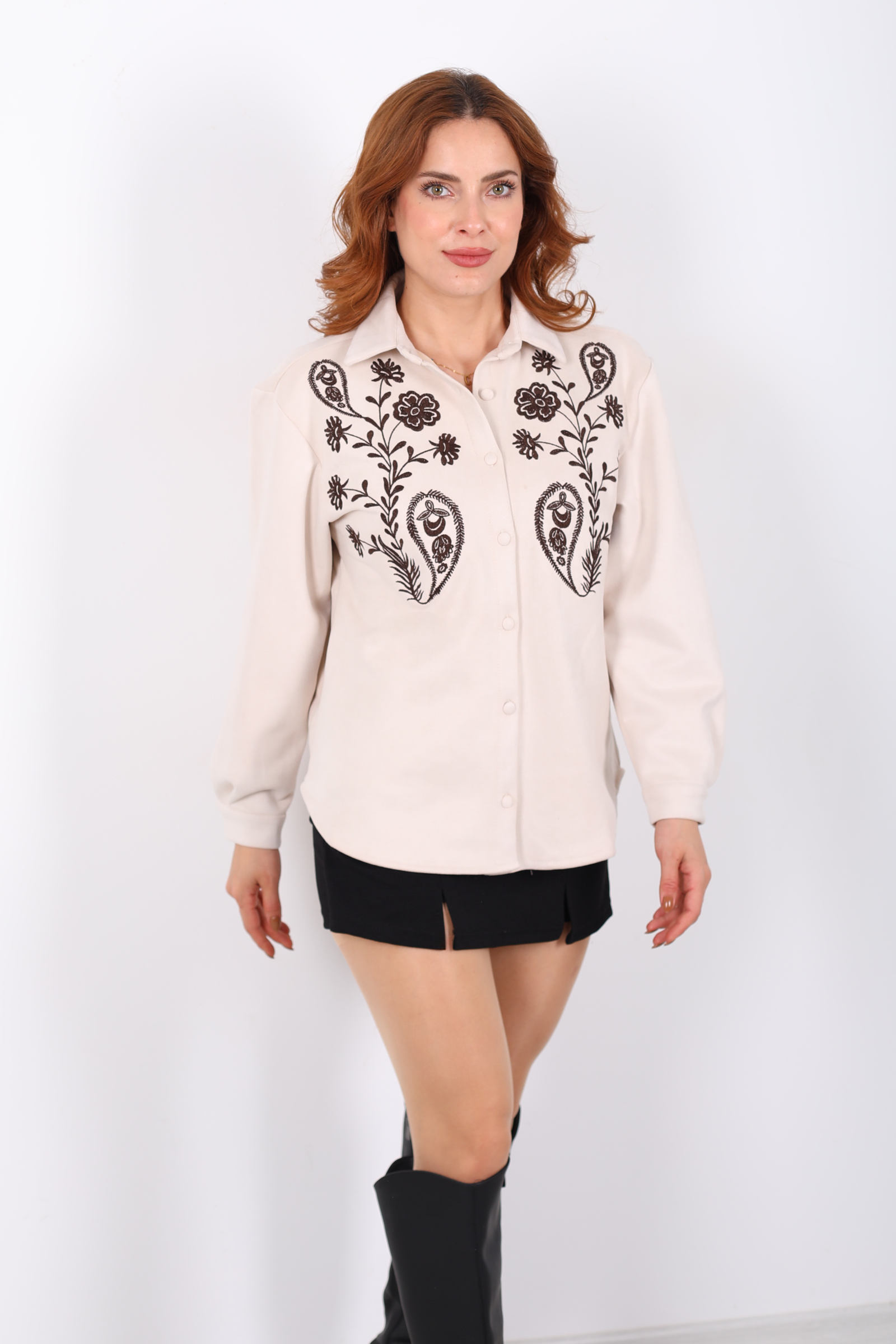 Çiçek Nakışlı Taş Rengi Kadın Süet Gömlek