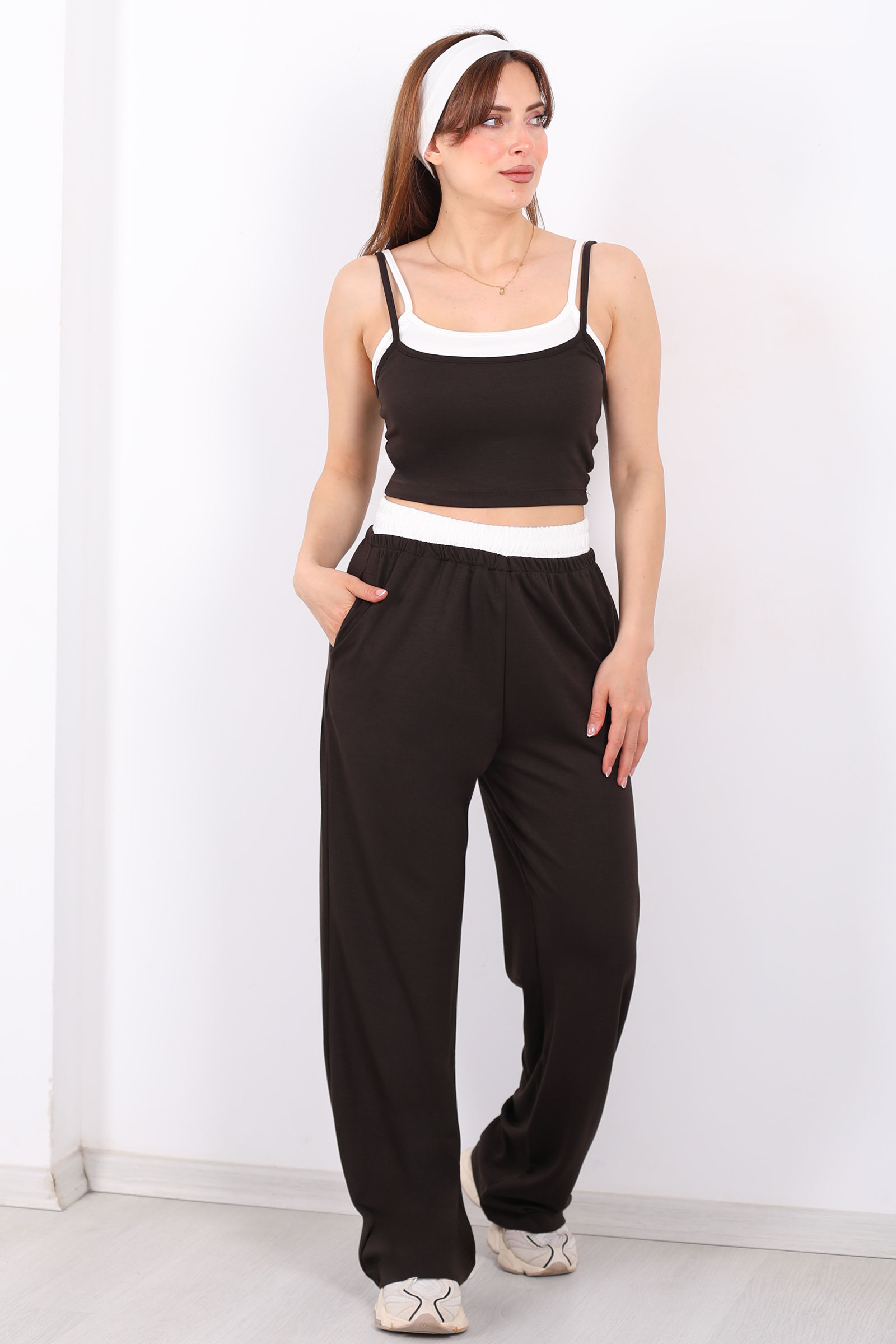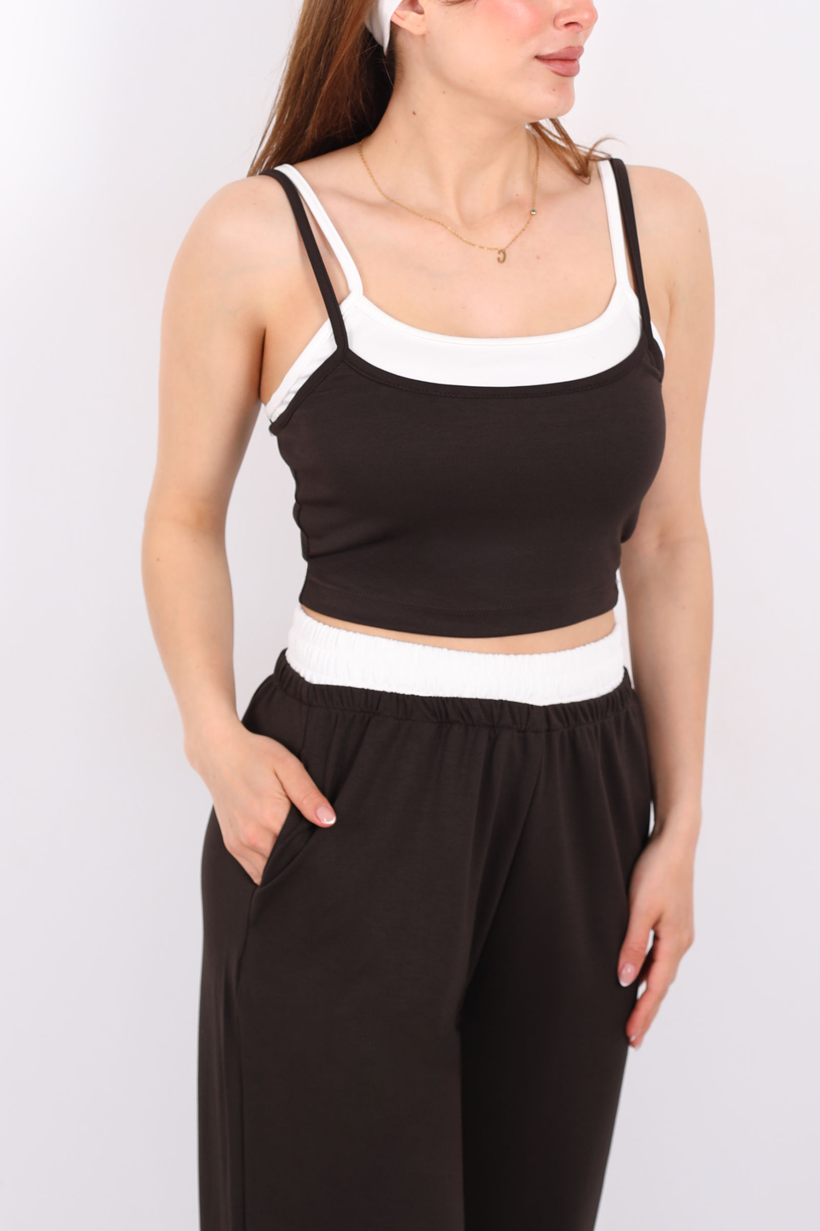 Çift Askılı Kadın Acı Kahve Crop-Pantolon Takım